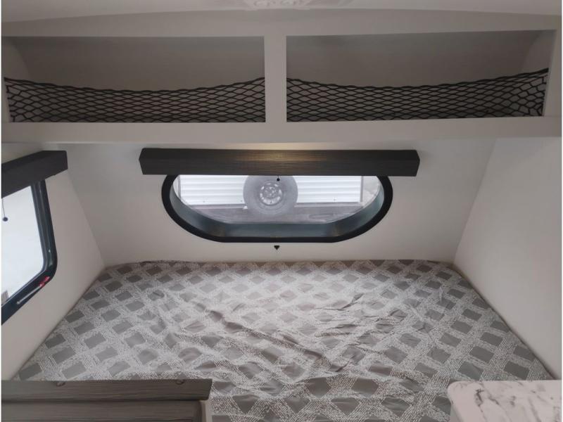 The Remote 14R packs a lot of comfort into a small footprint, starting with the 54" x 80" front bed that gives you true residential-style sleeping space. With storage outside for all your gear, it is an easy trailer for a couple or solo traveler to leave packed and ready for a quick getaway. Mid-coach, the booth dinette gives you a real sit-down spot for meals, card games, or laptop time, and can be used for extra sleeping when you have a guest. An efficient galley keeps everything within reach, and the rear corner bath means you still get your own shower and toilet instead of relying on campground facilities. All together, it feels simple, open, and practical for anyone who wants a lightweight that still feels like a “real” camper inside.