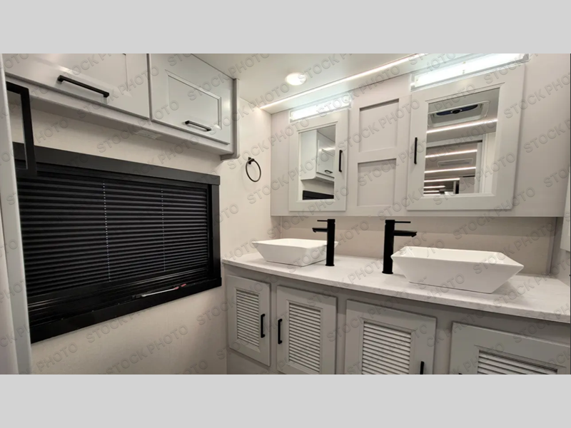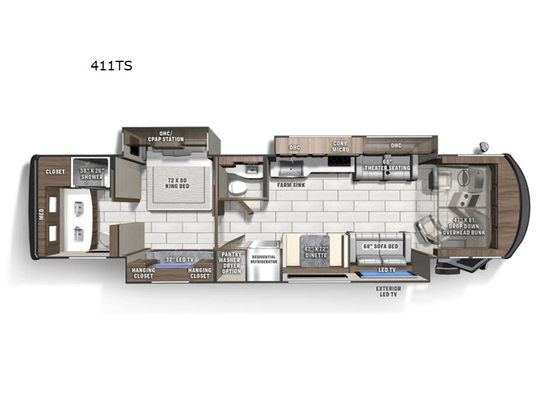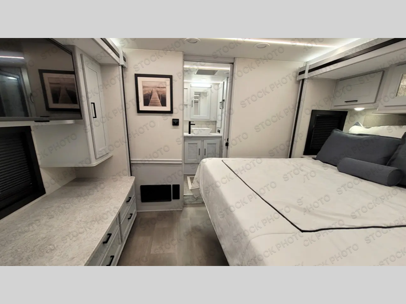 You won't believe all that this motorhome has to offer! Starting with the full rear bathroom which has a 38" x 26" shower to clean up in, a linen closet, and dual bath sinks, plus it leads directly into the master suite. Here you will find a king bed slide with a CPAP station above it and across from a dresser with hanging closets on either side and a 32" LED TV to watch your movies in true relaxation. The convenient half bathroom is centrally located so guests can easily use it when needed, and there is a pantry with a washer/dryer option if you choose to add those appliances. At night, you can either relax on the 68" sofa or the theater seating across from the 65" LED TV, and if you need more sleeping space, the drop-down overhead bunk is sure to be a big hit