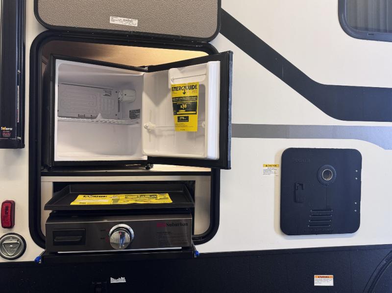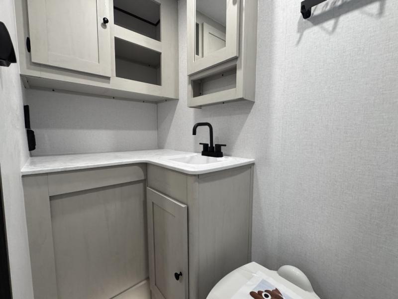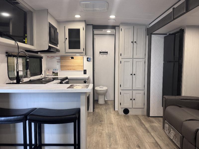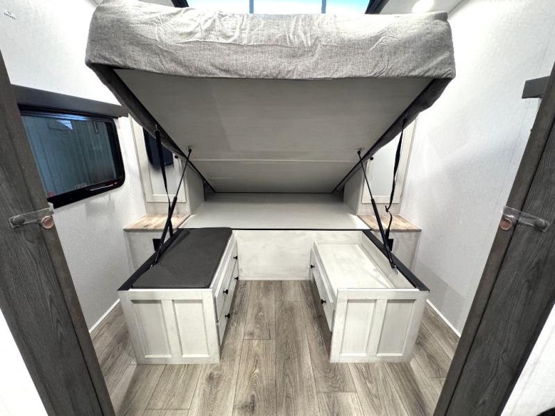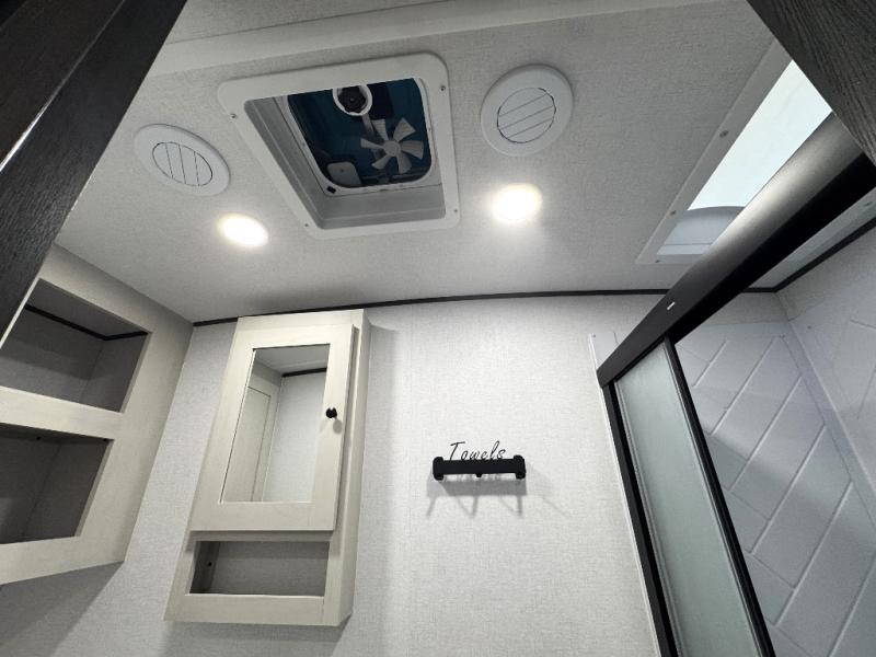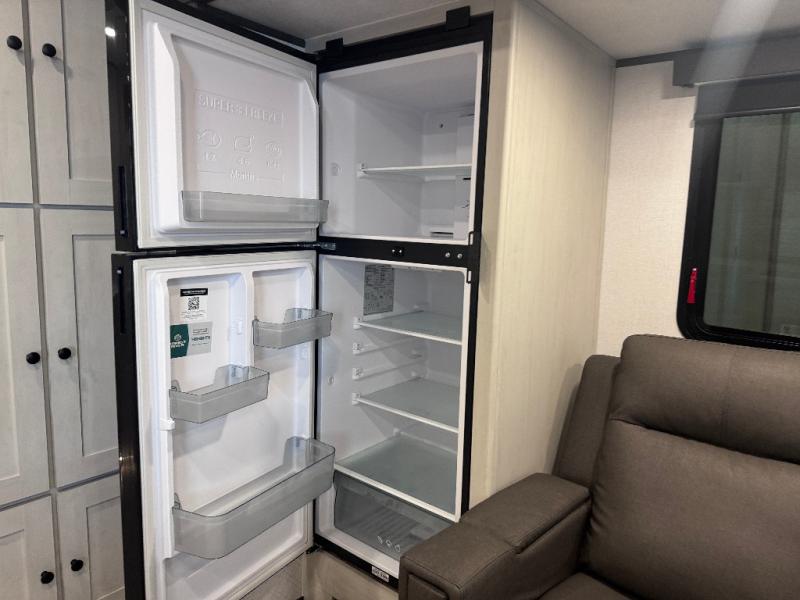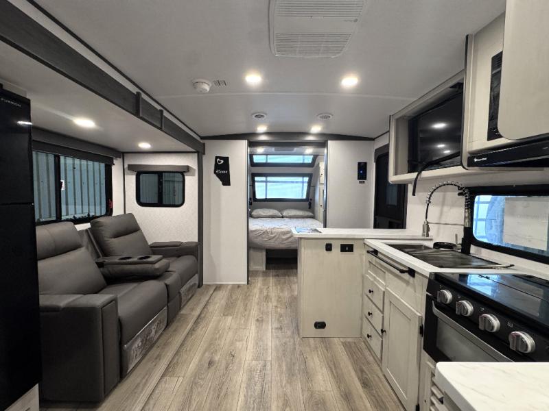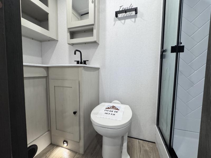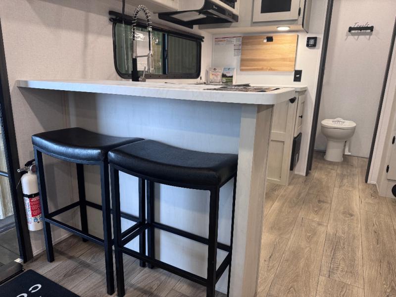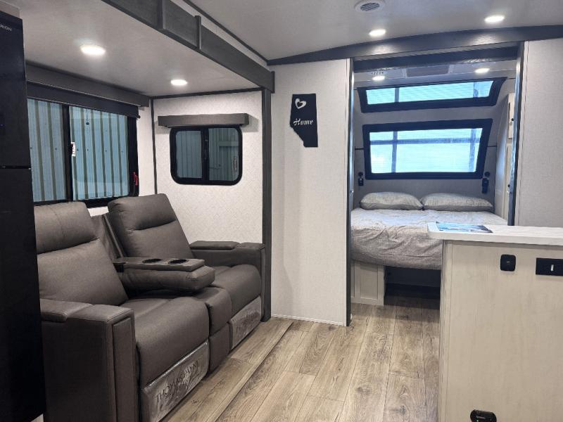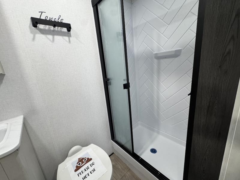 This travel trailer is the perfect match for a couple. It offers comfort and space thanks to the queen size bed with storage below, dual wardrobes and night stands beside the bed. Spend days of fun with the entertainment center which has a 40"TV and theater seats. Also, the rear bathroom is perfect to take a shower after a long day of adventures.