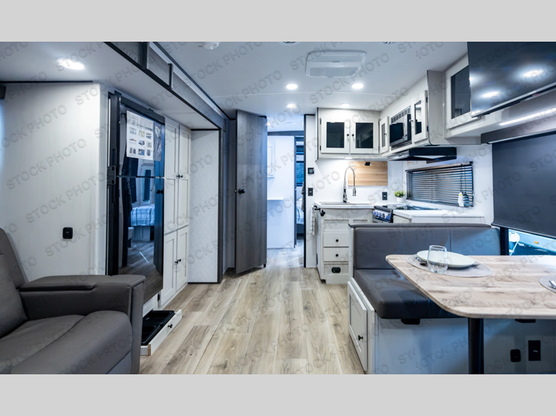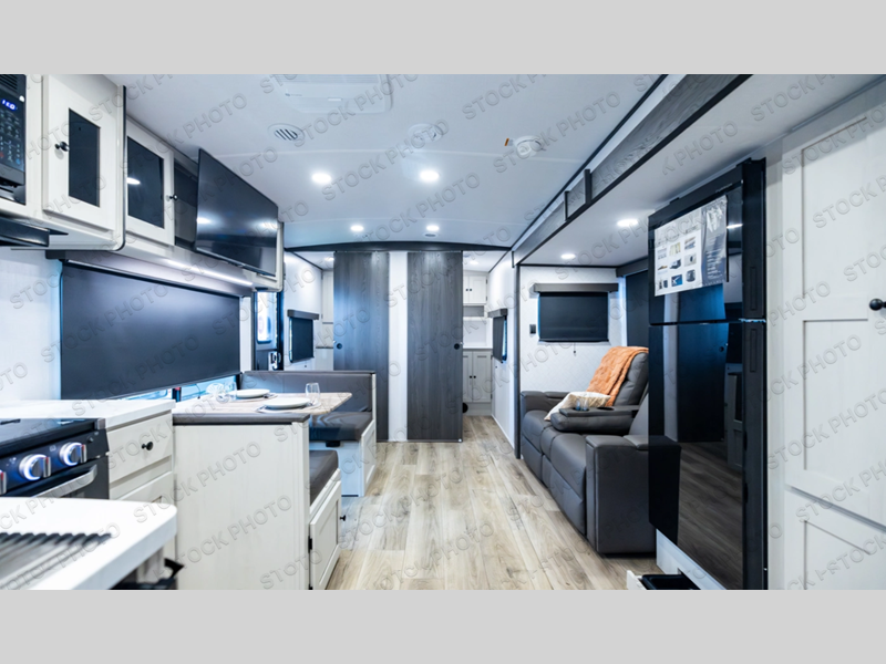 The private upper and lower bunk area provides a cozy sleeping space for kids, complete with plenty of storage for their belongings. The living area features a comfortable 64” sofa and a booth dinette perfect for family meals or game nights. The entertainment center provides endless hours of fun, while the refrigerator and pantry keep snacks and drinks within easy reach. The kitchen is equipped with a three-burner range, perfect for preparing meals for the whole family. The walk-through bathroom features a towel bar and is a practical and convenient space for getting ready in the morning or freshening up at night. Plus, ample storage and a comfortable sleeping area make the front private bedroom the perfect place to rest and relax. The outside kitchen is the perfect spot for outdoor cooking and entertaining, allowing you to enjoy the fresh air and scenery while preparing meals.