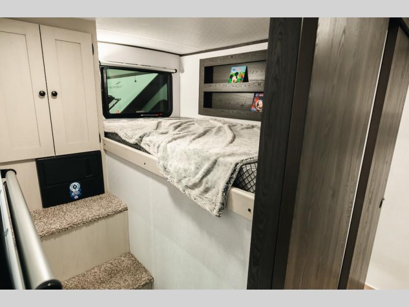 The private upper and lower bunk area provides a cozy sleeping space for kids, complete with plenty of storage for their belongings. The living area features a comfortable 64” sofa and a booth dinette perfect for family meals or game nights. The entertainment center provides endless hours of fun, while the refrigerator and pantry keep snacks and drinks within easy reach. The kitchen is equipped with a three-burner range, perfect for preparing meals for the whole family. The walk-through bathroom features a towel bar and is a practical and convenient space for getting ready in the morning or freshening up at night. Plus, ample storage and a comfortable sleeping area make the front private bedroom the perfect place to rest and relax. The outside kitchen is the perfect spot for outdoor cooking and entertaining, allowing you to enjoy the fresh air and scenery while preparing meals.