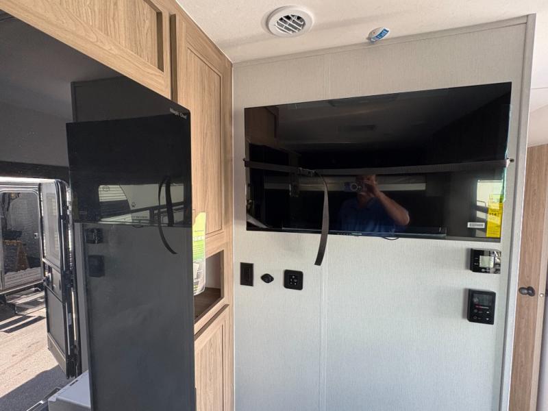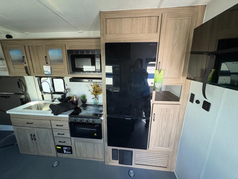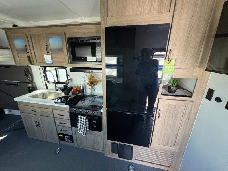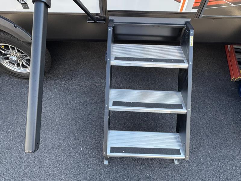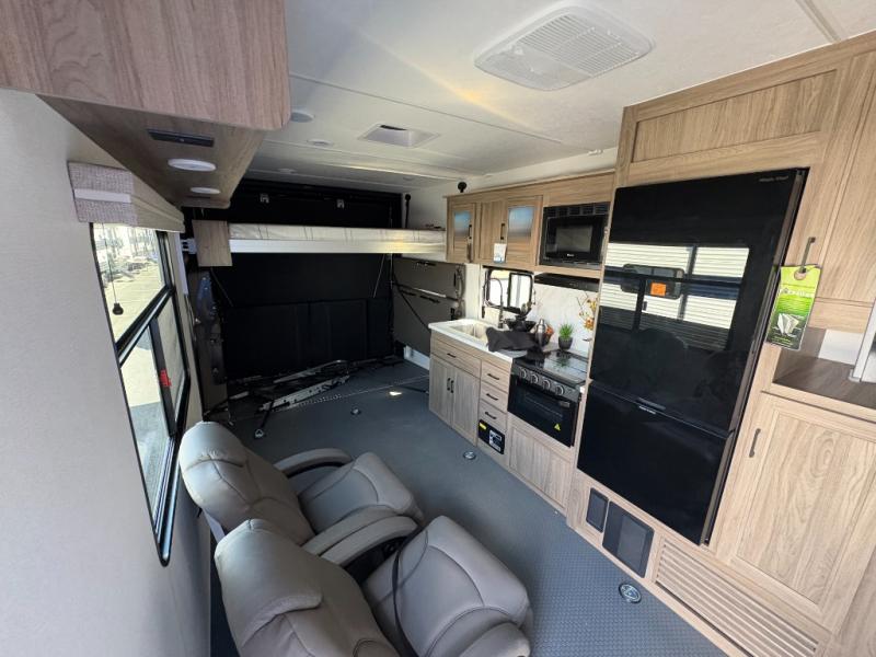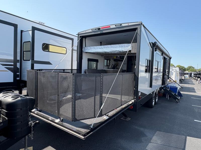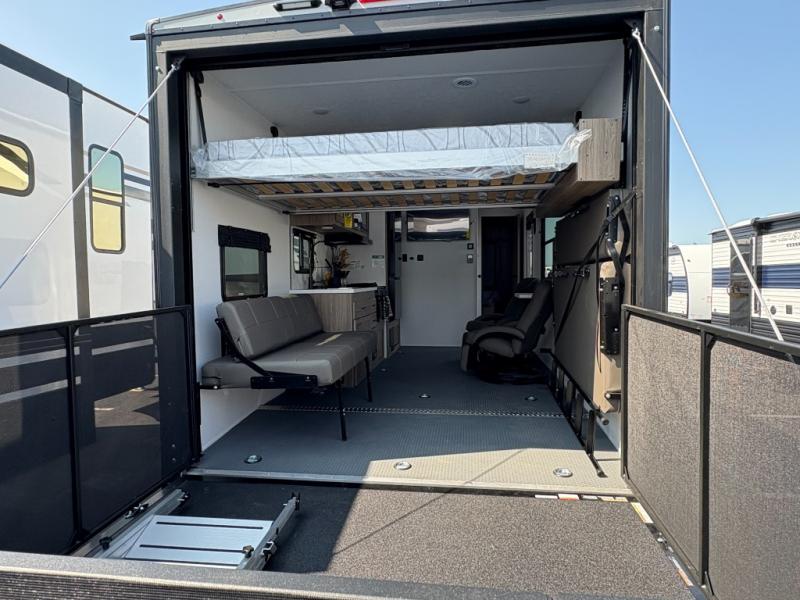 Load up everyone and your motorcycles, bicycles, or off-road toys to enjoy some trail rides and overnight accommodations! You will find sleeping space for six people thanks to the electric queen bed with dual roll-over sofas underneath in the garage, and the walk-around king bed in the front master bedroom. You can keep your toys fueled and ready to go with the 30 gallon fuel station and the zero gravity ramp door will allow for easy loading and unloading. This travel trailer toy hauler includes all the kitchen appliances to create meals each day and the dual entry bath is accessible from the front master bedroom and the hallway for your guests. You will also find a rear pull down screen, pull-down roller night shades to be able to sleep in late, and a 300W Solar Panel with MPPT control charger to help you stay off-grid.