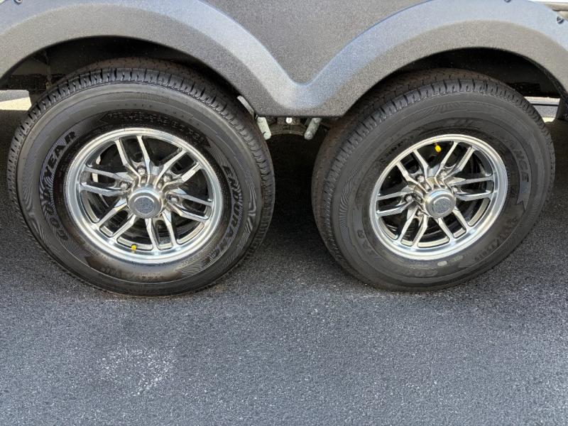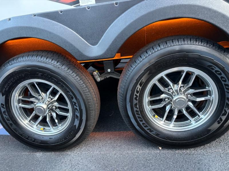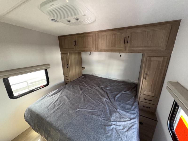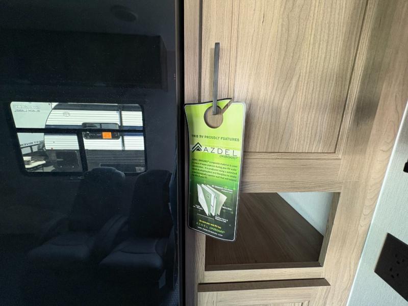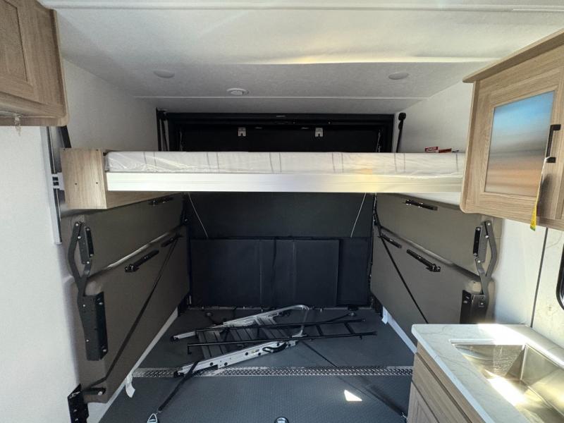 With any WORK AND PLAY toy hauler travel trailer by Coachmen, the required Exterior Value package includes a one-piece Dicor Tufflex PVC roof membrane, a fiberglass front cap with rock guard to help against road debris, heavy duty Dexter axles, tinted safety glass windows, and aluminum wheels. Some exterior standards include a heated and enclosed underbelly, a patio ready ramp door with cables for an outdoor above ground space to enjoy, a power tongue jack for easy setup, and an outside spray port to clean off your toys. The interior standards include HD rubberized oil/gas/moisture resistant flooring in the garage area, hidden hinge cabinets and doors, indoor/outdoor Bluetooth speakers, and USB charging ports in multiple locations for your electronics to mention a few.