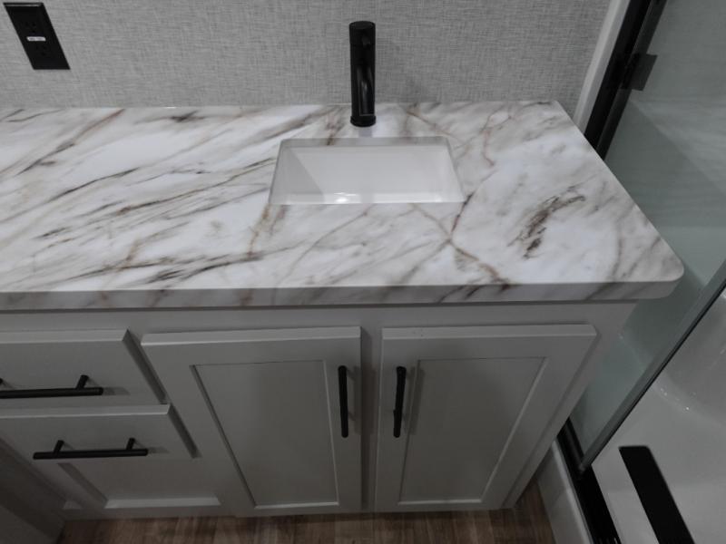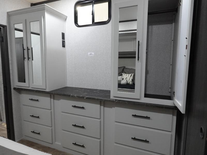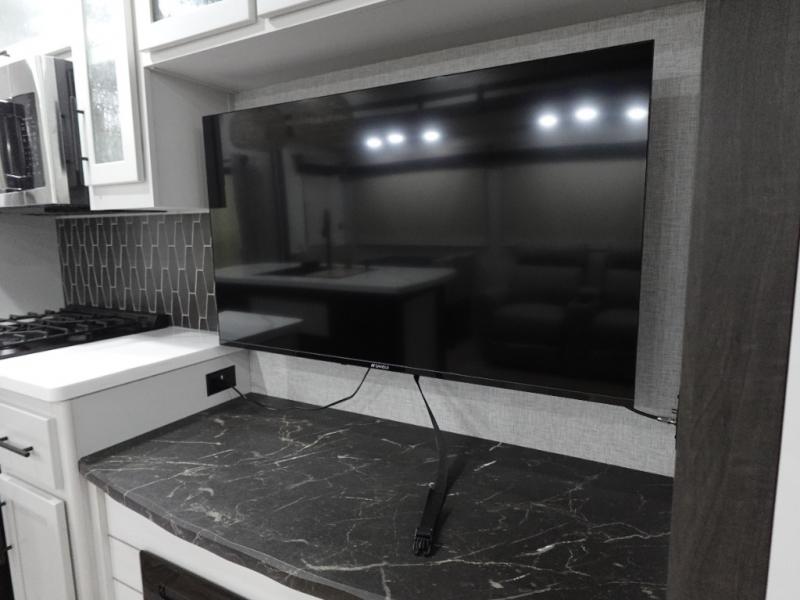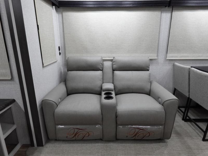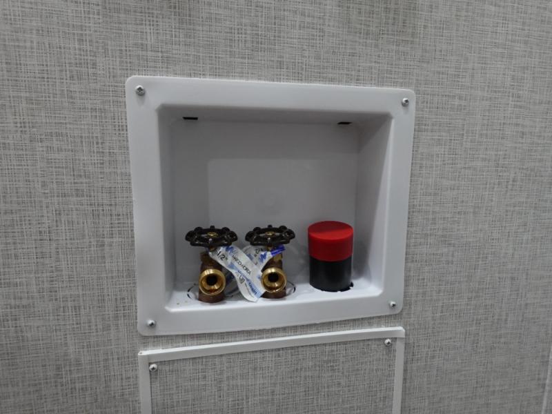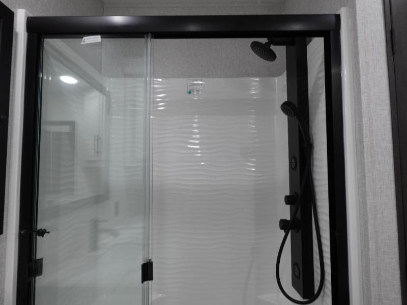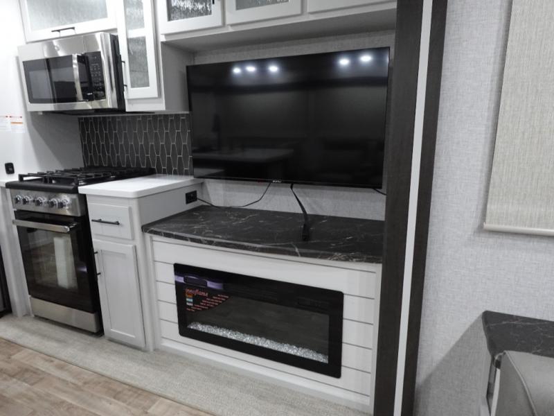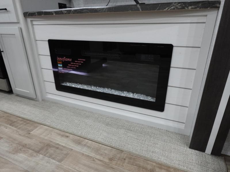 Get away to your own master suite at your favorite destination today! You can sleep on the king bed slide out with plenty of storage for your clothes on the opposite side and get cleaned up in the full bathroom in the 48" shower. There are even dual bath sinks so you both can brush your teeth at the same time. There is also a space that has been prepped for an optional washer/dryer if you like. An added convenience is the centrally located half bath across from the patio doors for easy entry and exit. The front living area provides a sofa that can double as sleeping space for your kids or overnight guests, and the theater seats allow you to clearly see the 50" lift TV with fireplace below. The cook will love the kitchen island, hutch, and pantry with a shelf, as well as the appliances. Dining or even doing a little work will be comfortable while seated at the free standing table with chairs and bench seating.