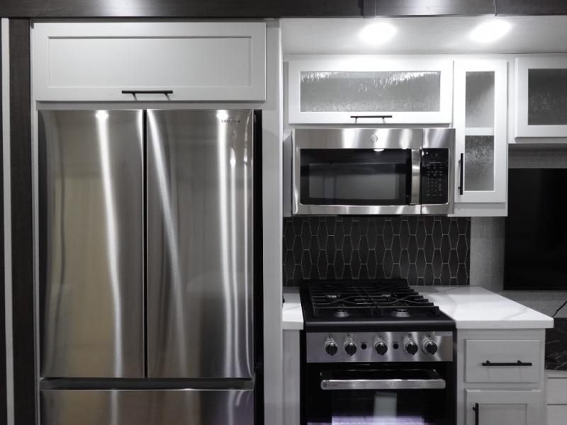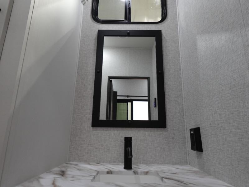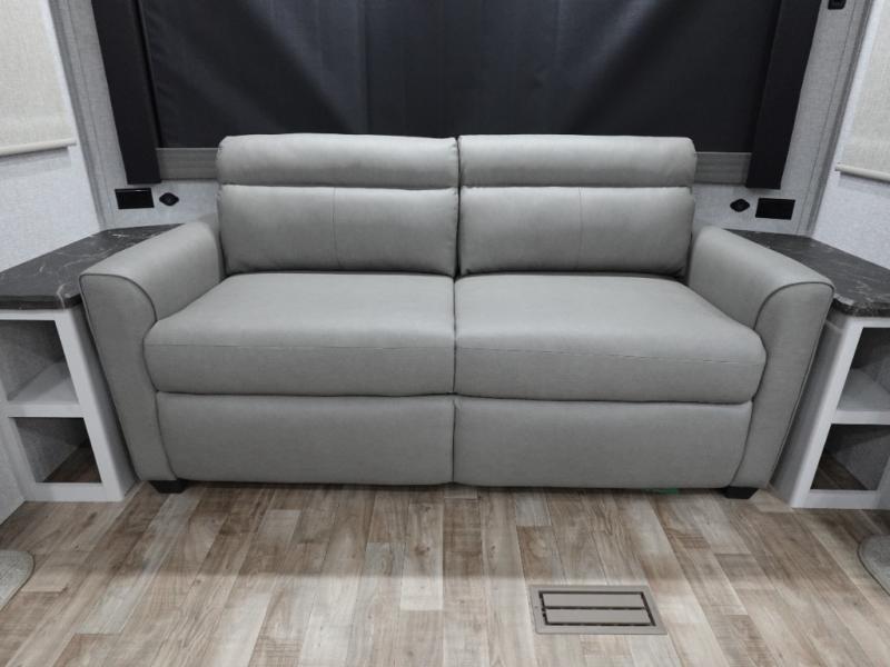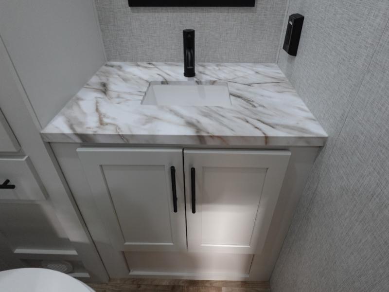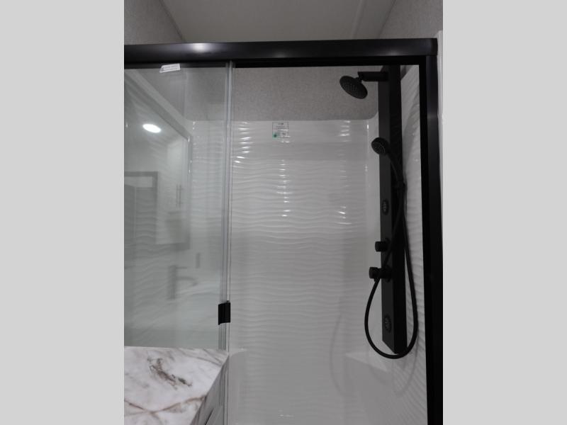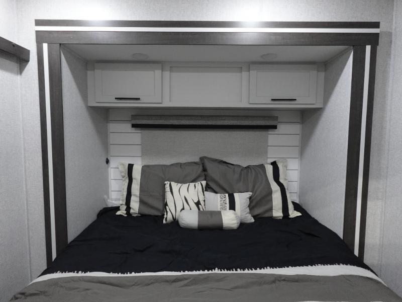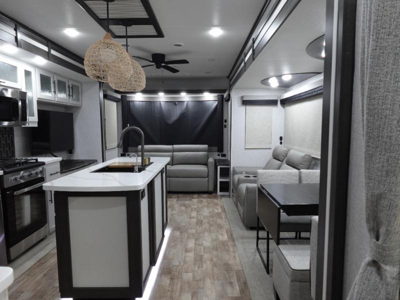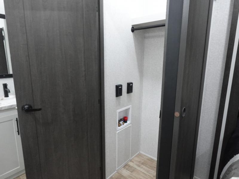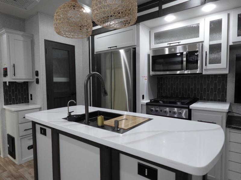 Get away to your own master suite at your favorite destination today! You can sleep on the king bed slide out with plenty of storage for your clothes on the opposite side and get cleaned up in the full bathroom in the 48" shower. There are even dual bath sinks so you both can brush your teeth at the same time. There is also a space that has been prepped for an optional washer/dryer if you like. An added convenience is the centrally located half bath across from the patio doors for easy entry and exit. The front living area provides a sofa that can double as sleeping space for your kids or overnight guests, and the theater seats allow you to clearly see the 50" lift TV with fireplace below. The cook will love the kitchen island, hutch, and pantry with a shelf, as well as the appliances. Dining or even doing a little work will be comfortable while seated at the free standing table with chairs and bench seating.