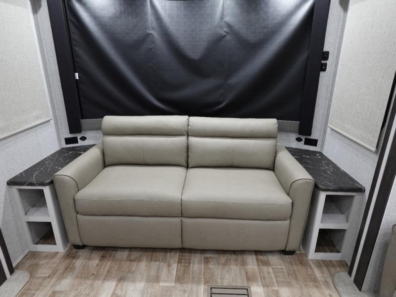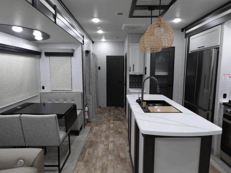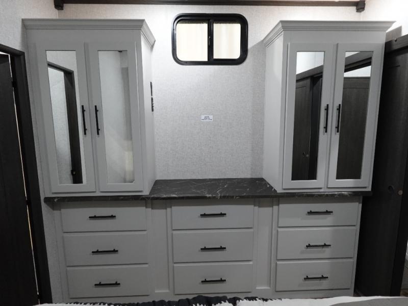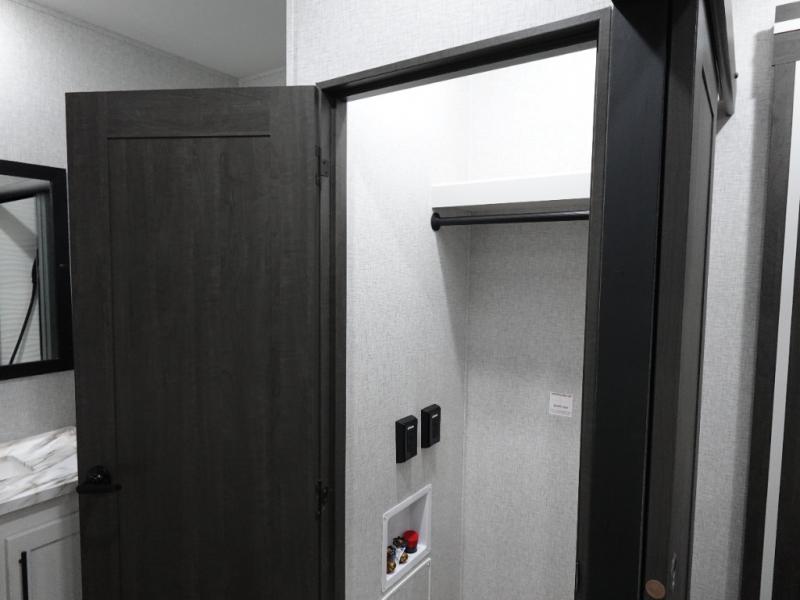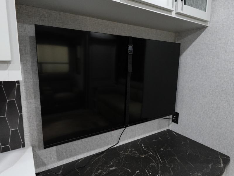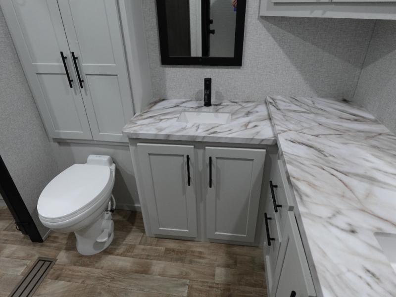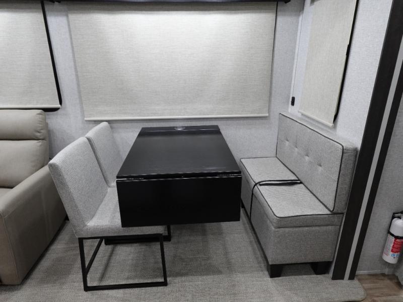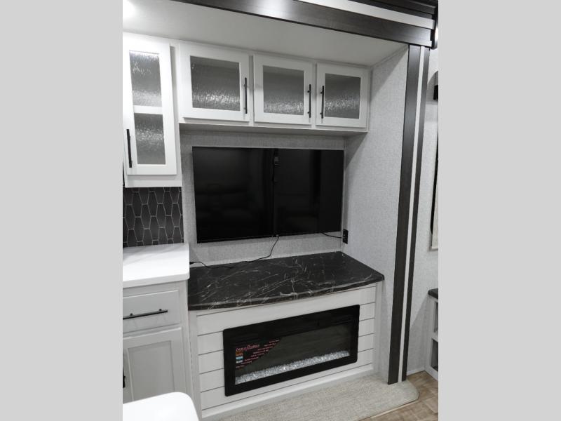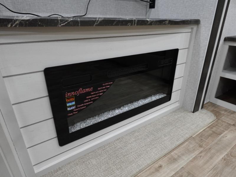 Get away to your own master suite at your favorite destination today! You can sleep on the king bed slide out with plenty of storage for your clothes on the opposite side and get cleaned up in the full bathroom in the 48" shower. There are even dual bath sinks so you both can brush your teeth at the same time. There is also a space that has been prepped for a washer/dryer if you like. An added convenience is the centrally located half bath across from the patio doors for easy entry and exit. The front living area provides a sofa that can double as sleeping space for your kids or overnight guests, and the theater seats allow you to clearly see the 50" lift TV with fireplace below. The cook will love the kitchen island, hutch, and pantry with a shelf, as well as the appliances. Dining or even doing a little work will be comfortable while seated at the free standing table with chairs and bench seating.