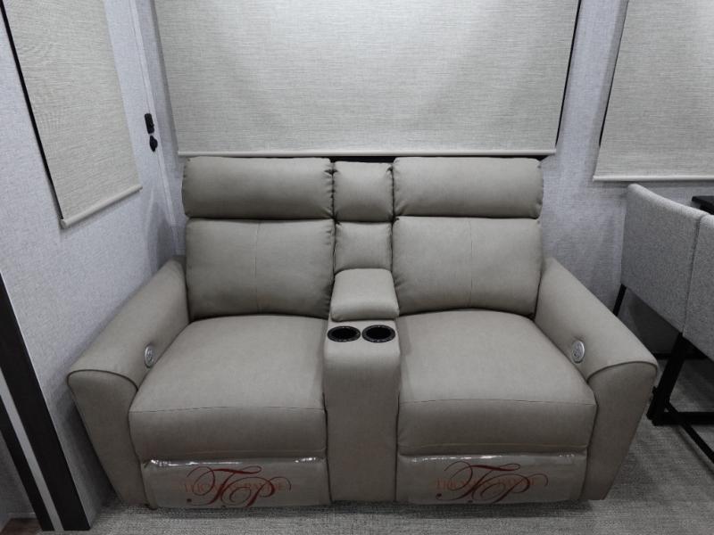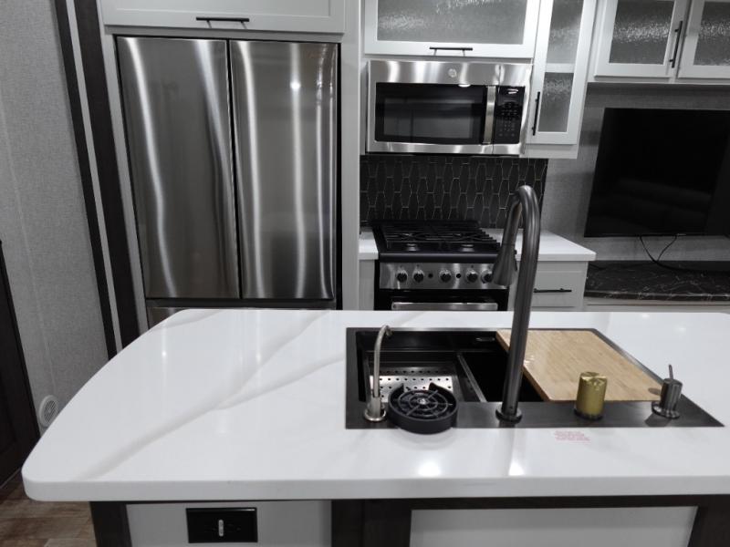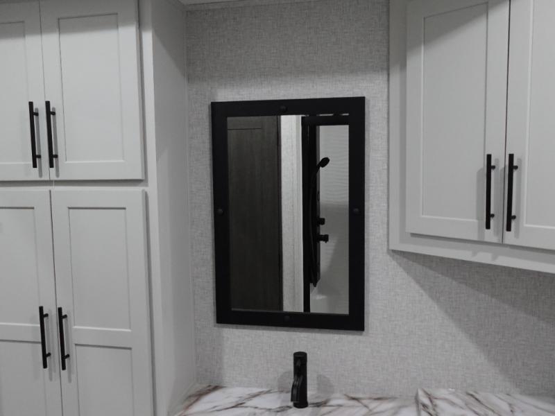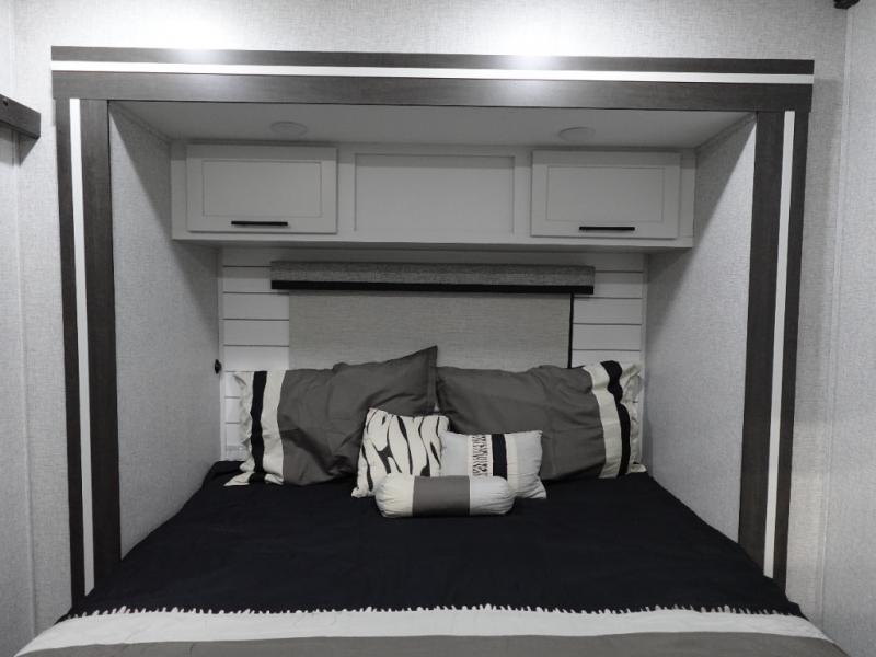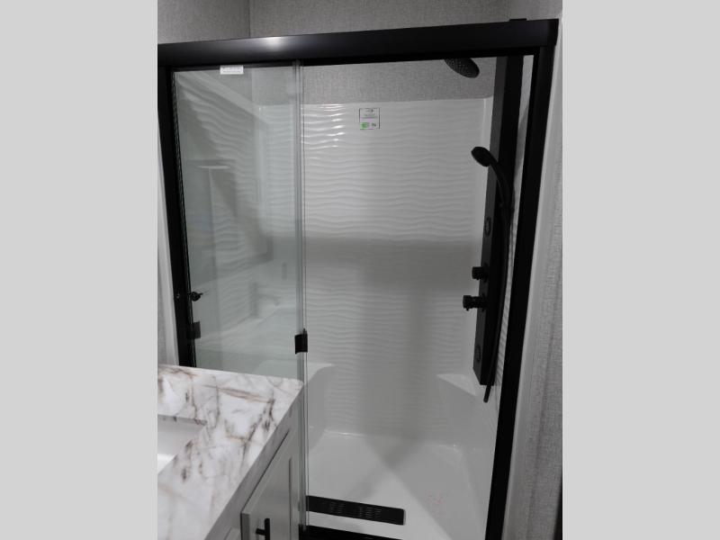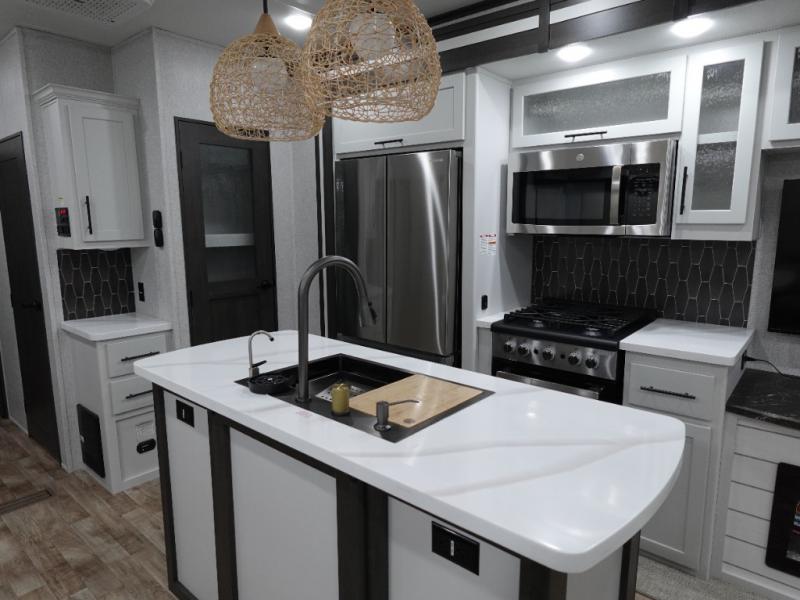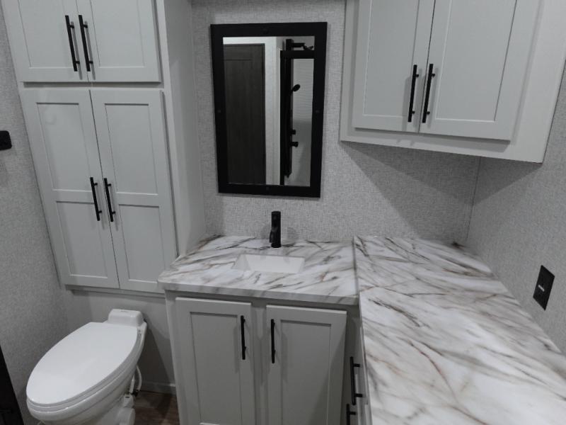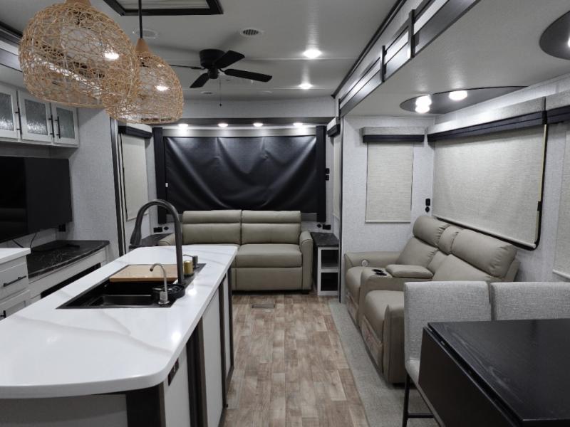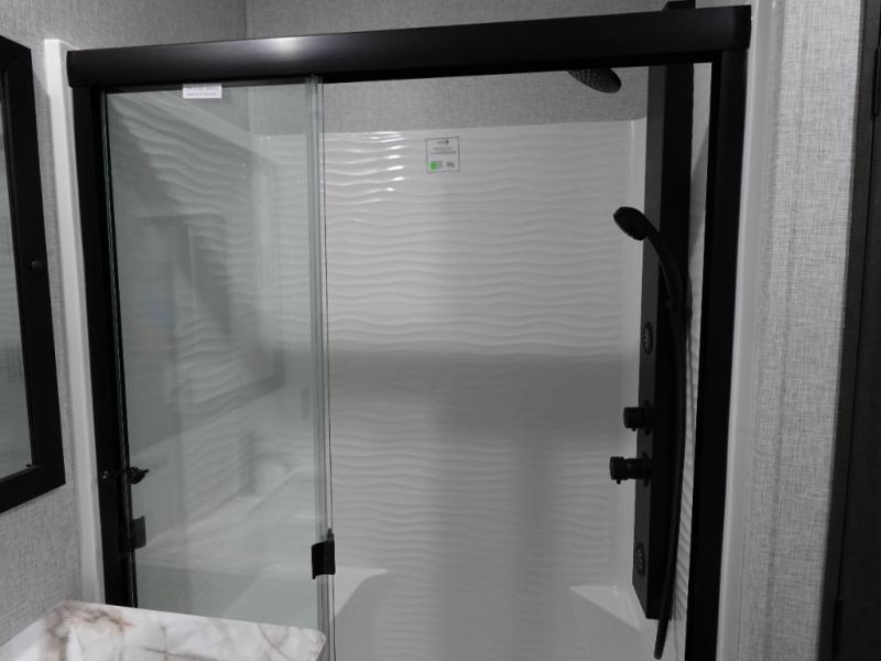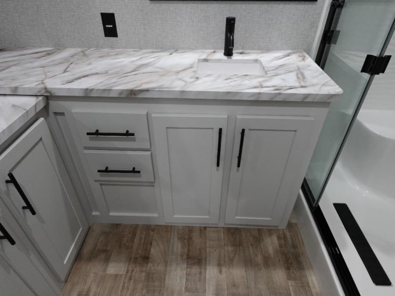 Get away to your own master suite at your favorite destination today! You can sleep on the king bed slide out with plenty of storage for your clothes on the opposite side and get cleaned up in the full bathroom in the 48" shower. There are even dual bath sinks so you both can brush your teeth at the same time. There is also a space that has been prepped for a washer/dryer if you like. An added convenience is the centrally located half bath across from the patio doors for easy entry and exit. The front living area provides a sofa that can double as sleeping space for your kids or overnight guests, and the theater seats allow you to clearly see the 50" lift TV with fireplace below. The cook will love the kitchen island, hutch, and pantry with a shelf, as well as the appliances. Dining or even doing a little work will be comfortable while seated at the free standing table with chairs and bench seating.