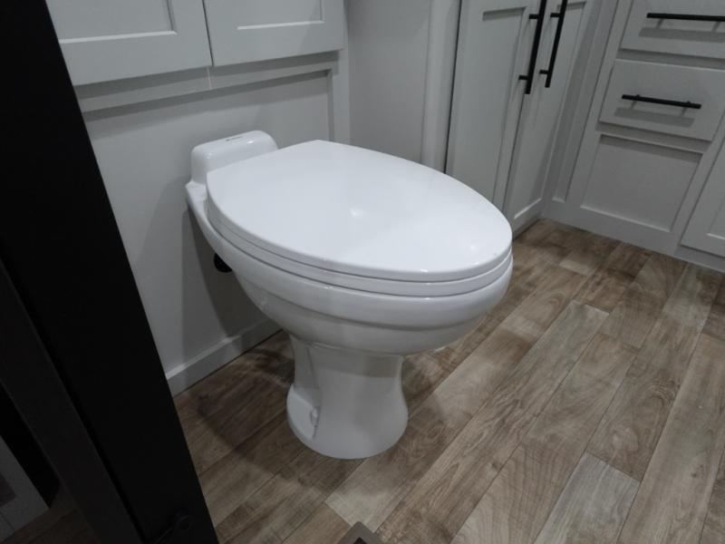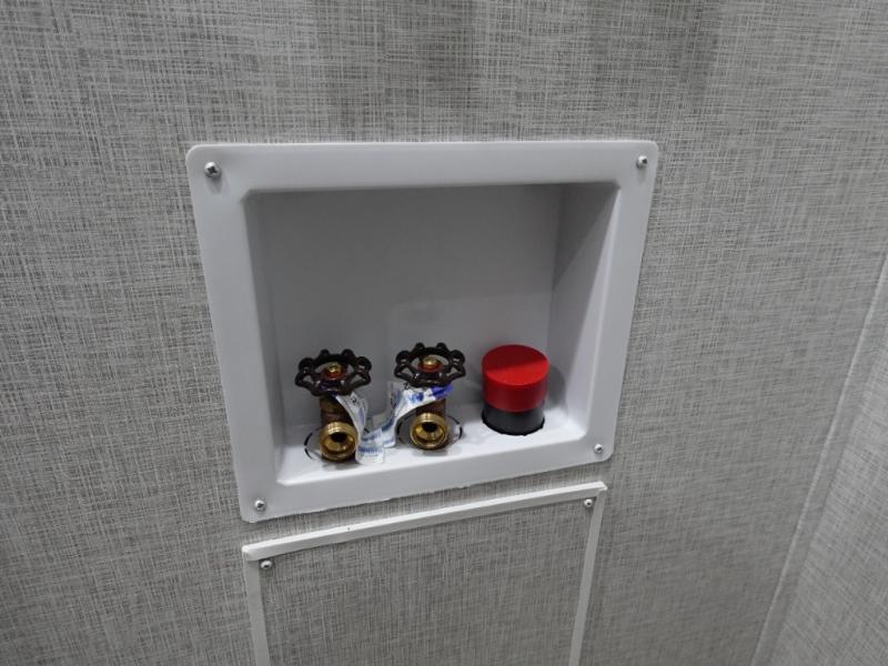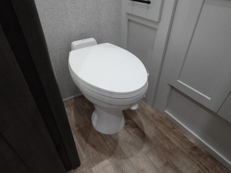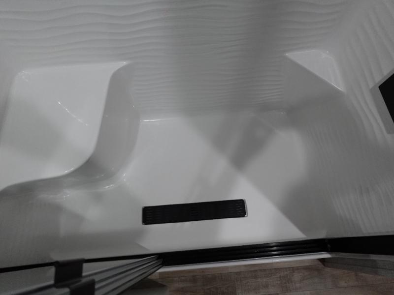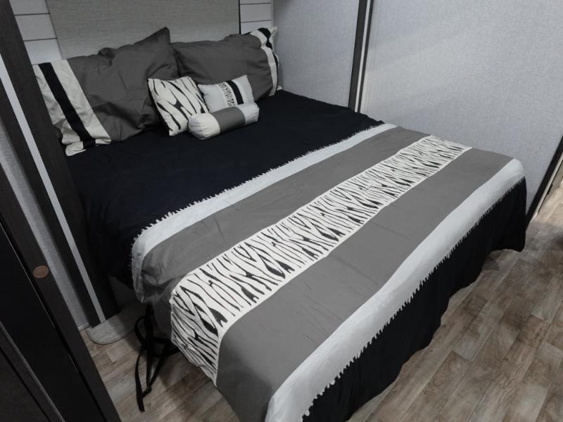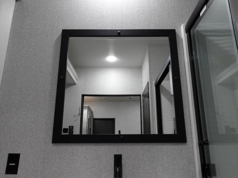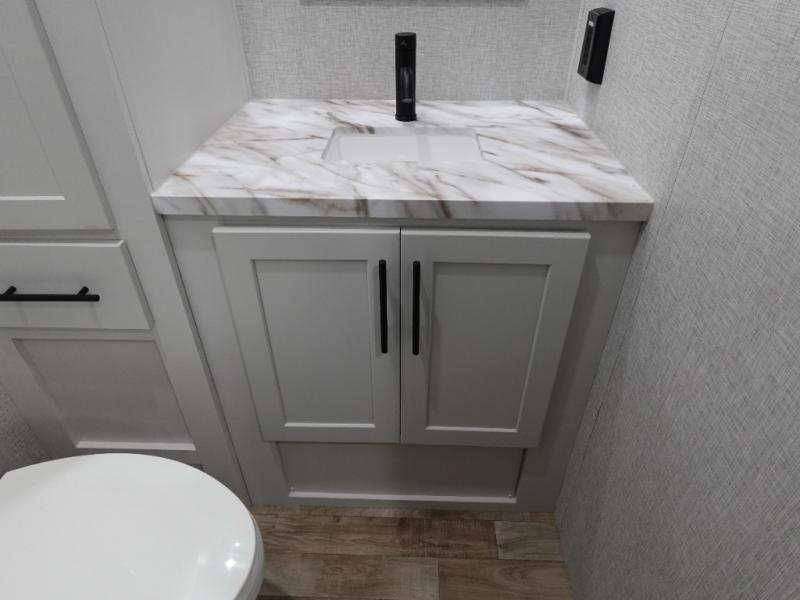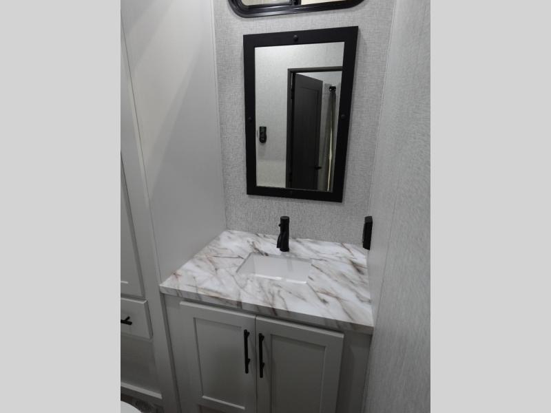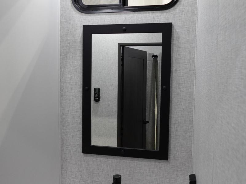 Get away to your own master suite at your favorite destination today! You can sleep on the king bed slide out with plenty of storage for your clothes on the opposite side and get cleaned up in the full bathroom in the 48" shower. There are even dual bath sinks so you both can brush your teeth at the same time. There is also a space that has been prepped for a washer/dryer if you like. An added convenience is the centrally located half bath across from the patio doors for easy entry and exit. The front living area provides a sofa that can double as sleeping space for your kids or overnight guests, and the theater seats allow you to clearly see the 50" lift TV with fireplace below. The cook will love the kitchen island, hutch, and pantry with a shelf, as well as the appliances. Dining or even doing a little work will be comfortable while seated at the free standing table with chairs and bench seating.
