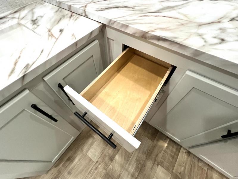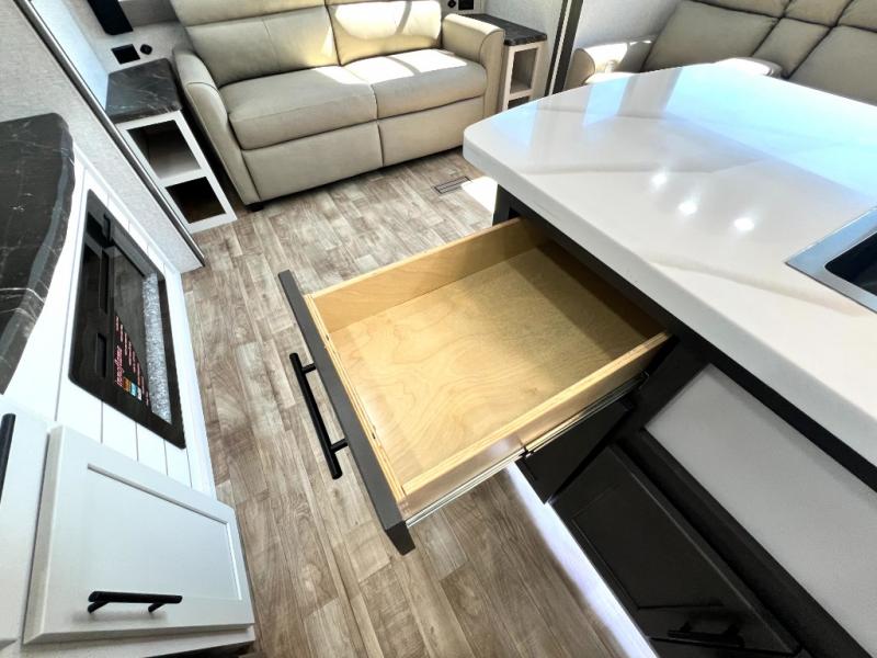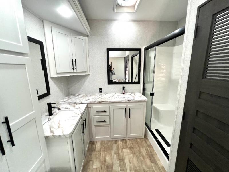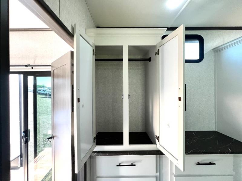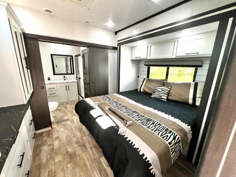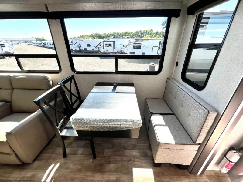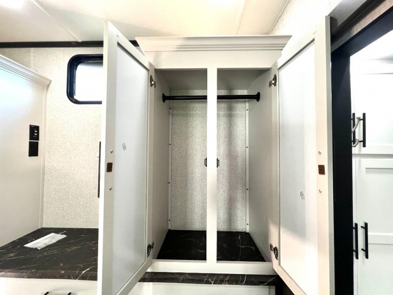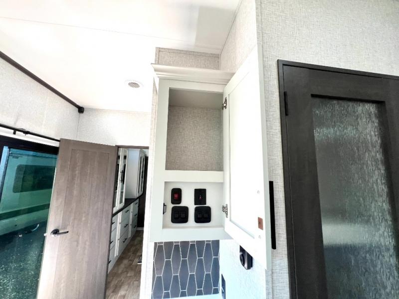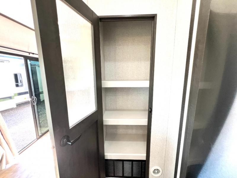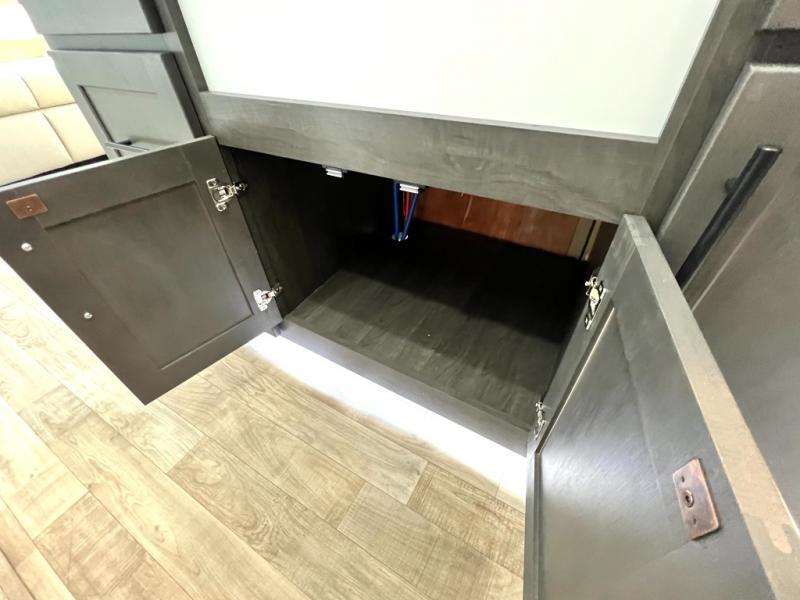 Get away to your own master suite at your favorite destination today! You can sleep on the king bed slide out with plenty of storage for your clothes on the opposite side and get cleaned up in the full bathroom in the 48" shower. There are even dual bath sinks so you both can brush your teeth at the same time. There is also a space that has been prepped for an optional washer/dryer if you like. An added convenience is the centrally located half bath across from the patio doors for easy entry and exit. The front living area provides a sofa that can double as sleeping space for your kids or overnight guests, and the theater seats allow you to clearly see the 50" lift TV with fireplace below. The cook will love the kitchen island, hutch, and pantry with a shelf, as well as the appliances. Dining or even doing a little work will be comfortable while seated at the free standing table with chairs and bench seating.