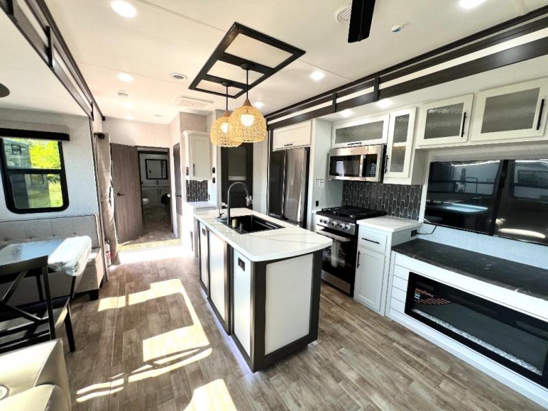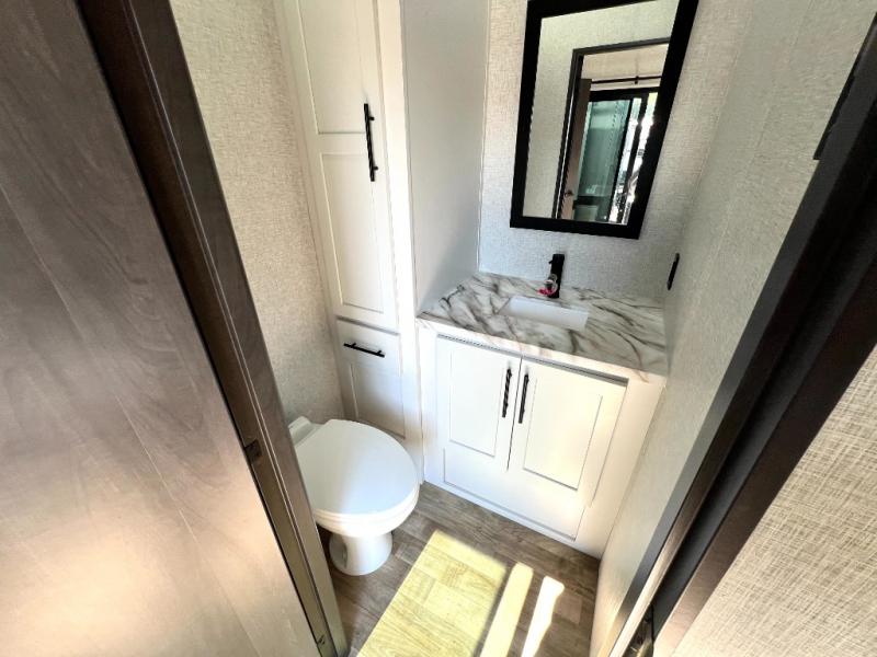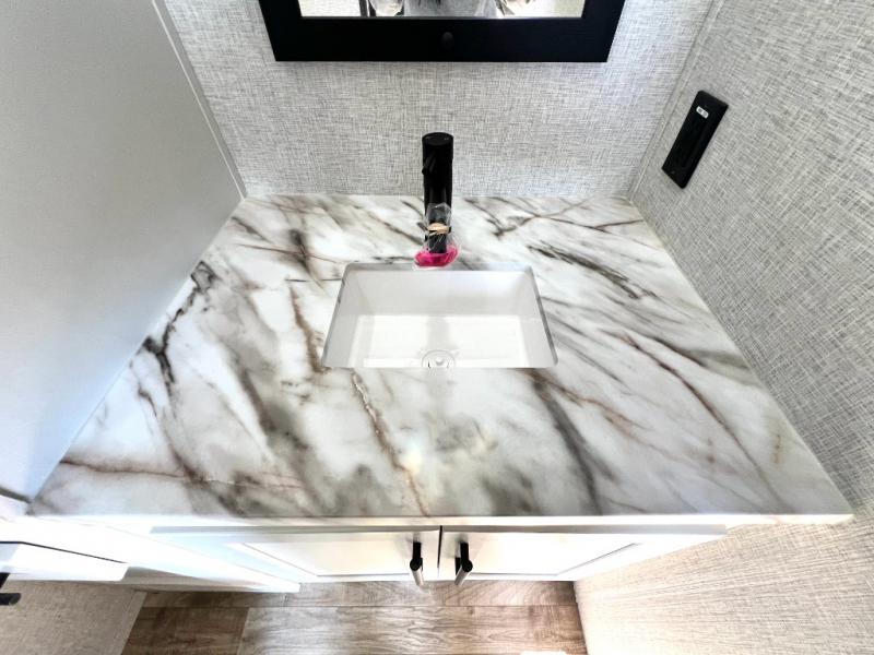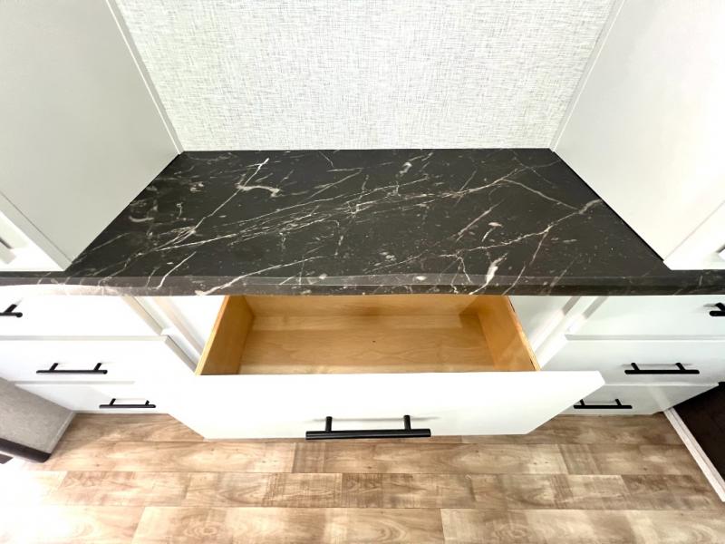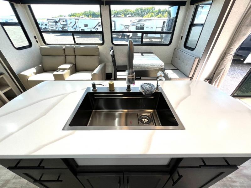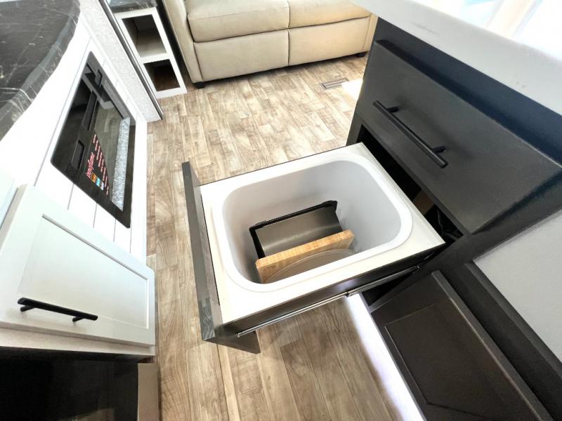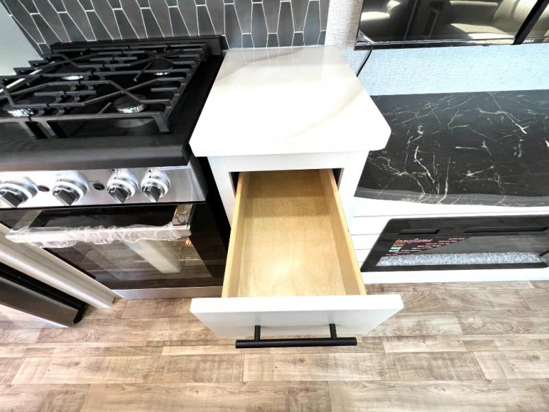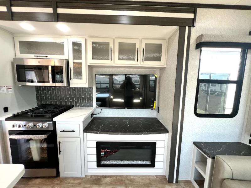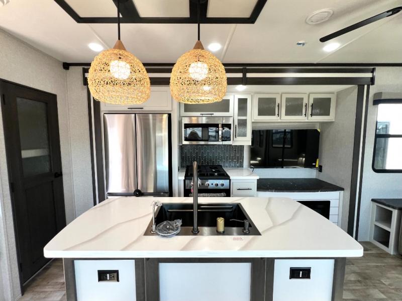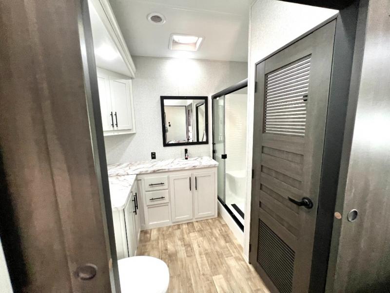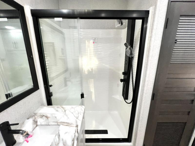 Get away to your own master suite at your favorite destination today! You can sleep on the king bed slide out with plenty of storage for your clothes on the opposite side and get cleaned up in the full bathroom in the 48" shower. There are even dual bath sinks so you both can brush your teeth at the same time. There is also a space that has been prepped for an optional washer/dryer if you like. An added convenience is the centrally located half bath across from the patio doors for easy entry and exit. The front living area provides a sofa that can double as sleeping space for your kids or overnight guests, and the theater seats allow you to clearly see the 50" lift TV with fireplace below. The cook will love the kitchen island, hutch, and pantry with a shelf, as well as the appliances. Dining or even doing a little work will be comfortable while seated at the free standing table with chairs and bench seating.