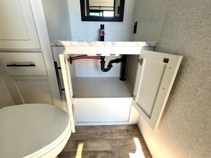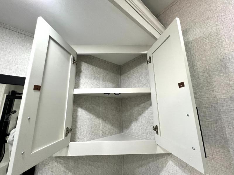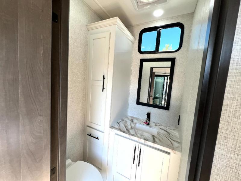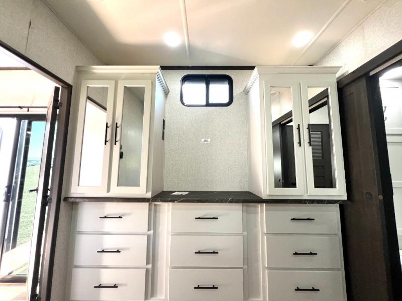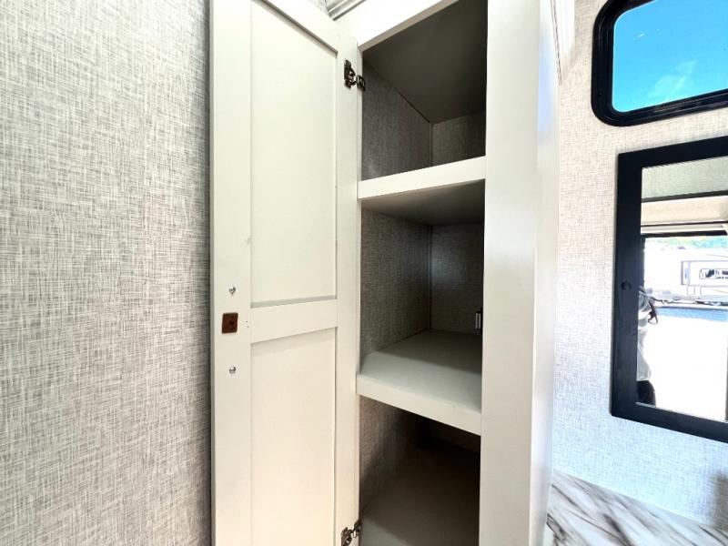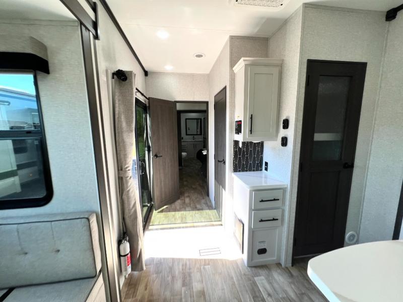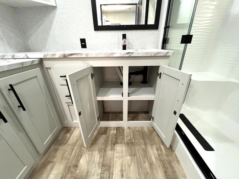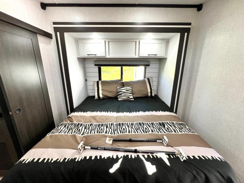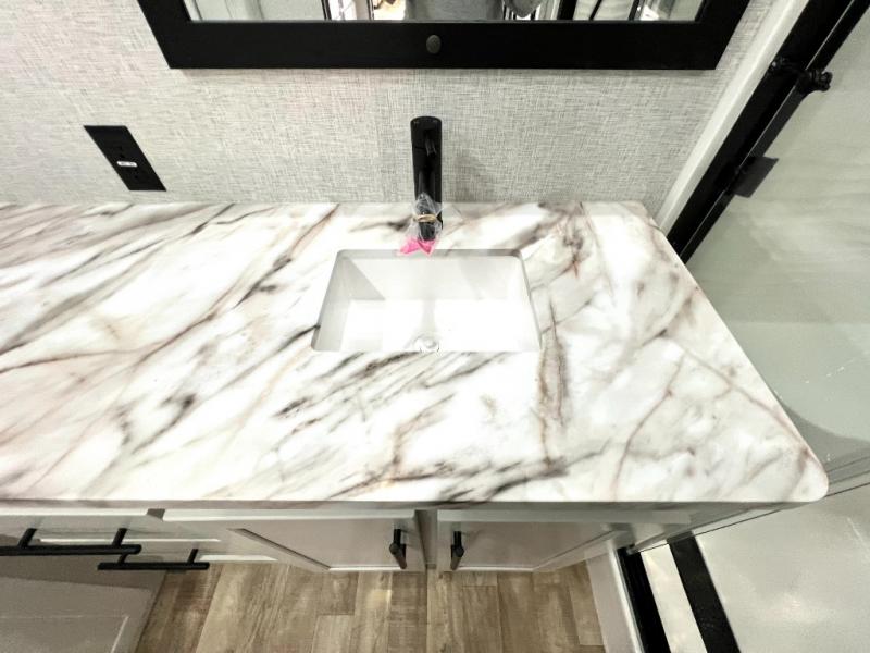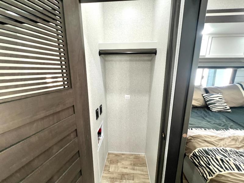 Get away to your own master suite at your favorite destination today! You can sleep on the king bed slide out with plenty of storage for your clothes on the opposite side and get cleaned up in the full bathroom in the 48" shower. There are even dual bath sinks so you both can brush your teeth at the same time. There is also a space that has been prepped for an optional washer/dryer if you like. An added convenience is the centrally located half bath across from the patio doors for easy entry and exit. The front living area provides a sofa that can double as sleeping space for your kids or overnight guests, and the theater seats allow you to clearly see the 50" lift TV with fireplace below. The cook will love the kitchen island, hutch, and pantry with a shelf, as well as the appliances. Dining or even doing a little work will be comfortable while seated at the free standing table with chairs and bench seating.
