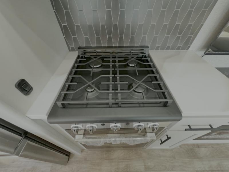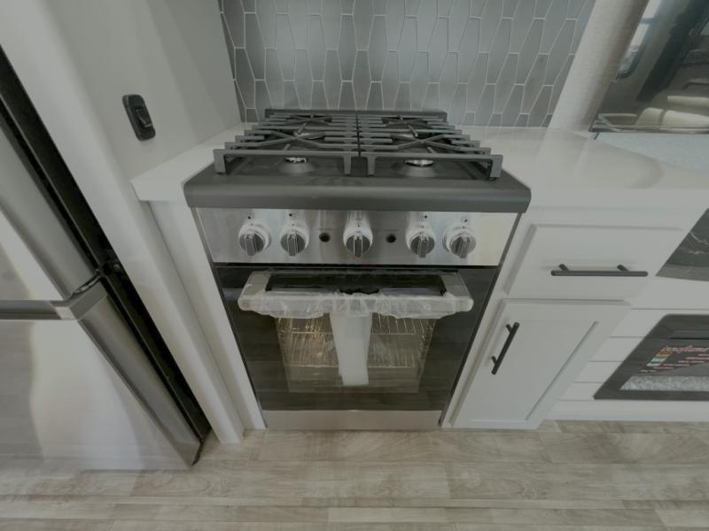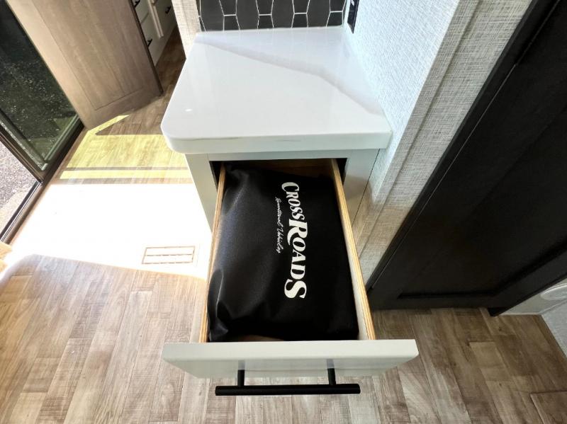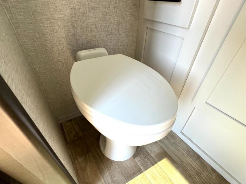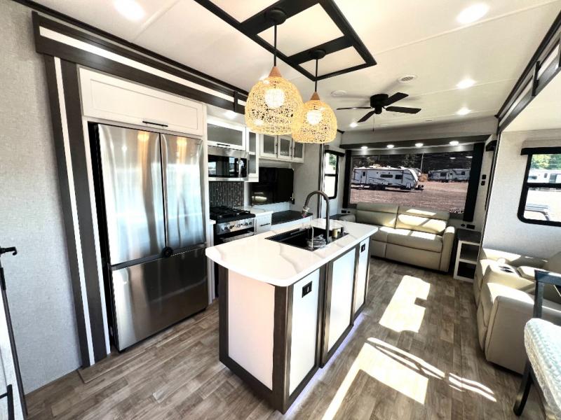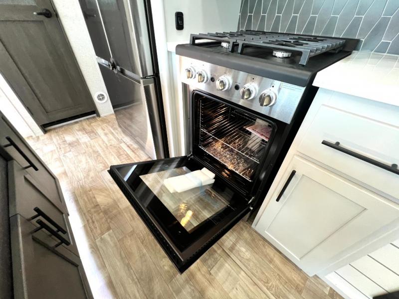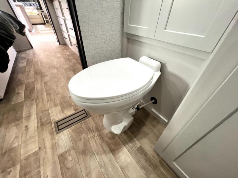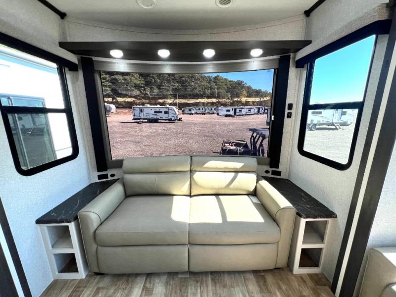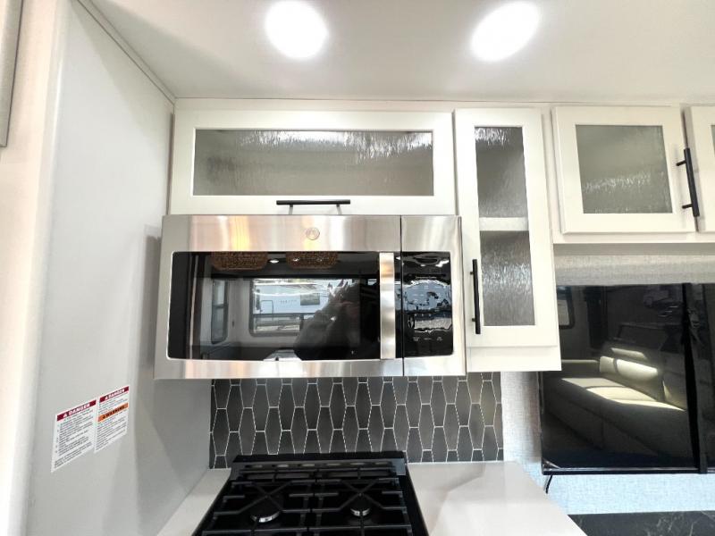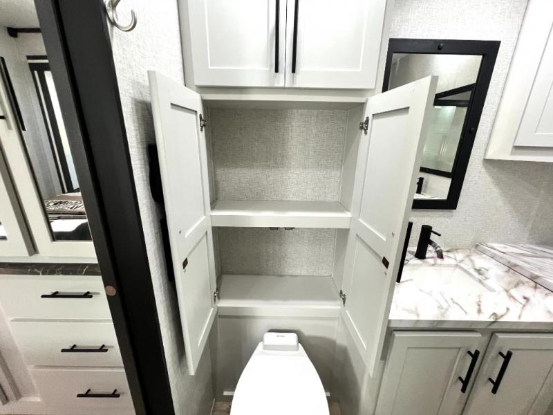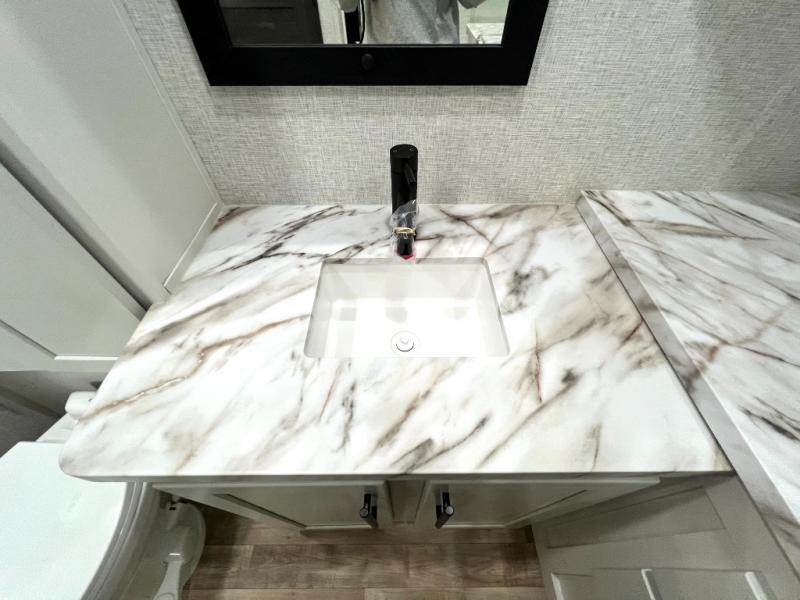 Get away to your own master suite at your favorite destination today! You can sleep on the king bed slide out with plenty of storage for your clothes on the opposite side and get cleaned up in the full bathroom in the 48" shower. There are even dual bath sinks so you both can brush your teeth at the same time. There is also a space that has been prepped for an optional washer/dryer if you like. An added convenience is the centrally located half bath across from the patio doors for easy entry and exit. The front living area provides a sofa that can double as sleeping space for your kids or overnight guests, and the theater seats allow you to clearly see the 50" lift TV with fireplace below. The cook will love the kitchen island, hutch, and pantry with a shelf, as well as the appliances. Dining or even doing a little work will be comfortable while seated at the free standing table with chairs and bench seating.
