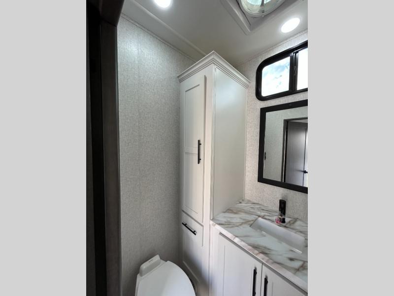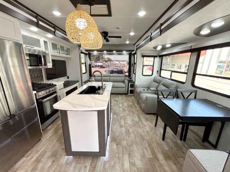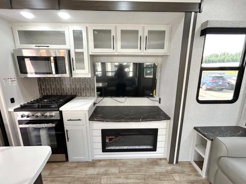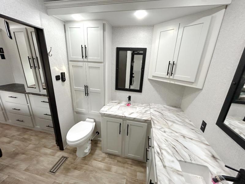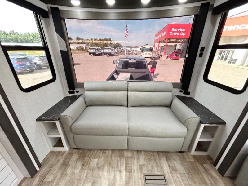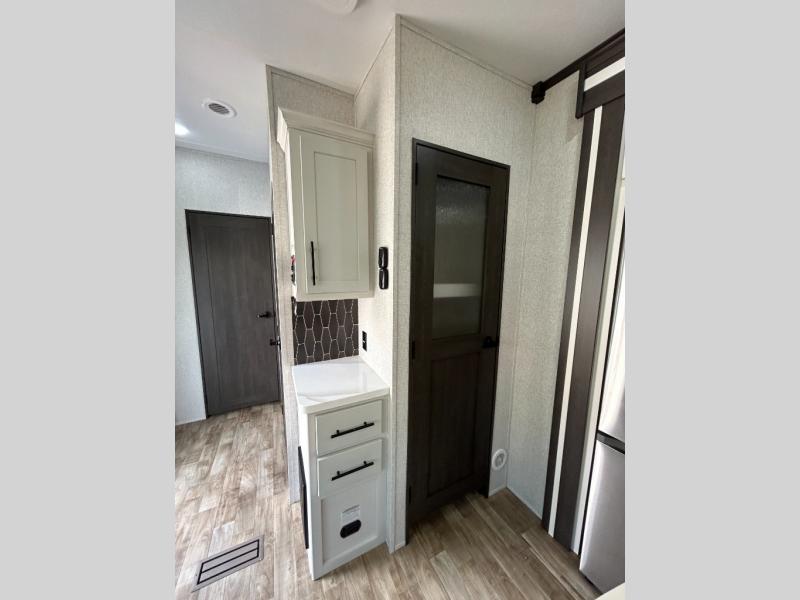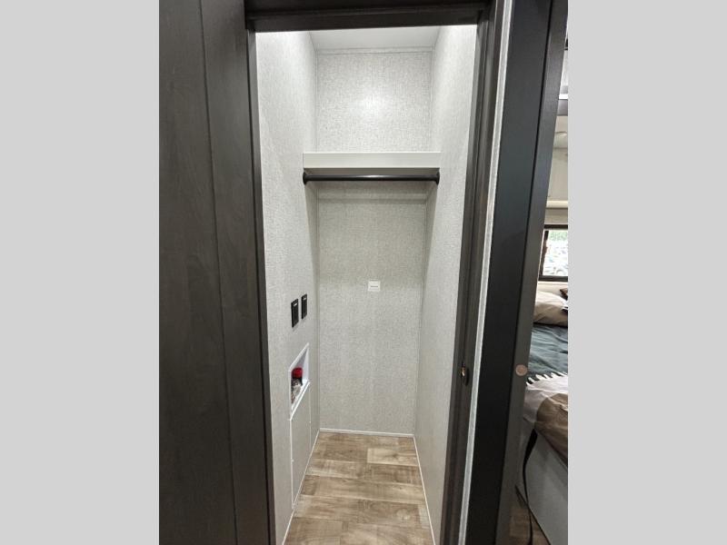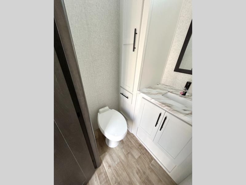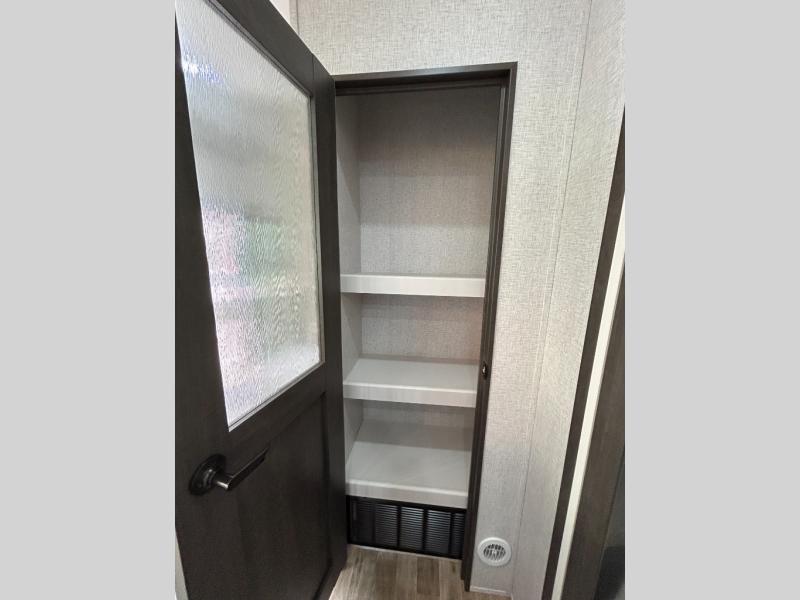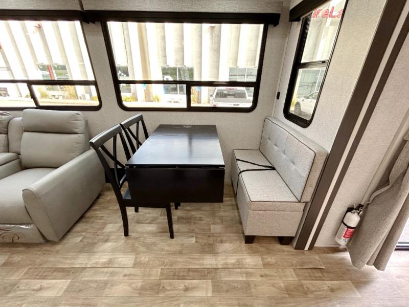 Get away to your own master suite at your favorite destination today! You can sleep on the king bed slide out with plenty of storage for your clothes on the opposite side and get cleaned up in the full bathroom in the 48" shower. There are even dual bath sinks so you both can brush your teeth at the same time. There is also a space that has been prepped for an optional washer/dryer if you like. An added convenience is the centrally located half bath across from the patio doors for easy entry and exit. The front living area provides a sofa that can double as sleeping space for your kids or overnight guests, and the theater seats allow you to clearly see the 50" lift TV with fireplace below. The cook will love the kitchen island, hutch, and pantry with a shelf, as well as the appliances. Dining or even doing a little work will be comfortable while seated at the free standing table with chairs and bench seating.