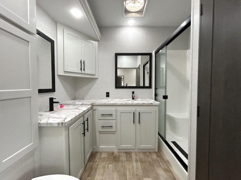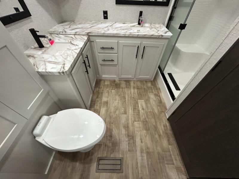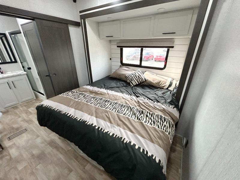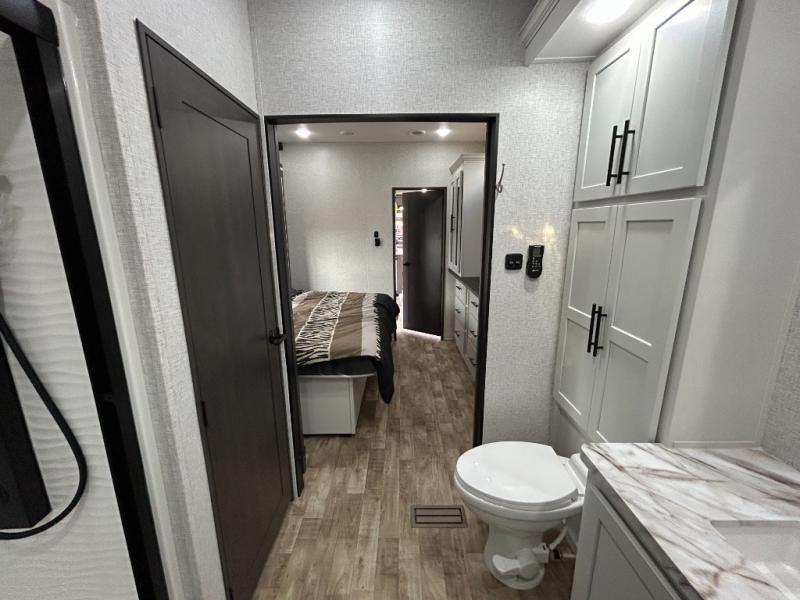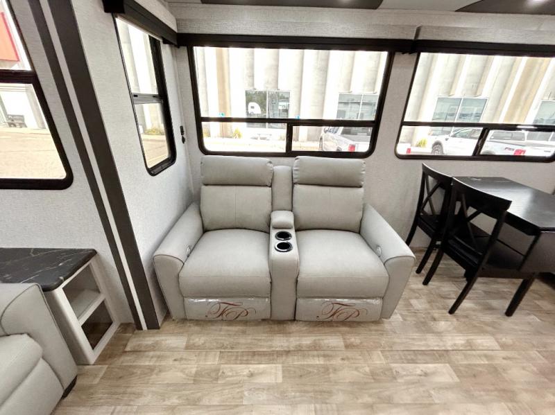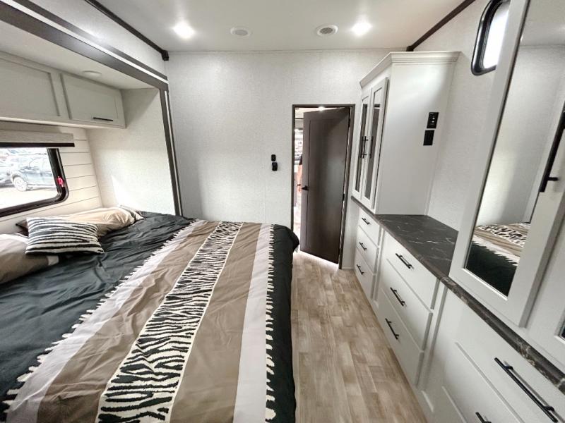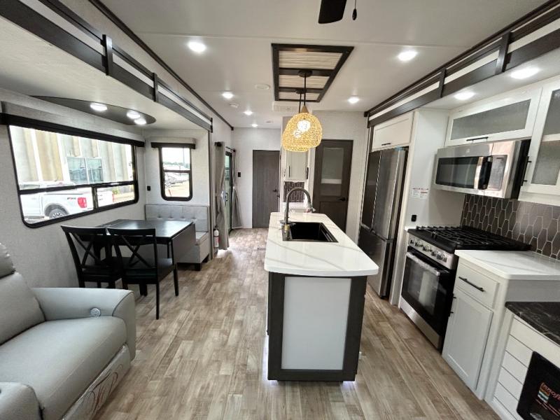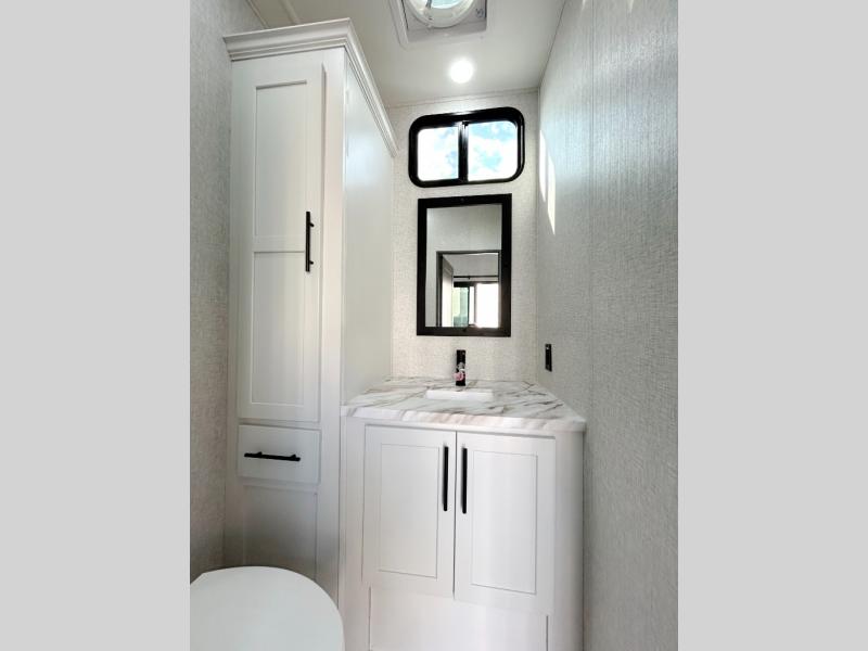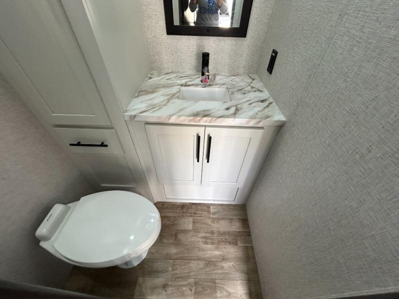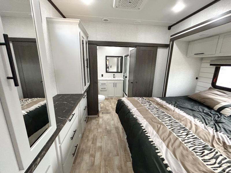Get away to your own master suite at your favorite destination today! You can sleep on the king bed slide out with plenty of storage for your clothes on the opposite side and get cleaned up in the full bathroom in the 48" shower. There are even dual bath sinks so you both can brush your teeth at the same time. There is also a space that has been prepped for an optional washer/dryer if you like. An added convenience is the centrally located half bath across from the patio doors for easy entry and exit. The front living area provides a sofa that can double as sleeping space for your kids or overnight guests, and the theater seats allow you to clearly see the 50" lift TV with fireplace below. The cook will love the kitchen island, hutch, and pantry with a shelf, as well as the appliances. Dining or even doing a little work will be comfortable while seated at the free standing table with chairs and bench seating.