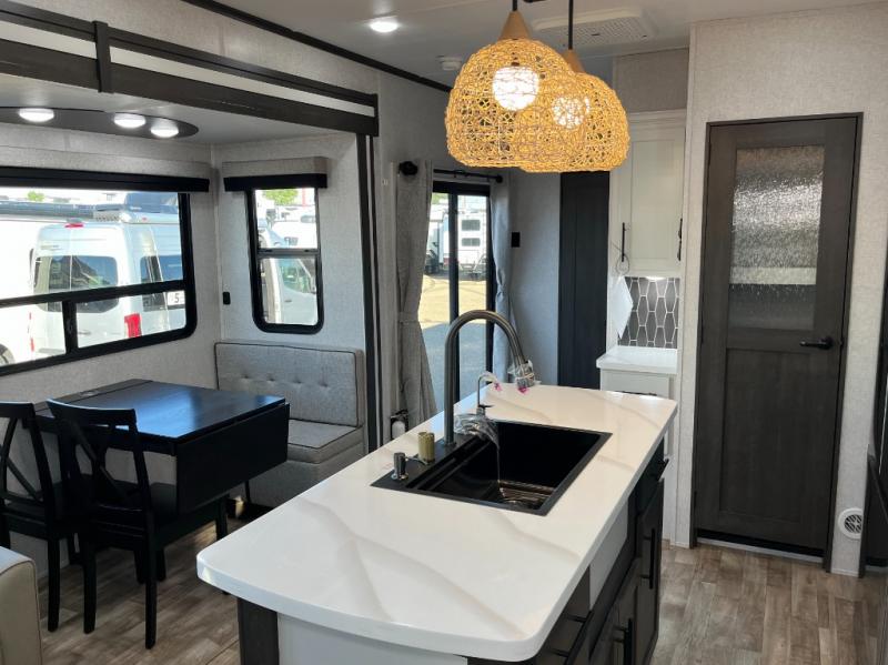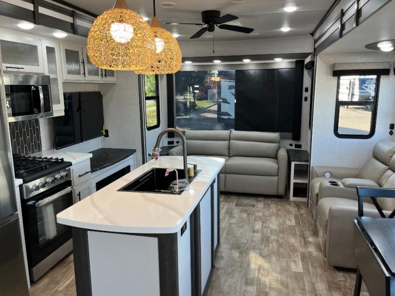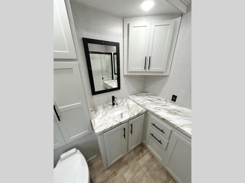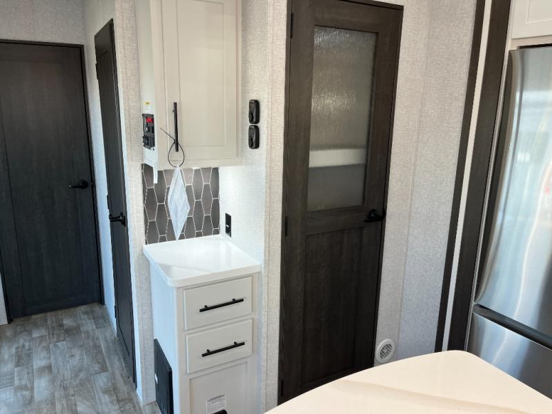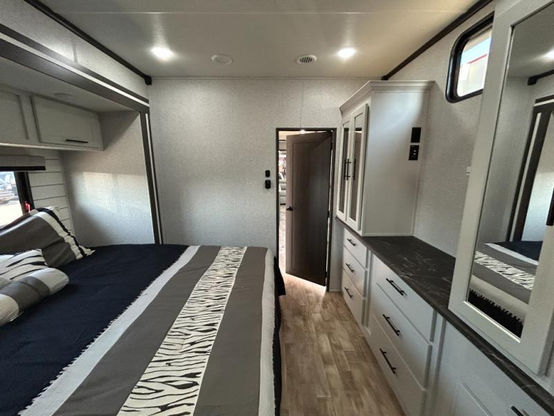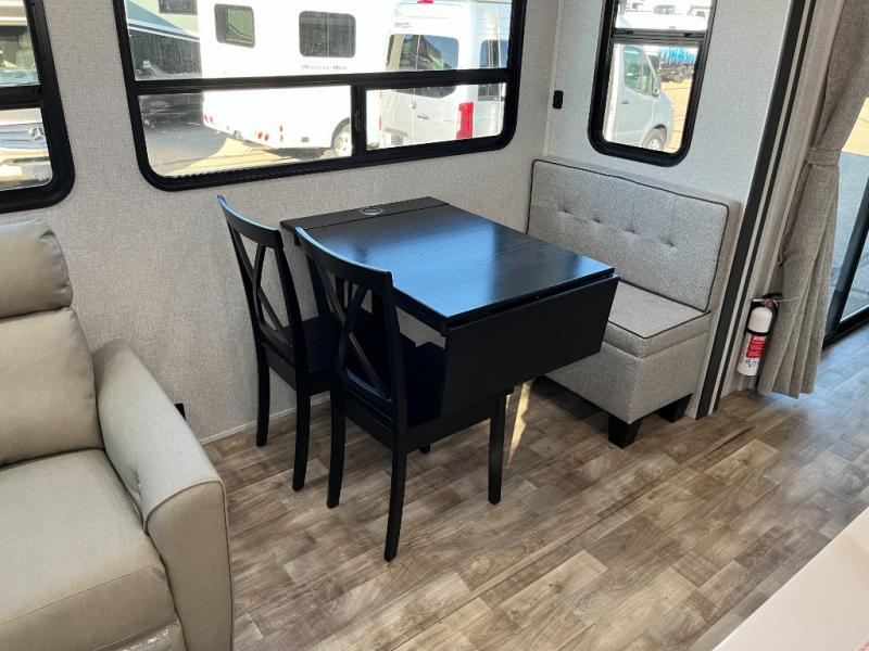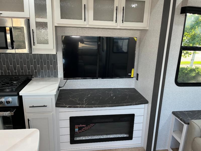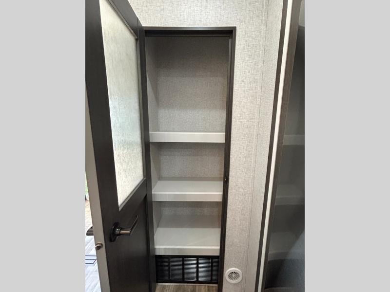 Get away to your own master suite at your favorite destination today! You can sleep on the king bed slide out with plenty of storage for your clothes on the opposite side and get cleaned up in the full bathroom in the 48" shower. There are even dual bath sinks so you both can brush your teeth at the same time. There is also a space that has been prepped for an optional washer/dryer if you like. An added convenience is the centrally located half bath across from the patio doors for easy entry and exit. The front living area provides a sofa that can double as sleeping space for your kids or overnight guests, and the theater seats allow you to clearly see the 50" lift TV with fireplace below. The cook will love the kitchen island, hutch, and pantry with a shelf, as well as the appliances. Dining or even doing a little work will be comfortable while seated at the free standing table with chairs and bench seating.