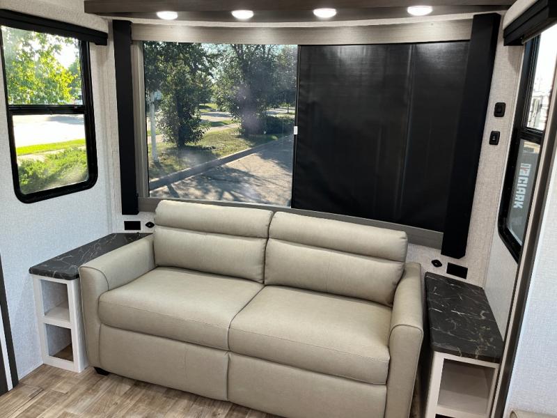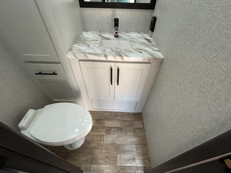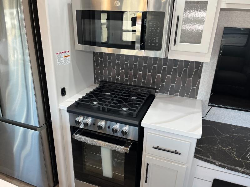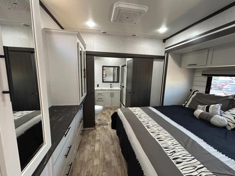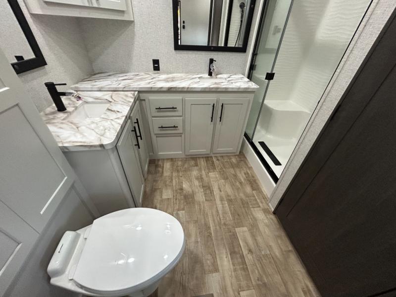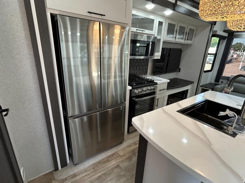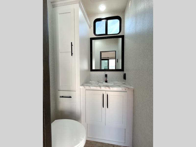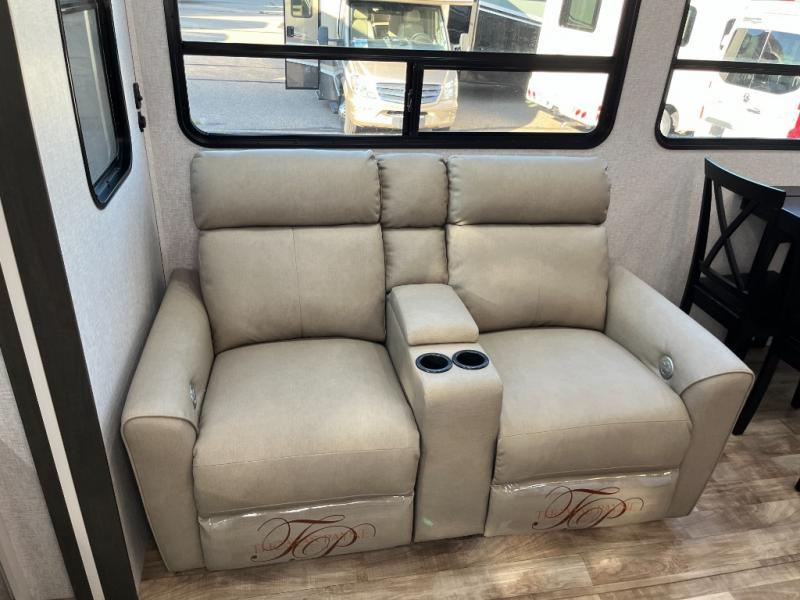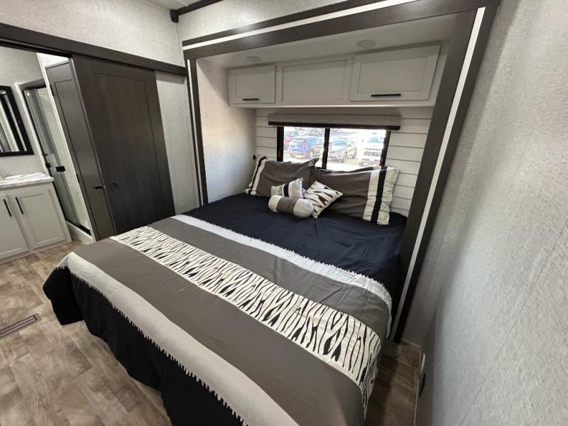 Get away to your own master suite at your favorite destination today! You can sleep on the king bed slide out with plenty of storage for your clothes on the opposite side and get cleaned up in the full bathroom in the 48" shower. There are even dual bath sinks so you both can brush your teeth at the same time. There is also a space that has been prepped for an optional washer/dryer if you like. An added convenience is the centrally located half bath across from the patio doors for easy entry and exit. The front living area provides a sofa that can double as sleeping space for your kids or overnight guests, and the theater seats allow you to clearly see the 50" lift TV with fireplace below. The cook will love the kitchen island, hutch, and pantry with a shelf, as well as the appliances. Dining or even doing a little work will be comfortable while seated at the free standing table with chairs and bench seating.