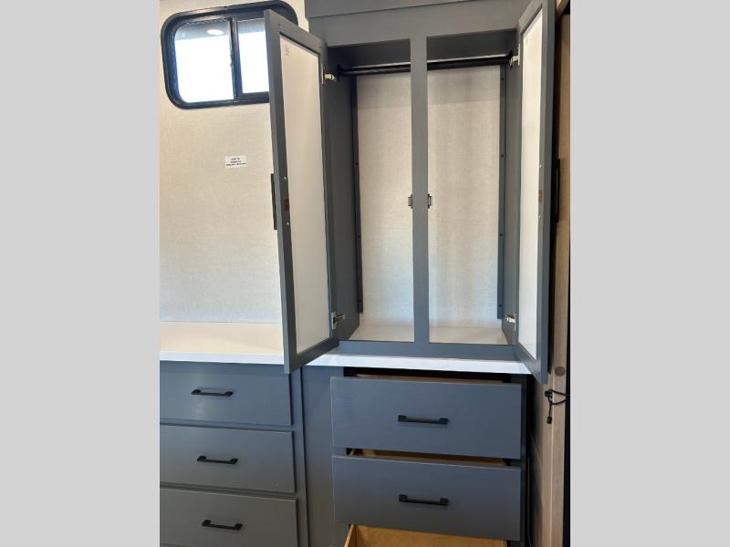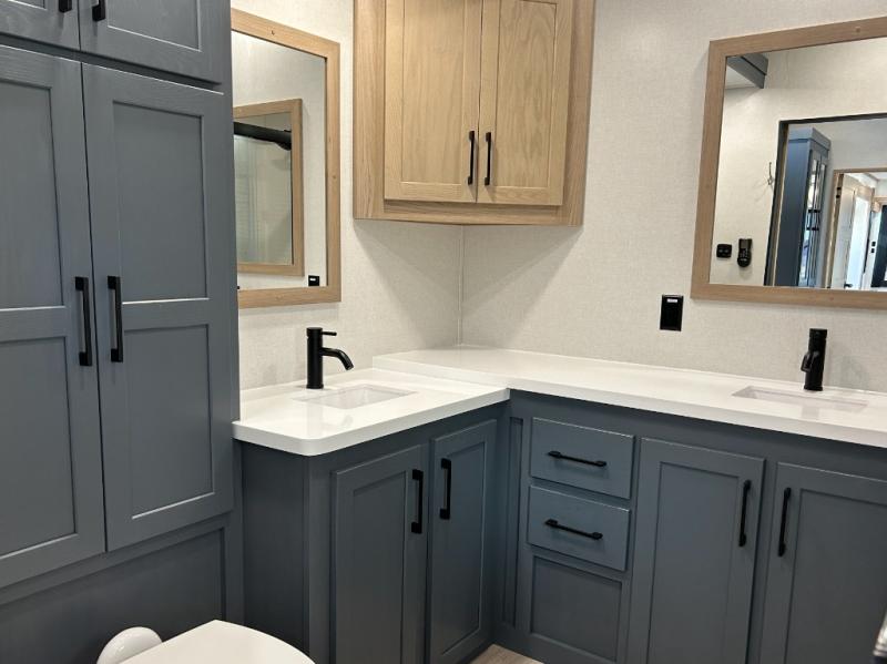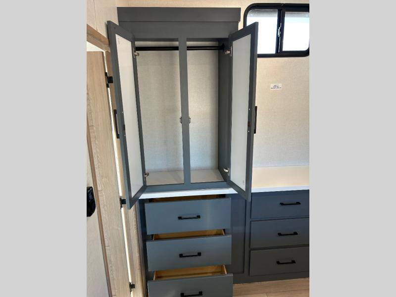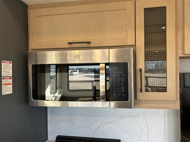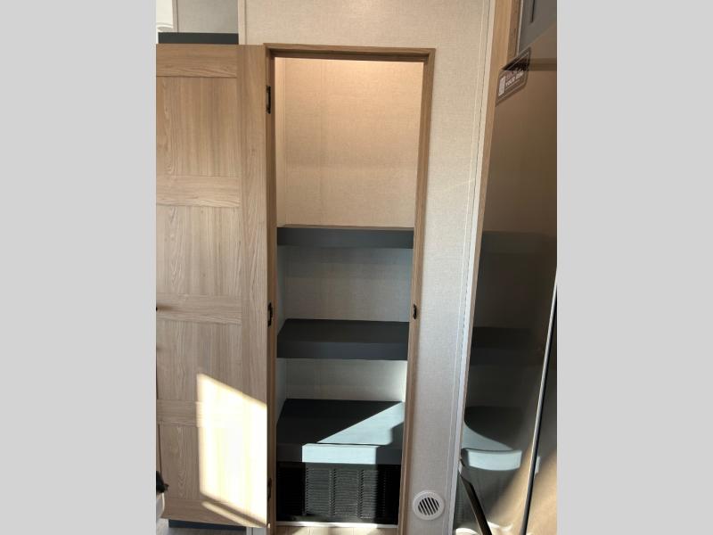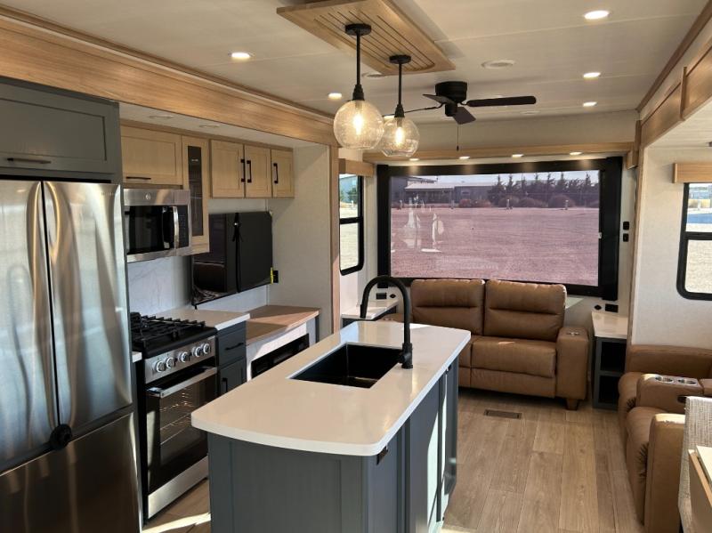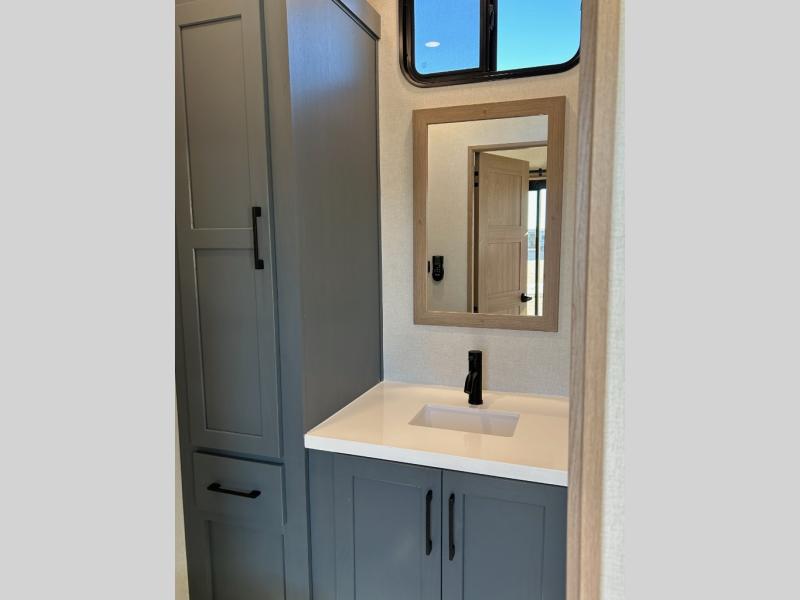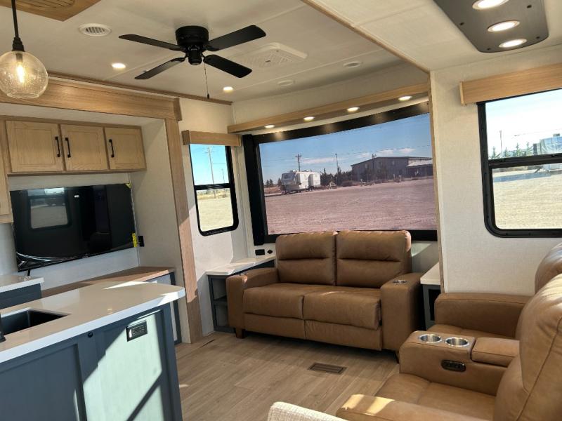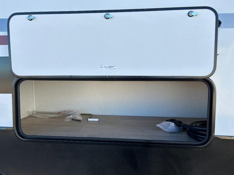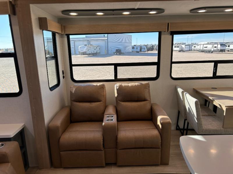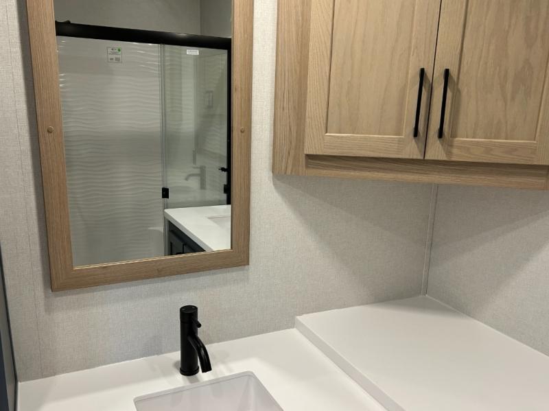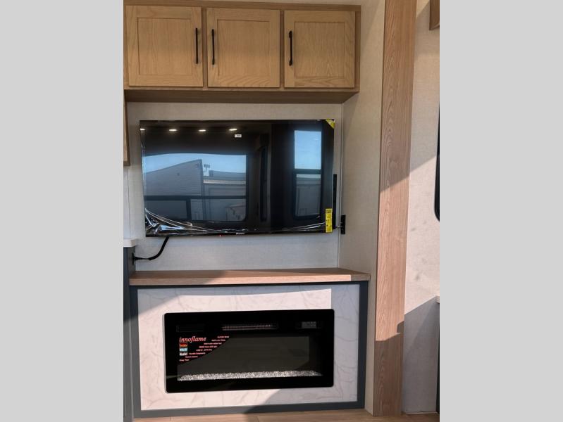 Get away to your own master suite at your favorite destination today! You can sleep on the king bed slide out with plenty of storage for your clothes on the opposite side and get cleaned up in the full bathroom in the 48" shower. There are even dual bath sinks so you both can brush your teeth at the same time. There is also a space that has been prepped for an optional washer/dryer if you like. An added convenience is the centrally located half bath across from the patio doors for easy entry and exit. The front living area provides a sofa that can double as sleeping space for your kids or overnight guests, and the theater seats allow you to clearly see the 50" lift TV with fireplace below. The cook will love the kitchen island, hutch, and pantry with a shelf, as well as the appliances. Dining or even doing a little work will be comfortable while seated at the free standing table with chairs and bench seating.