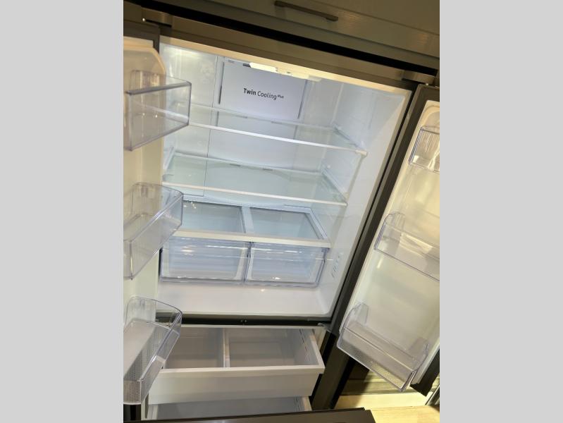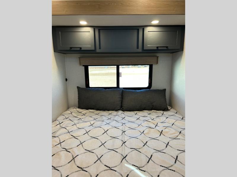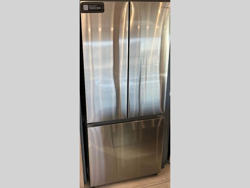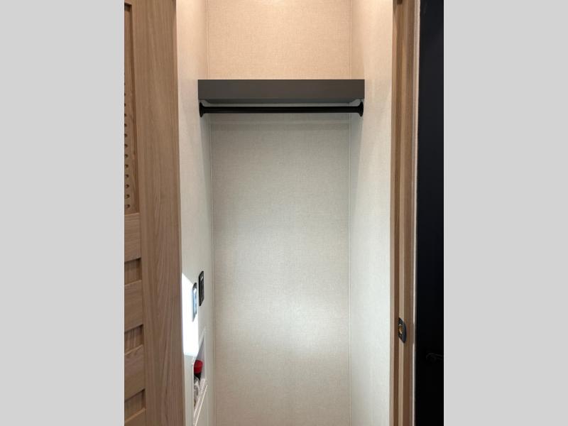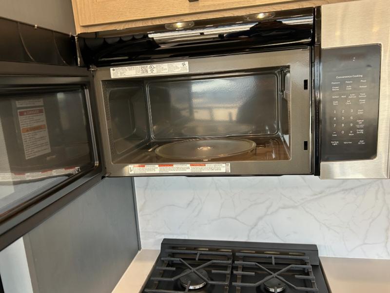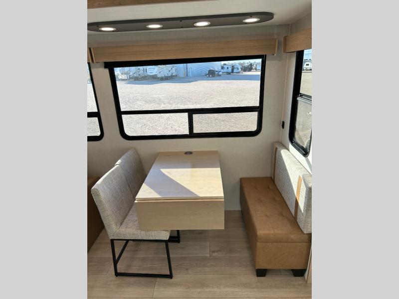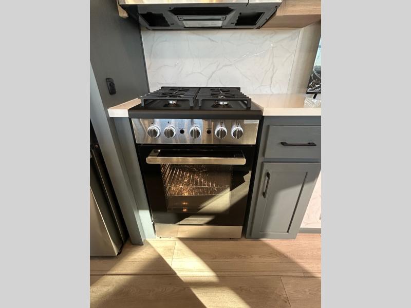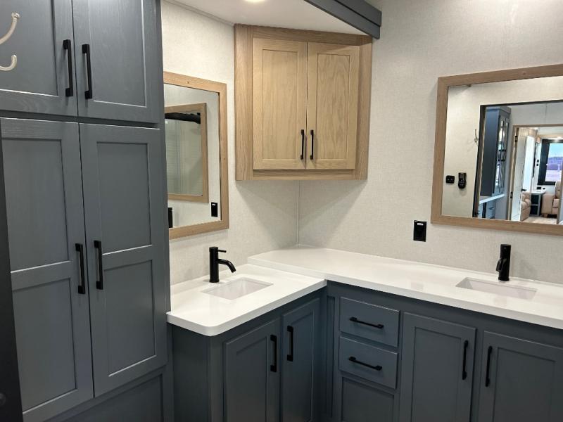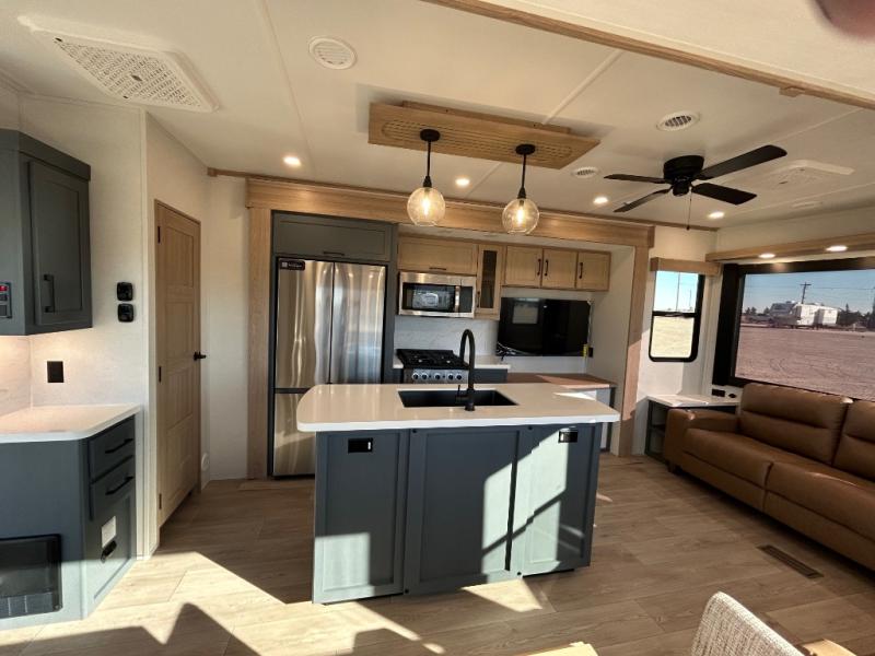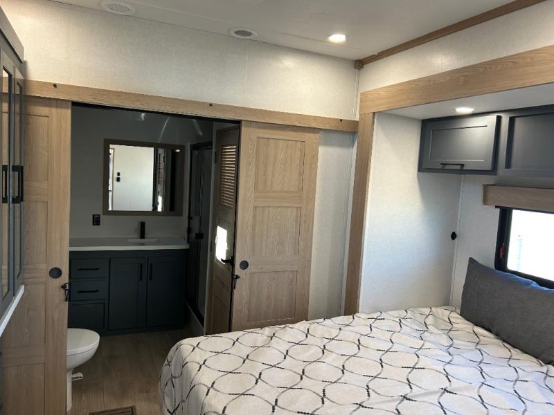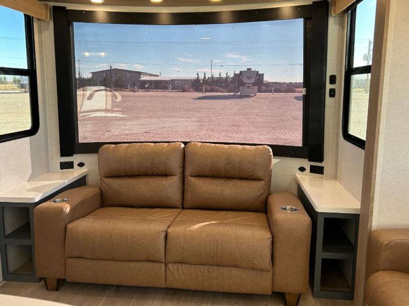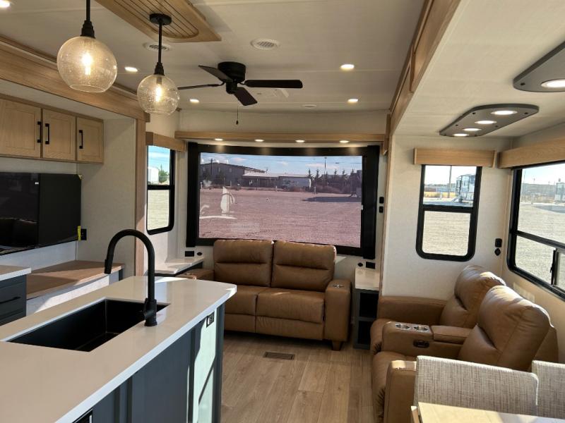 Get away to your own master suite at your favorite destination today! You can sleep on the king bed slide out with plenty of storage for your clothes on the opposite side and get cleaned up in the full bathroom in the 48" shower. There are even dual bath sinks so you both can brush your teeth at the same time. There is also a space that has been prepped for an optional washer/dryer if you like. An added convenience is the centrally located half bath across from the patio doors for easy entry and exit. The front living area provides a sofa that can double as sleeping space for your kids or overnight guests, and the theater seats allow you to clearly see the 50" lift TV with fireplace below. The cook will love the kitchen island, hutch, and pantry with a shelf, as well as the appliances. Dining or even doing a little work will be comfortable while seated at the free standing table with chairs and bench seating.
