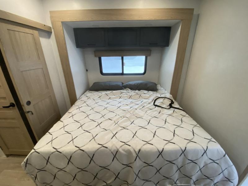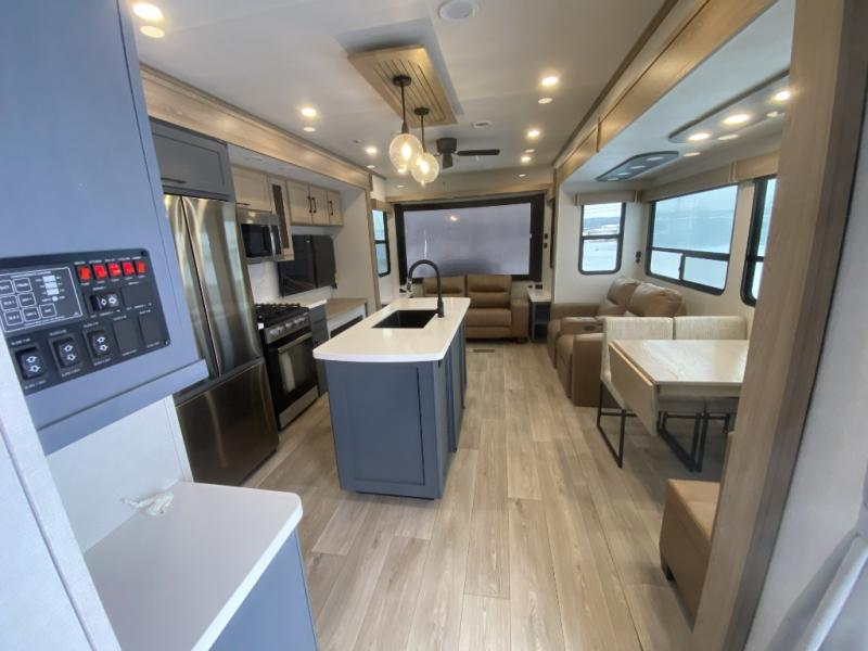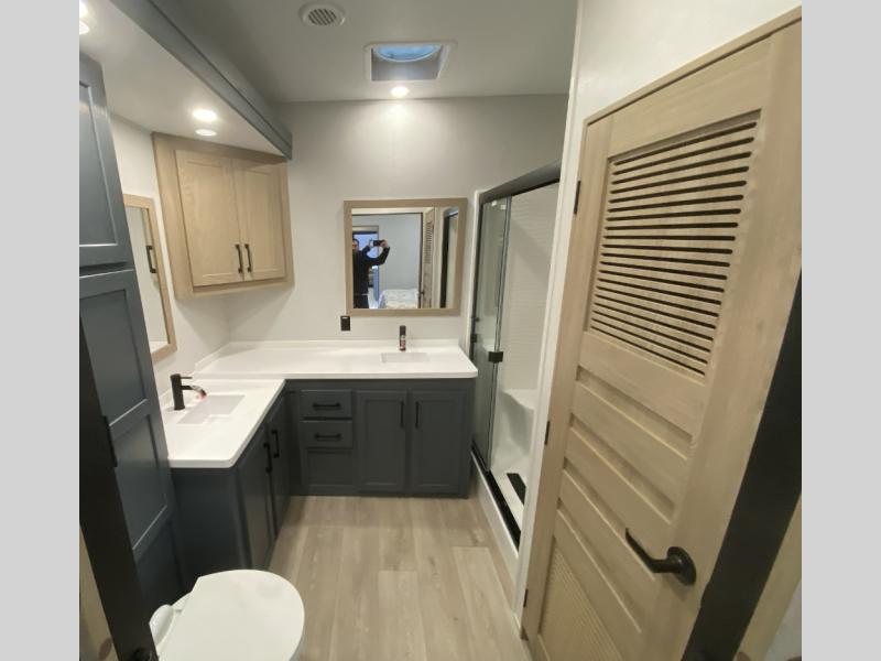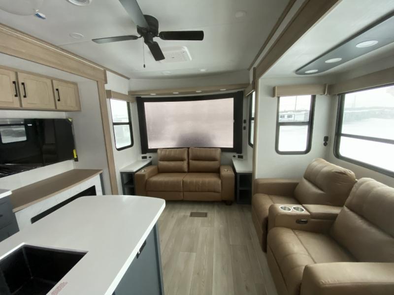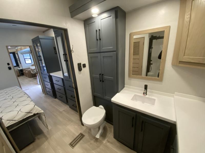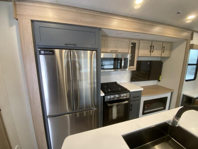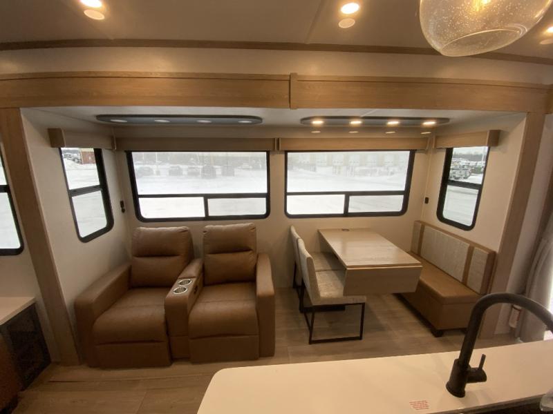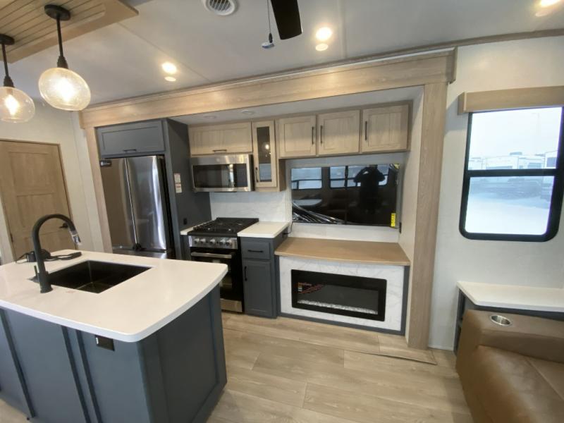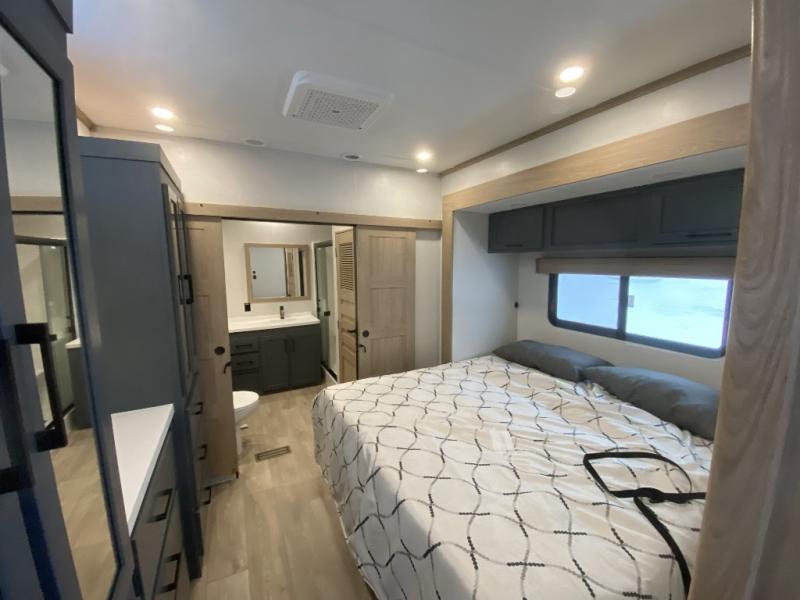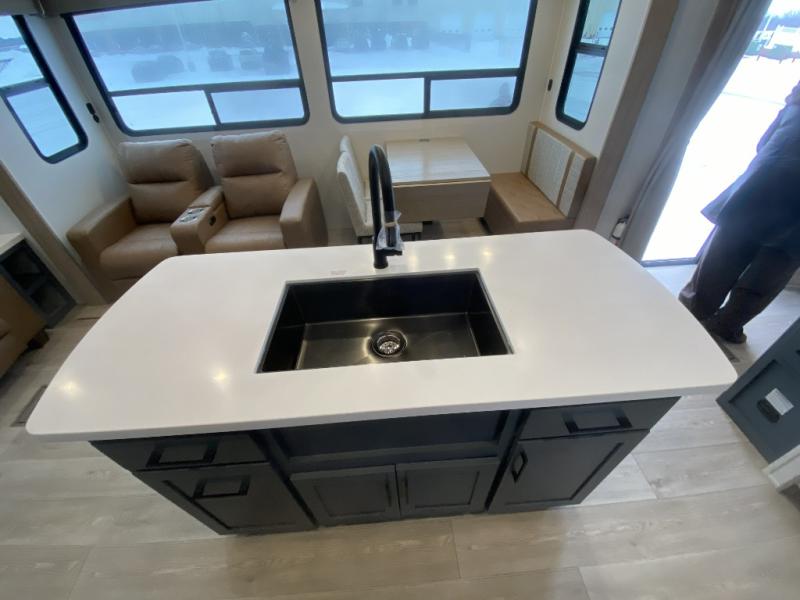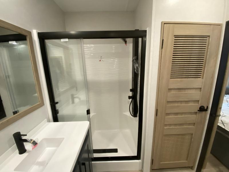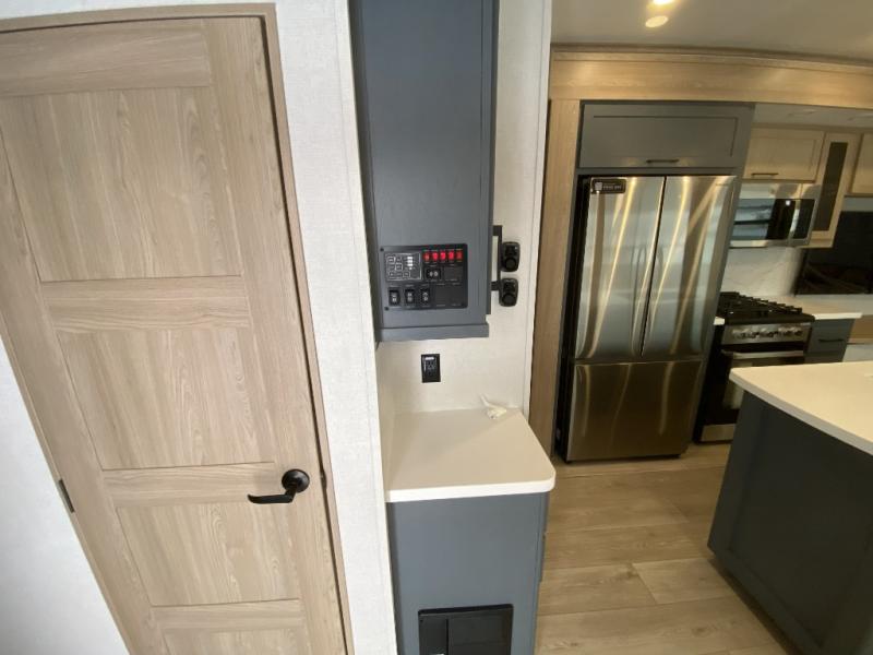 Get away to your own master suite at your favorite destination today! You can sleep on the king bed slide out with plenty of storage for your clothes on the opposite side and get cleaned up in the full bathroom in the 48" shower. There are even dual bath sinks so you both can brush your teeth at the same time. There is also a space that has been prepped for an optional washer/dryer if you like. An added convenience is the centrally located half bath across from the patio doors for easy entry and exit. The front living area provides a sofa that can double as sleeping space for your kids or overnight guests, and the theater seats allow you to clearly see the 50" lift TV with fireplace below. The cook will love the kitchen island, hutch, and pantry with a shelf, as well as the appliances. Dining or even doing a little work will be comfortable while seated at the free standing table with chairs and bench seating.