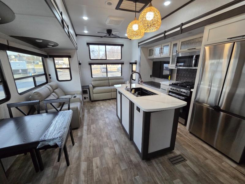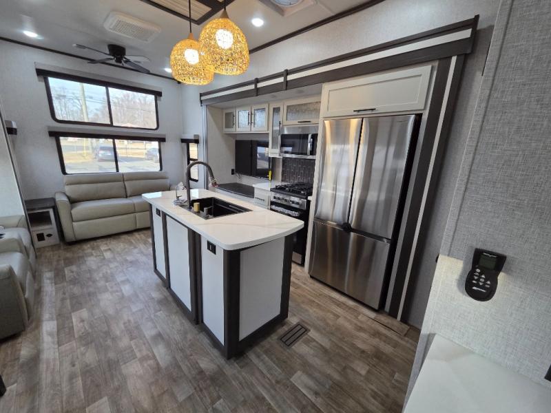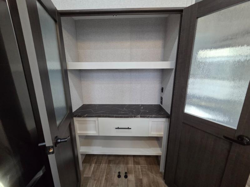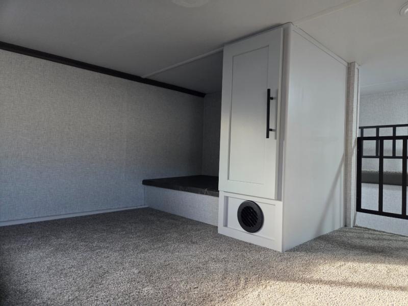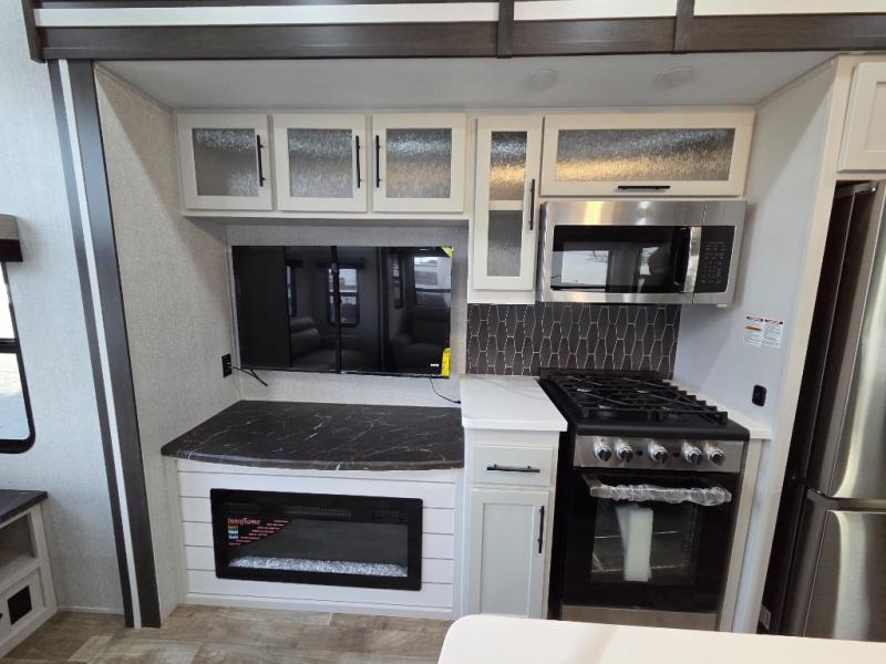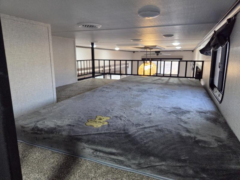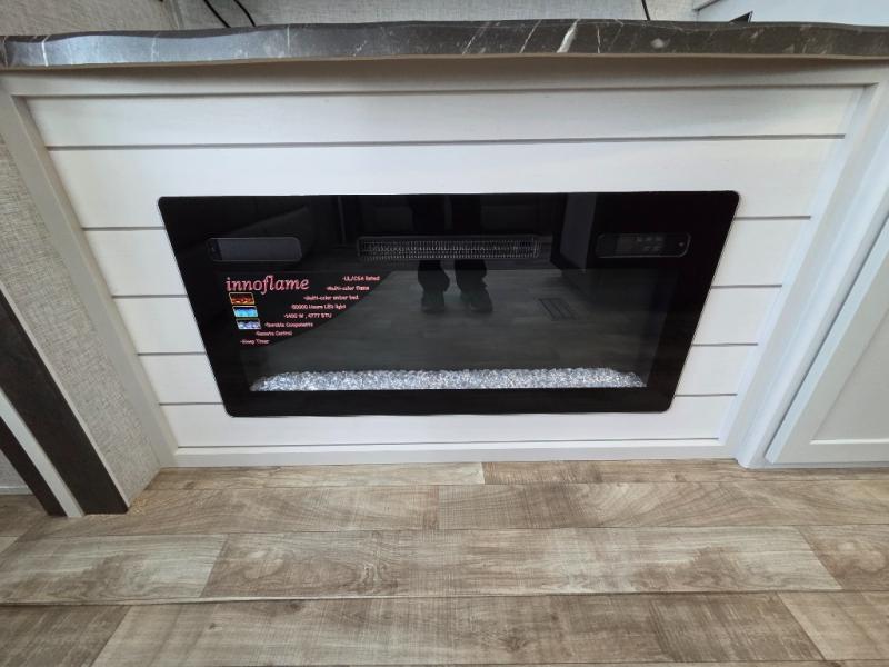 You can comfortably sleep seven people in this destination trailer, so invite more friends along! The little ones are sure to love the loft areas above the bedroom and bathroom. You will have the front private bedroom all to yourselves with a king bed slide out and plenty of space to relax and store your things. If you have any other guests, they can sleep on the hide-a-bed sofa at the back of the trailer. You will find everything you need in this residential kitchen with an island, an Insignia four burner cooktop, plus a double door pantry with shelves. And when your day is over you can relax in the rear living area on the theater seating across from the 50" lift TV and fireplace!