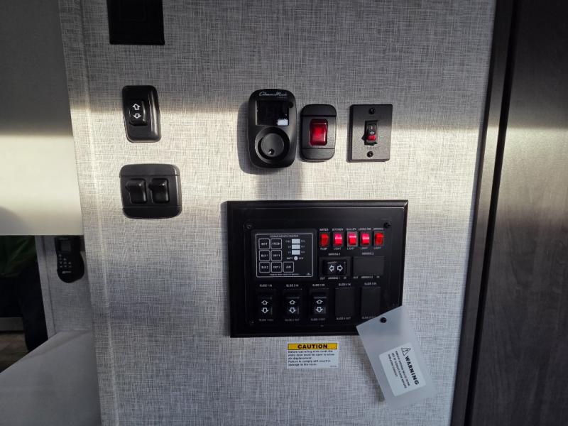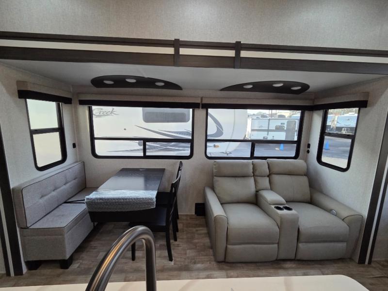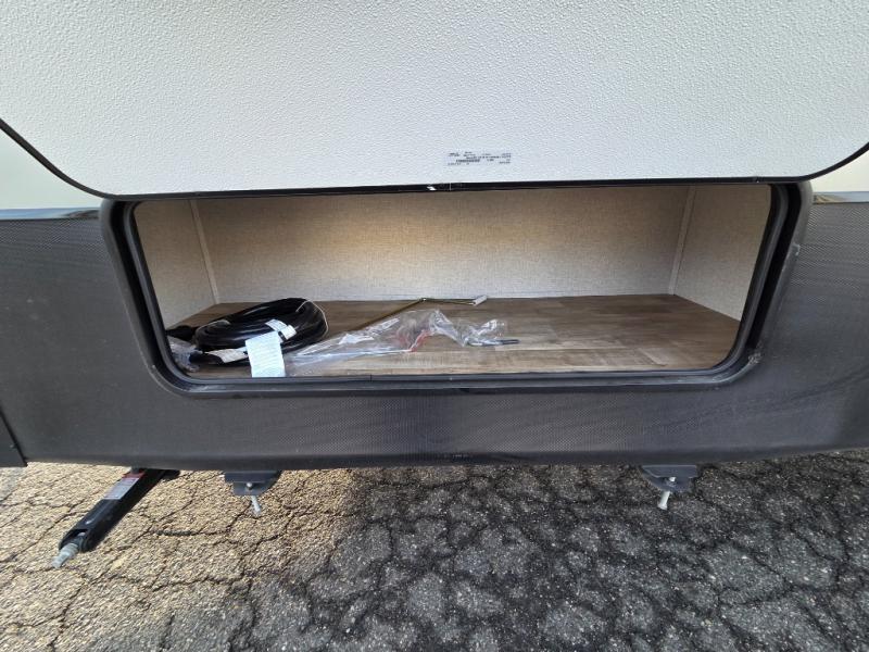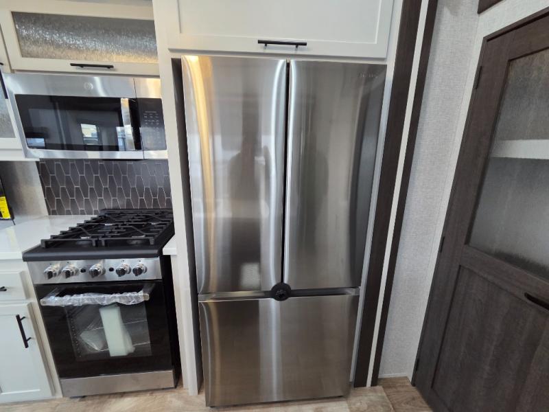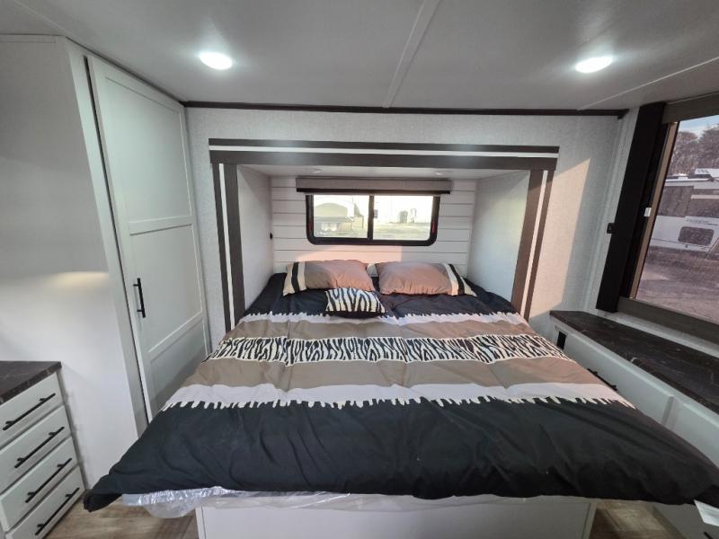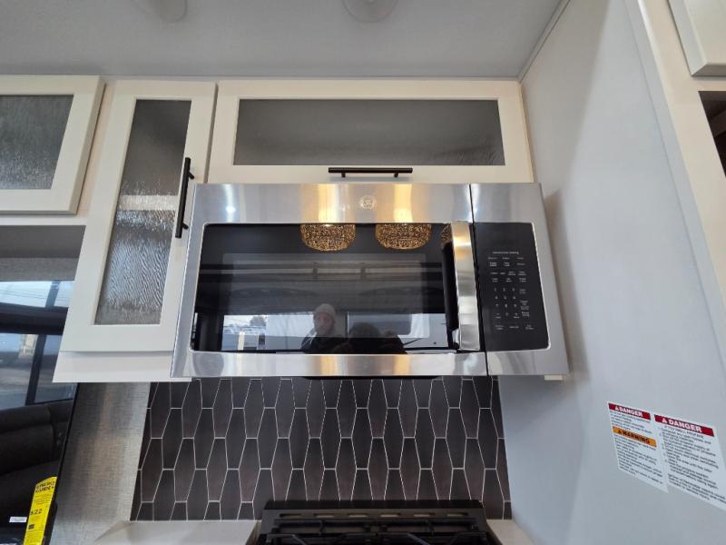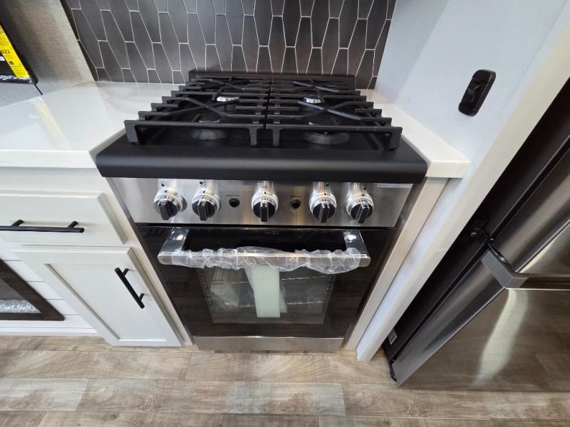 You can comfortably sleep seven people in this destination trailer, so invite more friends along! The little ones are sure to love the loft areas above the bedroom and bathroom. You will have the front private bedroom all to yourselves with a king bed slide out and plenty of space to relax and store your things. If you have any other guests, they can sleep on the hide-a-bed sofa at the back of the trailer. You will find everything you need in this residential kitchen with an island, an Insignia four burner cooktop, plus a double door pantry with shelves. And when your day is over you can relax in the rear living area on the theater seating across from the 50" lift TV and fireplace!