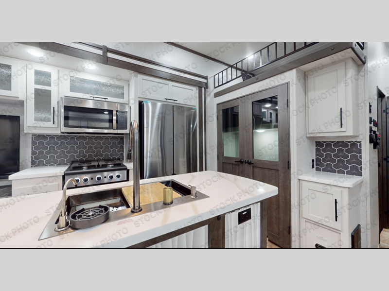 You can comfortably sleep seven people in this destination trailer, so invite more friends along! The little ones are sure to love the loft areas above the bedroom and bathroom. You will have the front private bedroom all to yourselves with a king bed slide out and plenty of space to relax and store your things. If you have any other guests, they can sleep on the hide-a-bed sofa at the back of the trailer. You will find everything you need in this residential kitchen with an island, an Insignia four burner cooktop, plus a double door pantry with shelves. And when your day is over you can relax in the rear living area on the theater seating across from the 50" lift TV and fireplace!