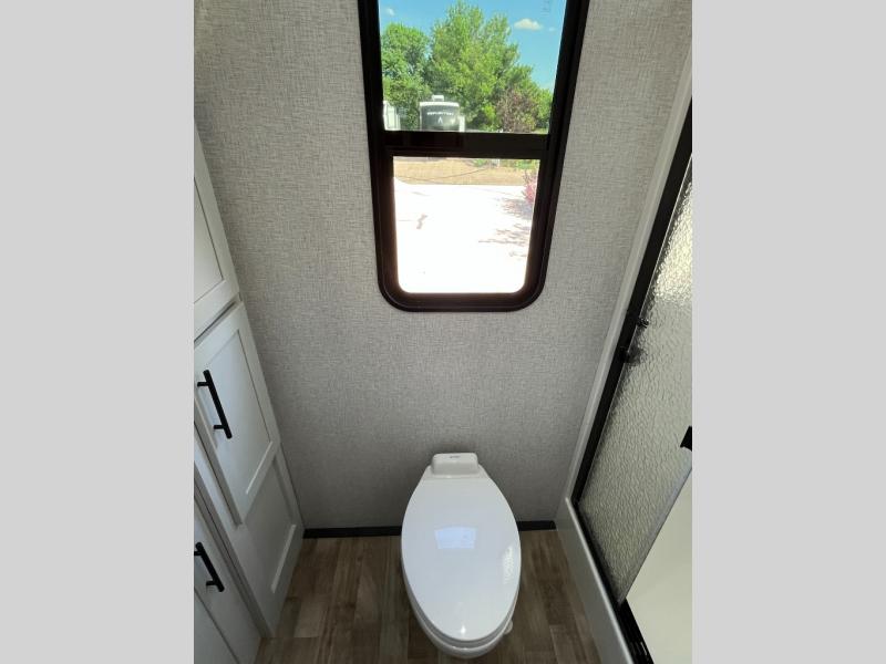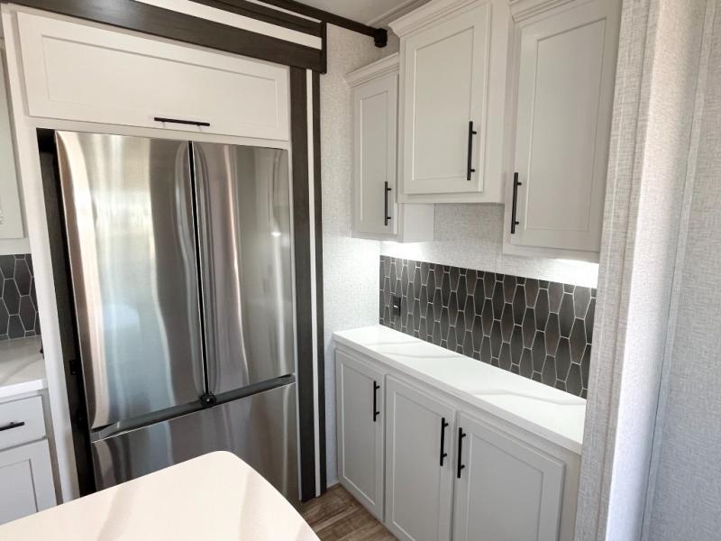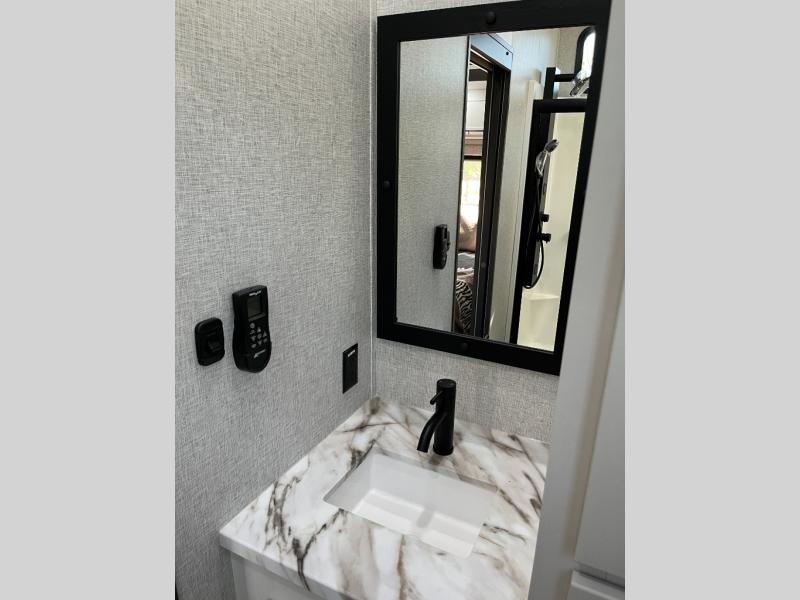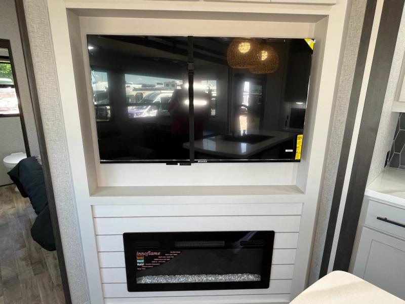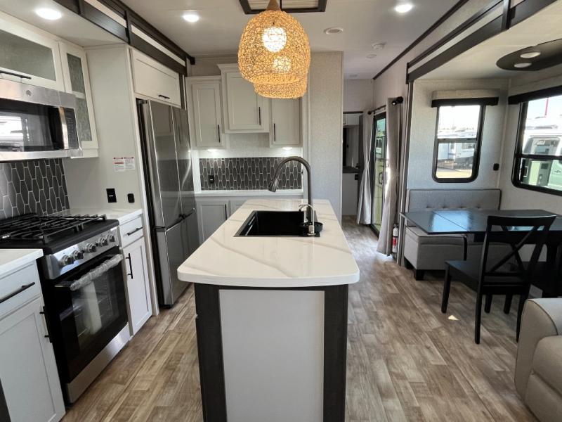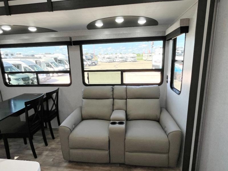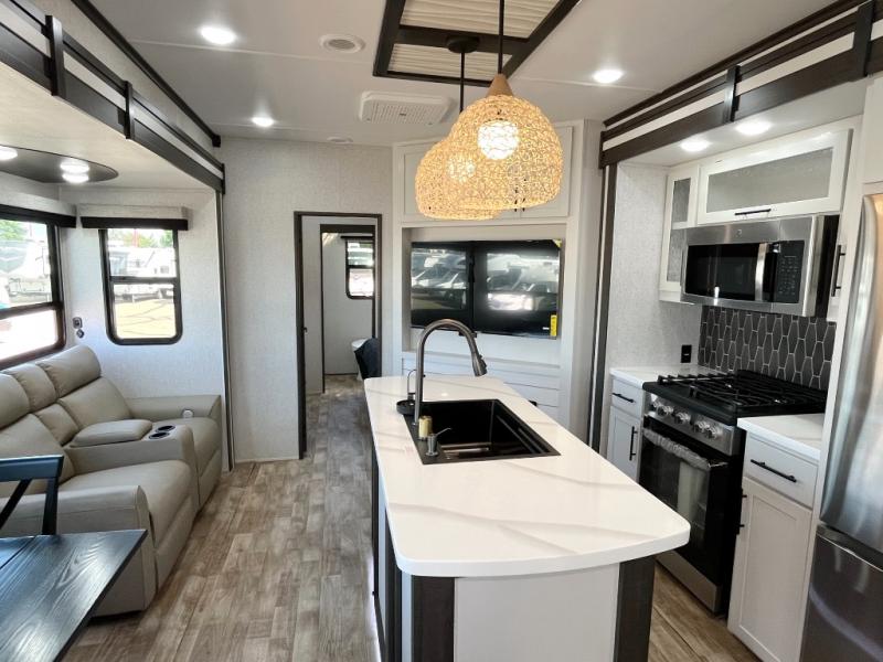Wow! Check out this destination trailer with four slides, two private bedrooms, and two full baths! Now you can camp for longer periods of time and soak up the nature around you. The kitchen island includes plenty of counter space, a deep stainless steel sink for easy clean up, and a hutch for more storage. After dinner is cleaned up you can relax on the power theater seating in great view of the 50" TV, or you may just want to play a game of cards at the free-standing table with chairs and a bench seat.