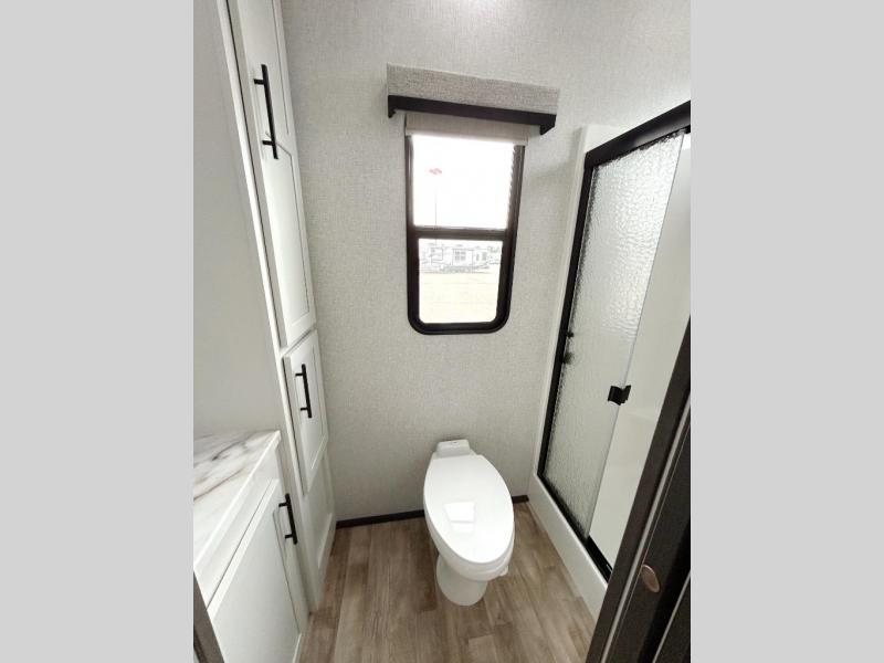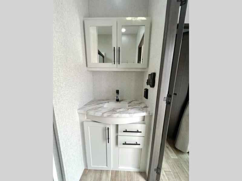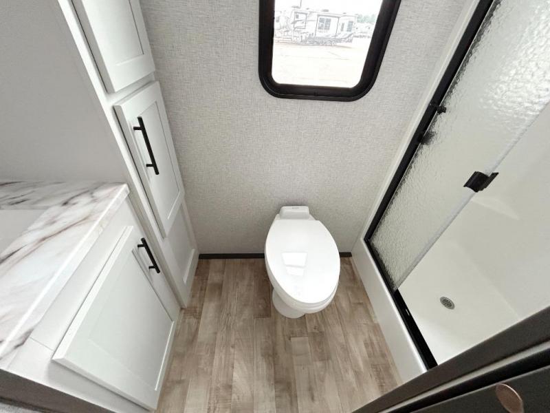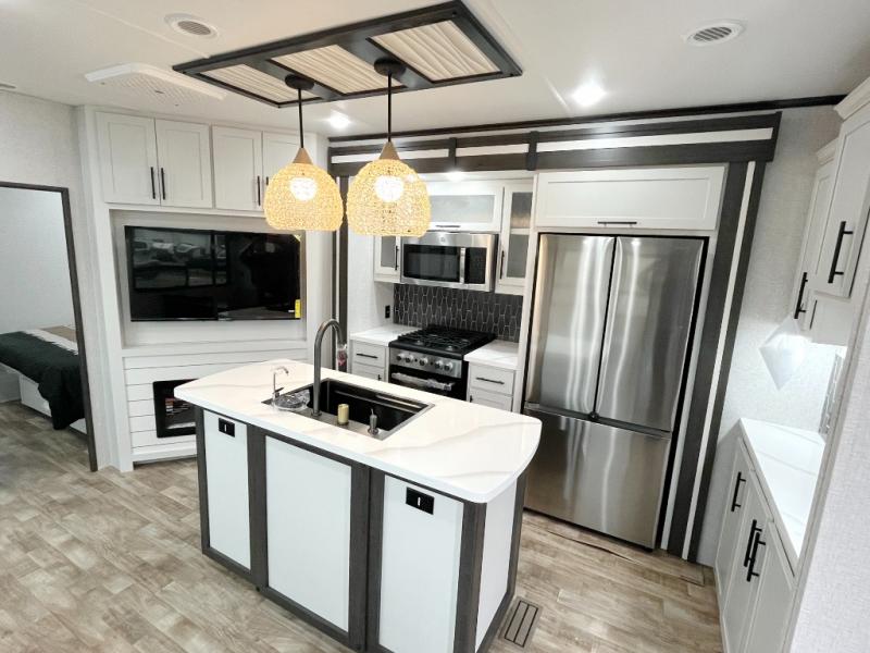 Wow! Check out this destination trailer with four slides, two private bedrooms, and two full baths! Now you can camp for longer periods of time and soak up the nature around you. The kitchen island includes plenty of counter space, a deep stainless steel sink for easy clean up, and a hutch for more storage. After dinner is cleaned up you can relax on the power theater seating in great view of the 50" TV, or you may just want to play a game of cards at the free-standing table with chairs and a bench seat.