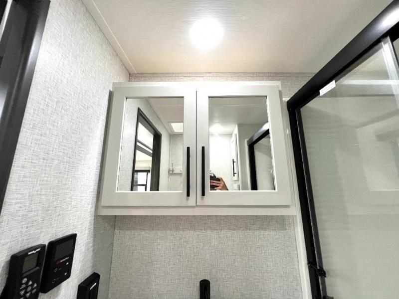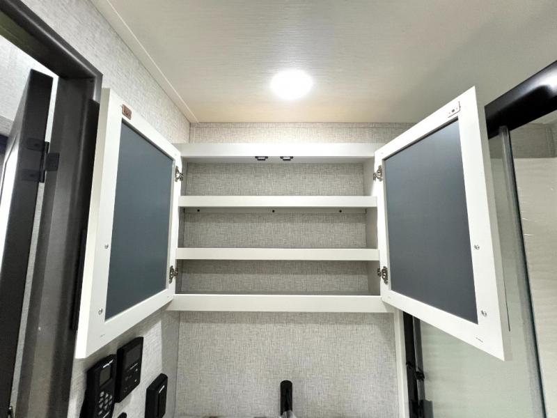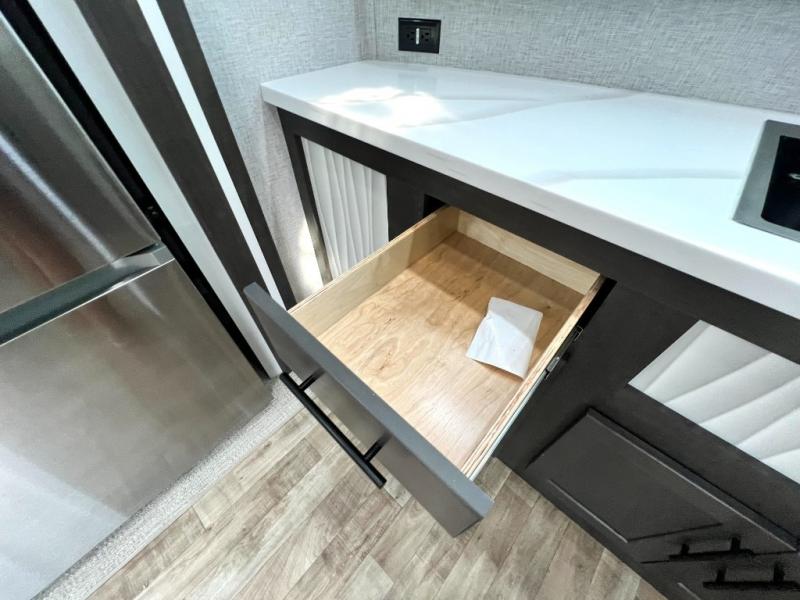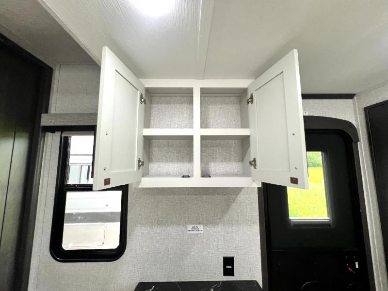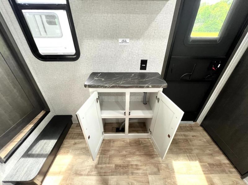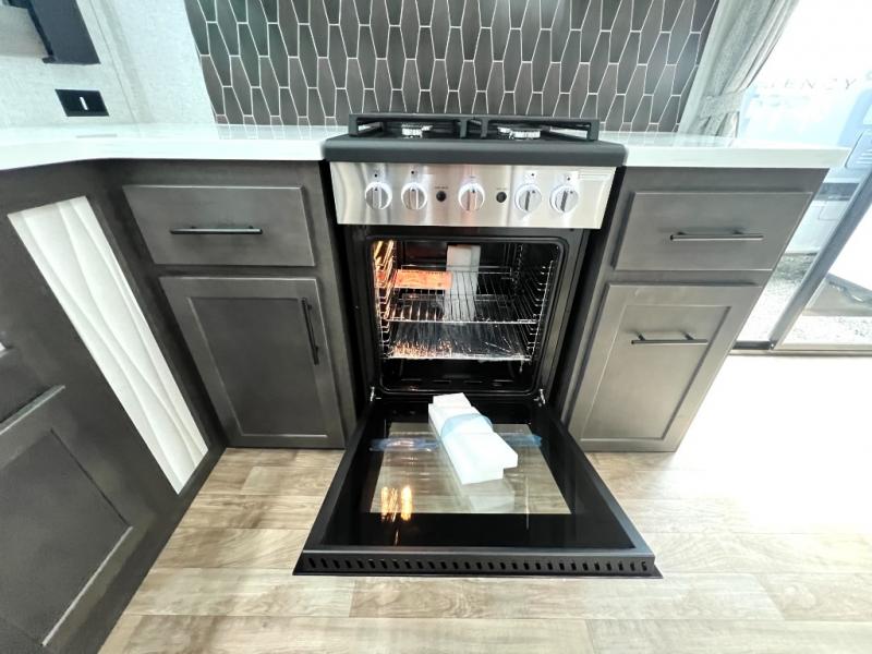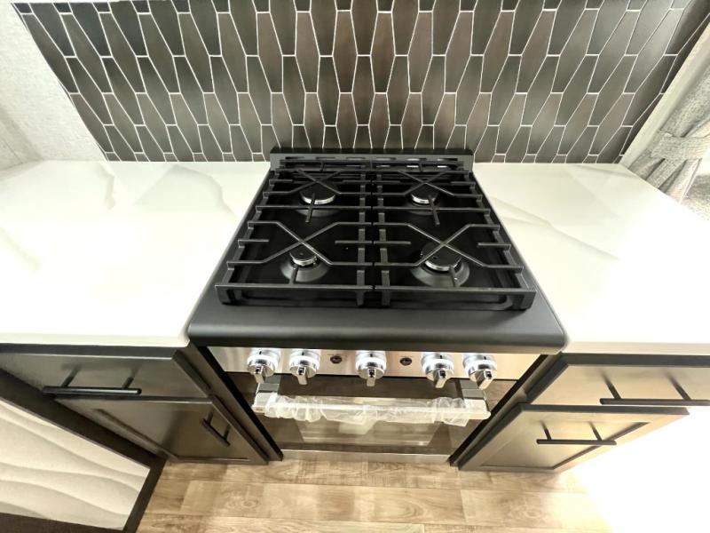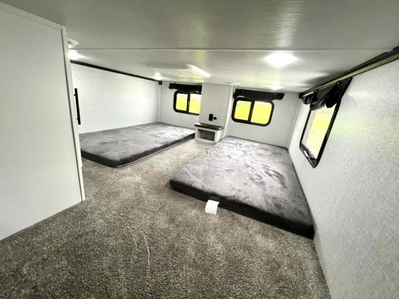 Are you looking for a destination trailer that can fit your whole crew? Look no further than this unit with four slides, three bunk mats in the loft areas, plus a spacious full bath that will allow everyone to stay clean each day. The front kitchen is any chef's dream with its ample counter space, pantry/cabinet, residential four burner range, and residential refrigerator. After dinner is cleaned up, everyone can meet in the middle living area to watch a movie on the 50" TV, and the fireplace here will make it feel more like home.
