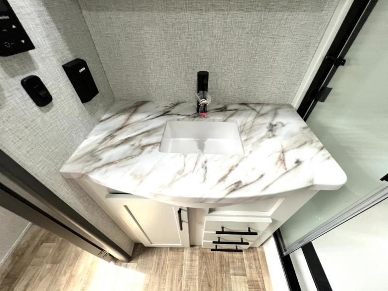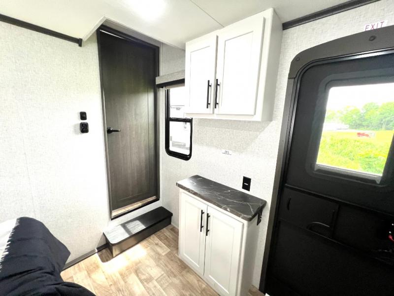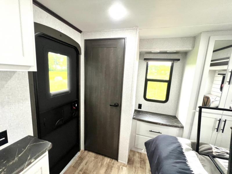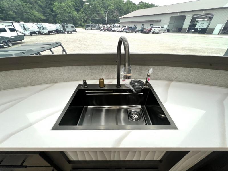Each Hampton destination trailer by CrossRoads RV includes a one-piece fiberglass front cap, tinted glass windows, and an outside faucet that will surely come in handy when wanting to rinse off your hands or even shoes after exploring outdoors. Each is constructed with a fiberglass roof and floor insulation with radiant tech foil, an enclosed underbelly, and severe weather welded mounts and rain gutters along the entire roof line. And, the Convenience package that comes standard includes KeyTV, a microwave, a quilted bedspread, a power vent in the bathroom, and more. Other interior features offered include decorative accent lighting, a 9-foot floor to ceiling height, a patio door with a swing-out assist rail, and two-toned wood fascia. So choose your destination, select your favorite Hampton, and start feeling at home when you are actually on vacation!