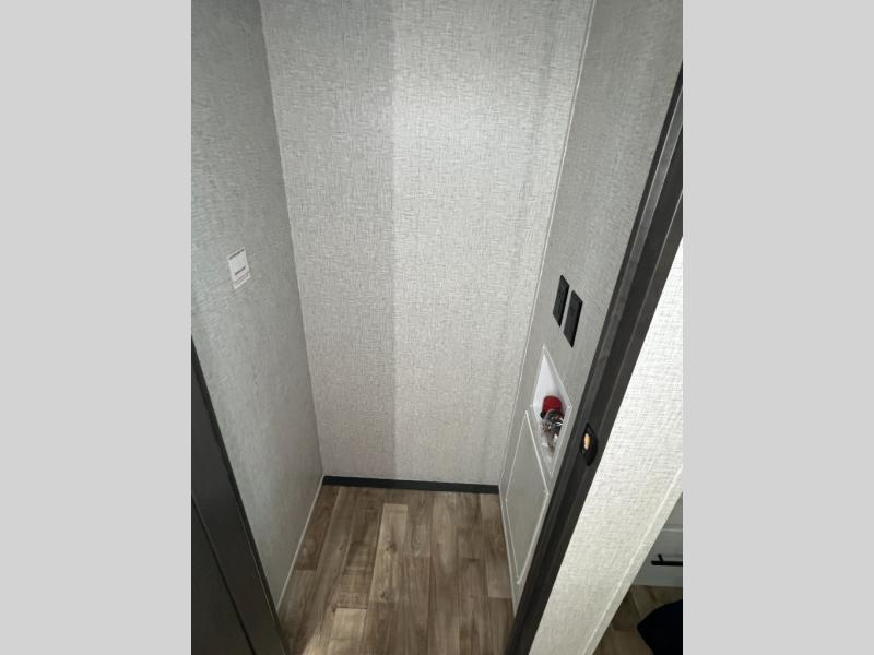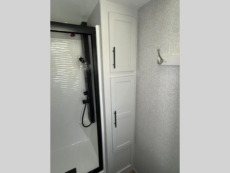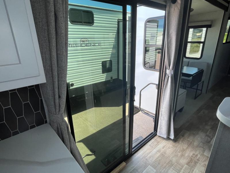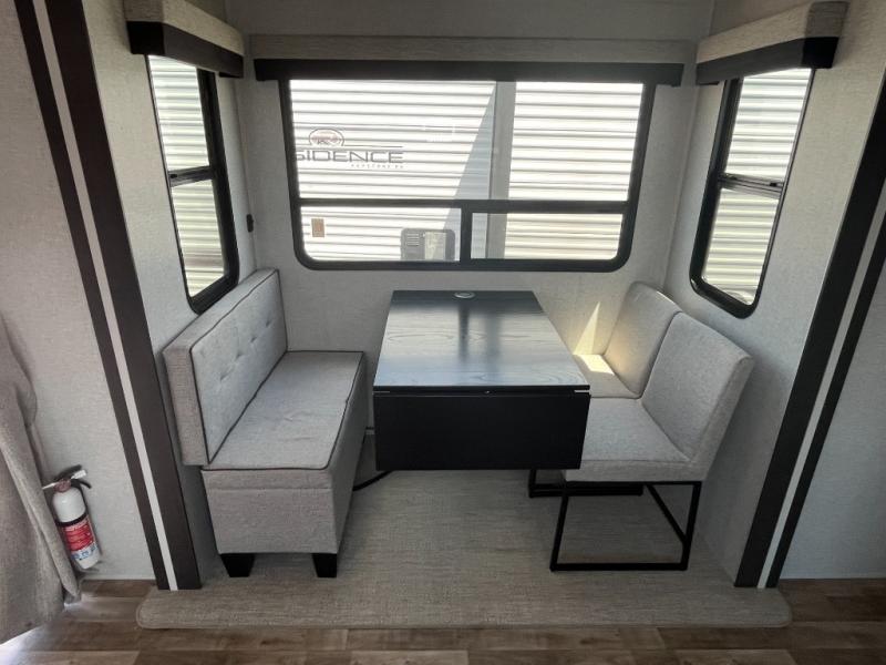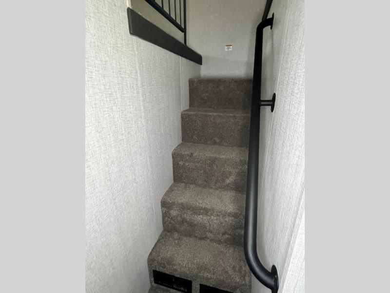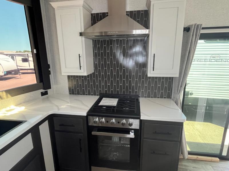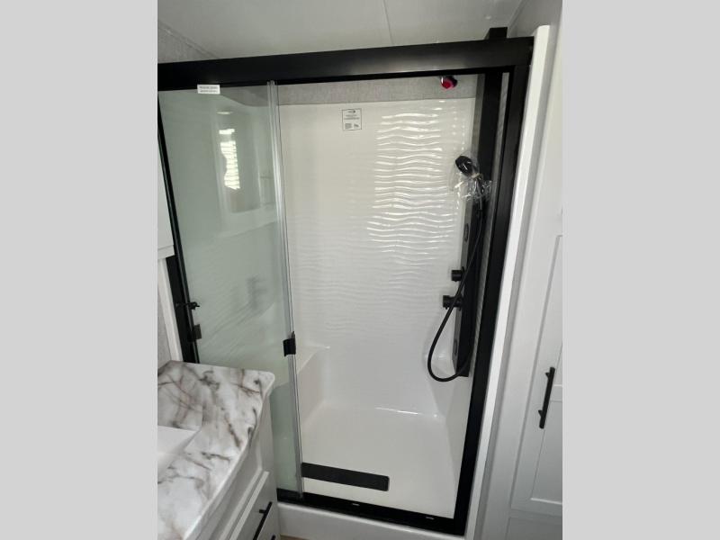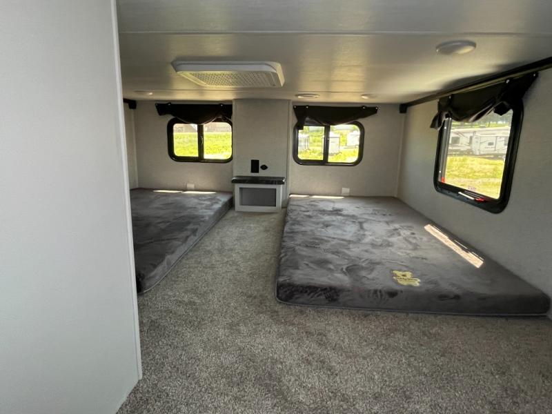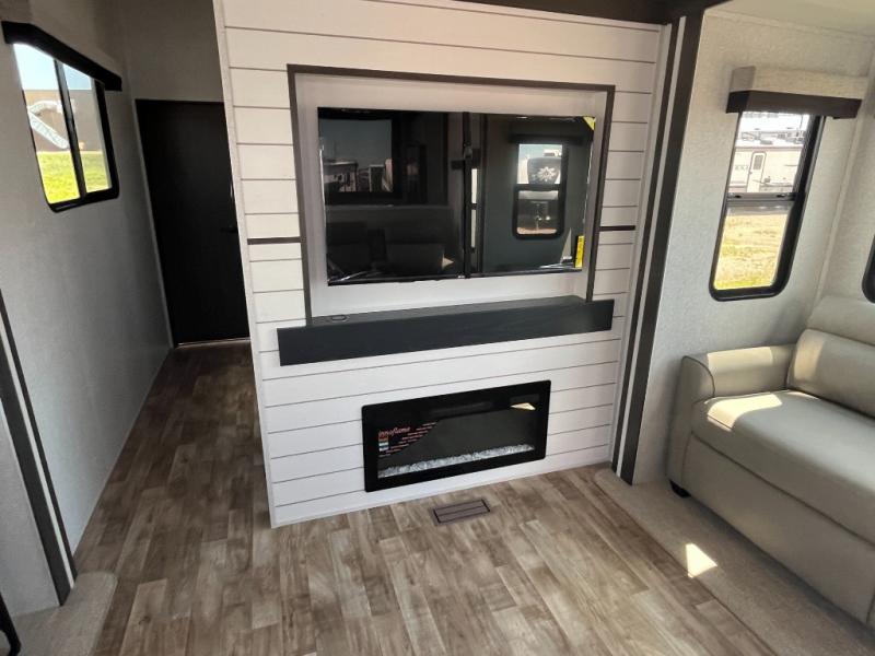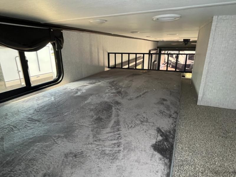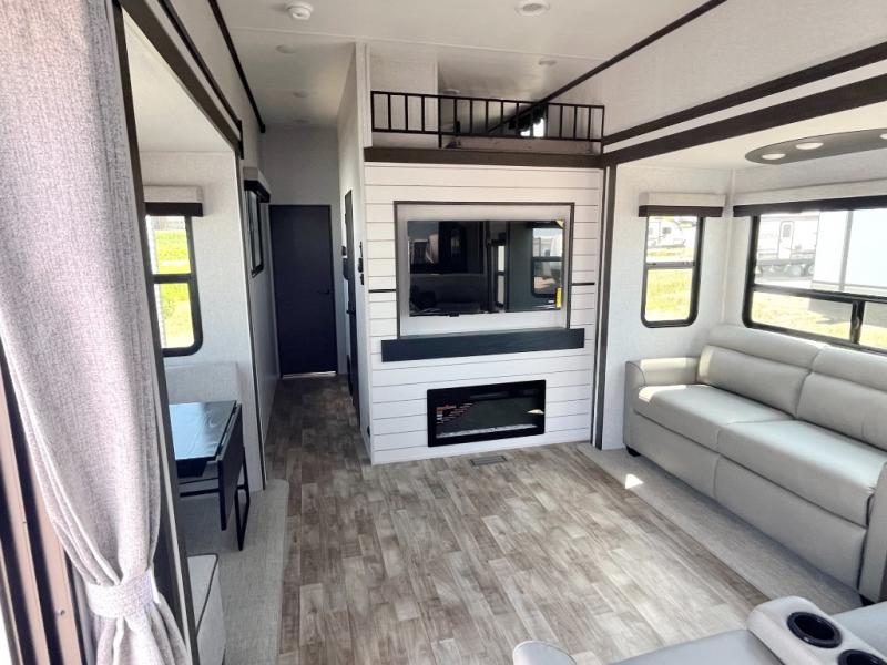 Are you looking for a destination trailer that can fit your whole crew? Look no further than this unit with four slides, three bunk mats in the loft areas, plus a spacious full bath that will allow everyone to stay clean each day. The front kitchen is any chef's dream with its ample counter space, pantry/cabinet, residential four burner range, and residential refrigerator. After dinner is cleaned up, everyone can meet in the middle living area to watch a movie on the 50" TV, and the fireplace here will make it feel more like home.