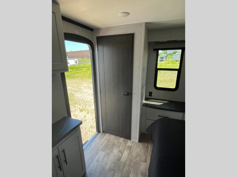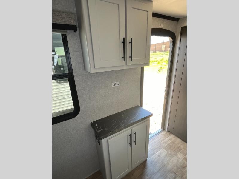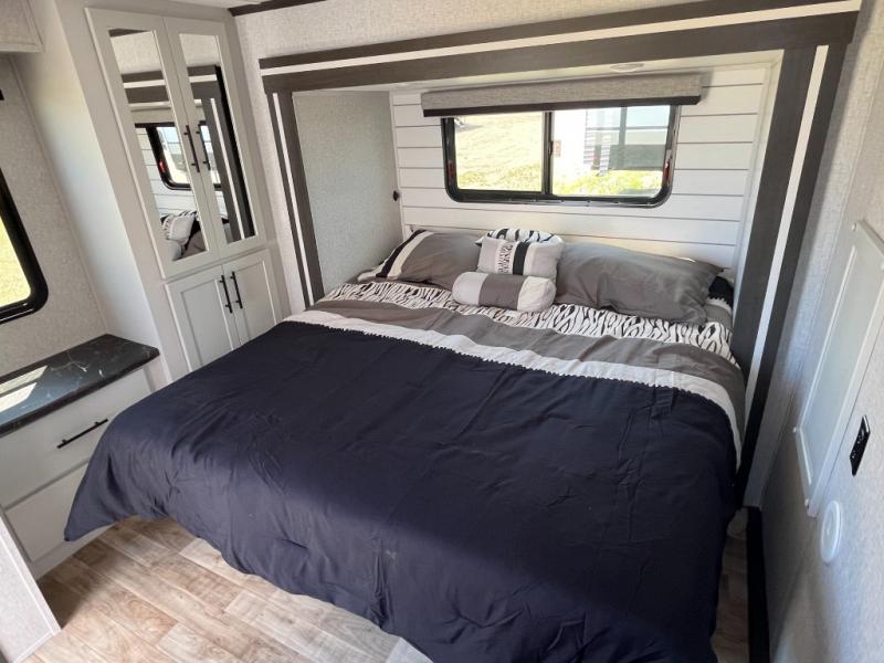 Each Hampton destination trailer by CrossRoads RV includes a one-piece fiberglass front cap, tinted glass windows, and an outside faucet that will surely come in handy when wanting to rinse off your hands or even shoes after exploring outdoors. Each is constructed with a fiberglass roof and floor insulation with radiant tech foil, an enclosed underbelly, and severe weather welded mounts and rain gutters along the entire roof line. And, the Convenience package that comes standard includes KeyTV, a microwave, a quilted bedspread, a power vent in the bathroom, and more. Other interior features offered include decorative accent lighting, a 9-foot floor to ceiling height, a patio door with a swing-out assist rail, and two-toned wood fascia. So choose your destination, select your favorite Hampton, and start feeling at home when you are actually on vacation!