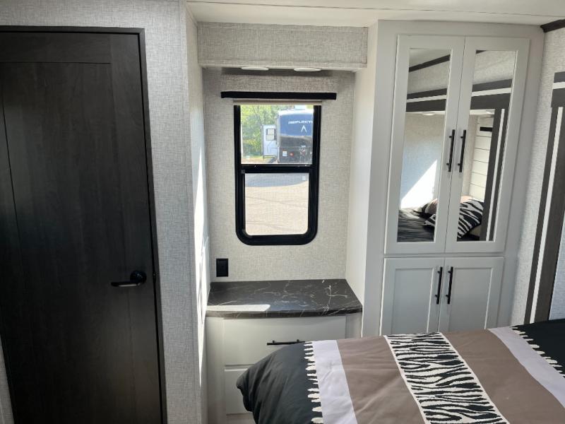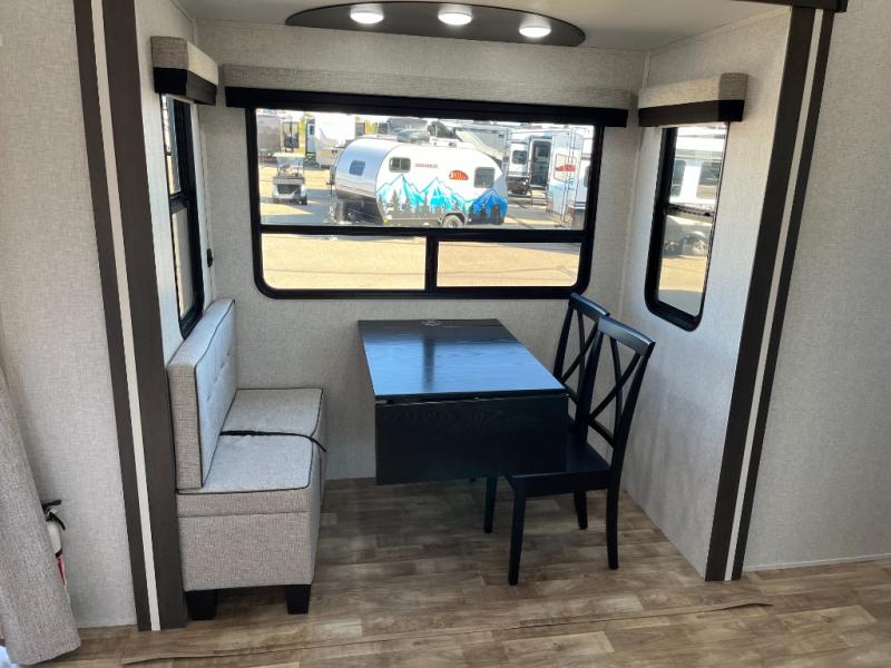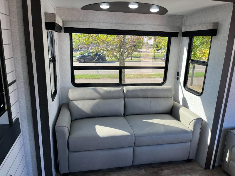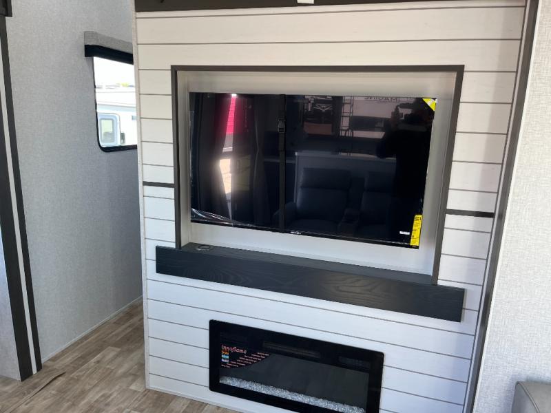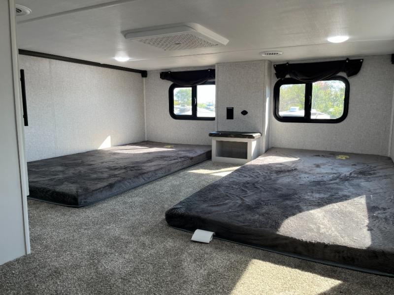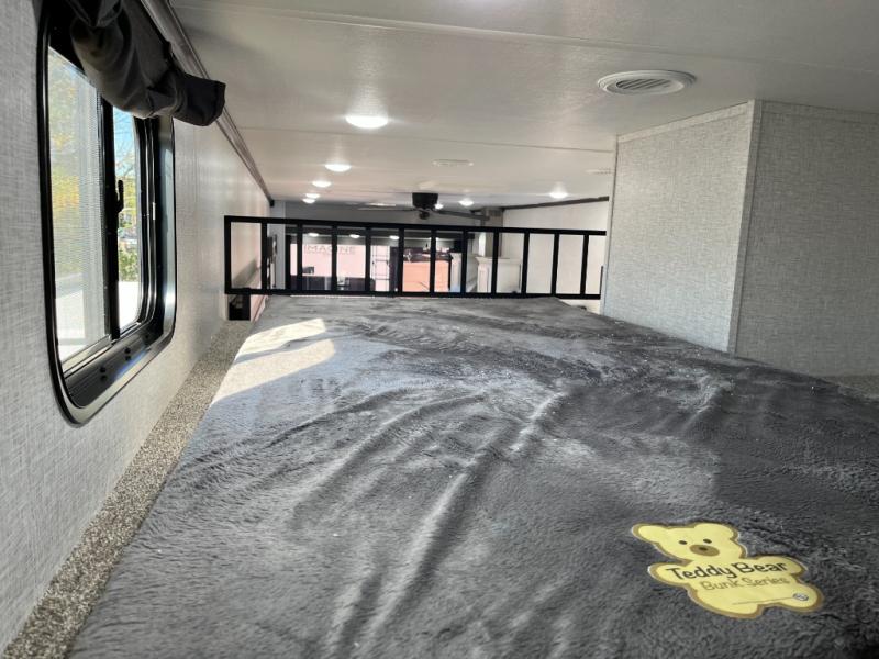 Are you looking for a destination trailer that can fit your whole crew? Look no further than this unit with four slides, three bunk mats in the loft areas, plus a spacious full bath that will allow everyone to stay clean each day. The front kitchen is any chef's dream with its ample counter space, pantry/cabinet, residential four burner range, and residential refrigerator. After dinner is cleaned up, everyone can meet in the middle living area to watch a movie on the 50" TV, and the fireplace here will make it feel more like home.