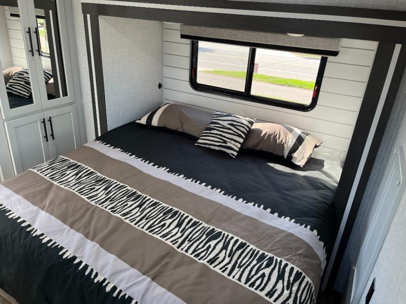 Each Hampton destination trailer by CrossRoads RV includes a one-piece fiberglass front cap, tinted glass windows, and an outside faucet that will surely come in handy when wanting to rinse off your hands or even shoes after exploring outdoors. Each is constructed with a fiberglass roof and floor insulation with radiant tech foil, an enclosed underbelly, and severe weather welded mounts and rain gutters along the entire roof line. And, the Convenience package that comes standard includes KeyTV, a microwave, a quilted bedspread, a power vent in the bathroom, and more. Other interior features offered include decorative accent lighting, a 9-foot floor to ceiling height, a patio door with a swing-out assist rail, and two-toned wood fascia. So choose your destination, select your favorite Hampton, and start feeling at home when you are actually on vacation!