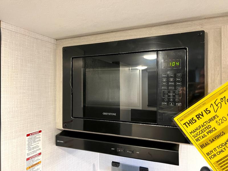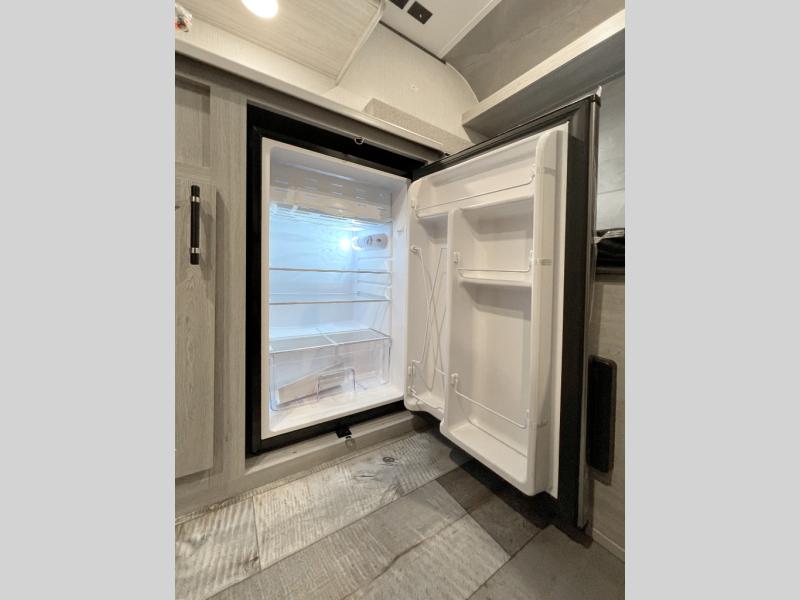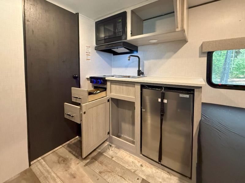Equipped for Convenience: The well-appointed kitchen includes a 2-burner cooktop and 3 cu?ft 12V refrigerator, offering meal prep that’s simple and efficient.