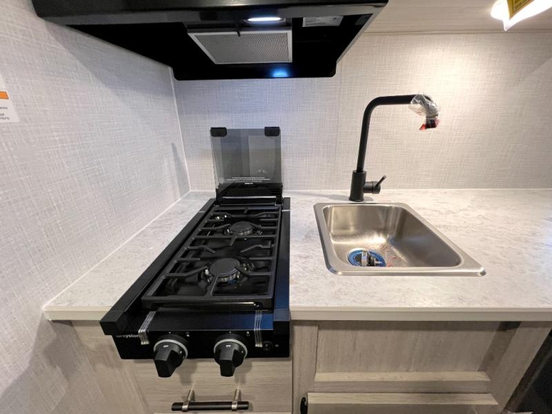 Equipped for Convenience: The well-appointed kitchen includes a 2-burner cooktop and 3 cu?ft 12V refrigerator, offering meal prep that’s simple and efficient.