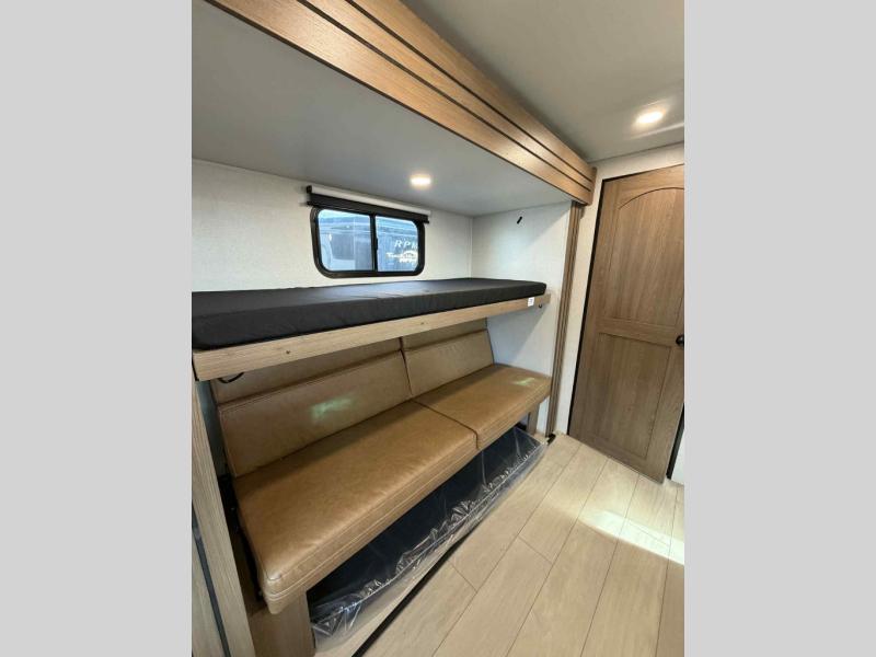 The Sunset Trail 331BH combines spacious living with family-friendly features. The floorplan includes 2 bunk beds, a king bed, and versatile seating options including a tri-fold sofa and an extra-large booth dinette. This floorplan has everyone on your trip in mind.