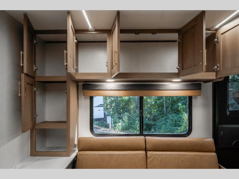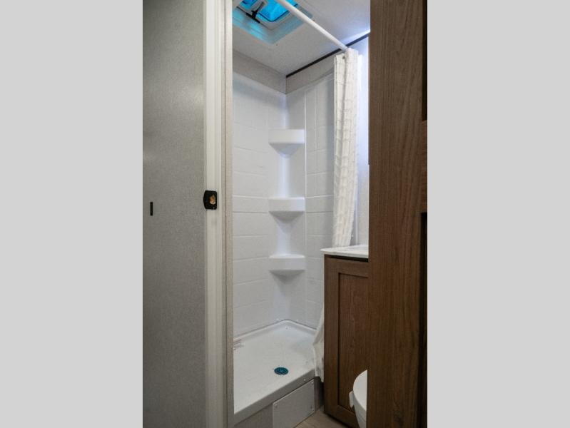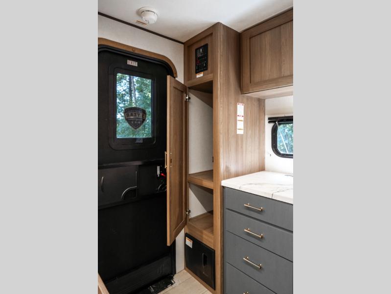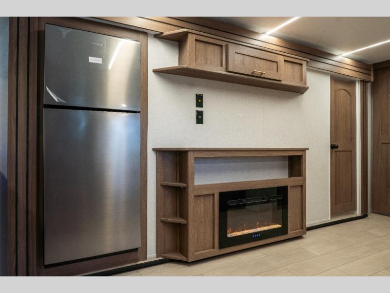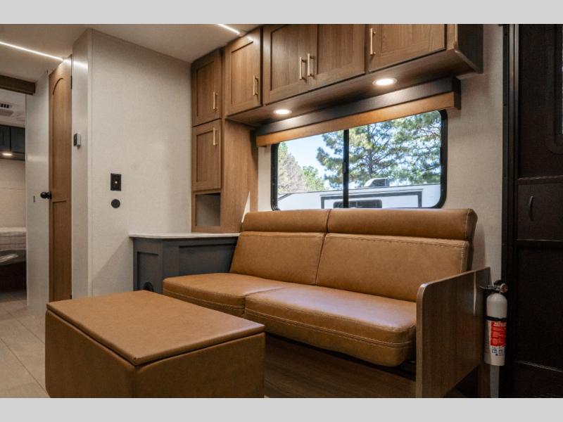 The full kitchen comes equipped with modern appliances, including a stainless steel refrigerator, microwave, and three-burner cooktop, making meal prep effortless on the road. The convertible dinette and sofa provide flexible seating and extra sleeping space, while the entertainment center keeps everyone entertained during downtime.