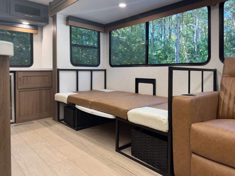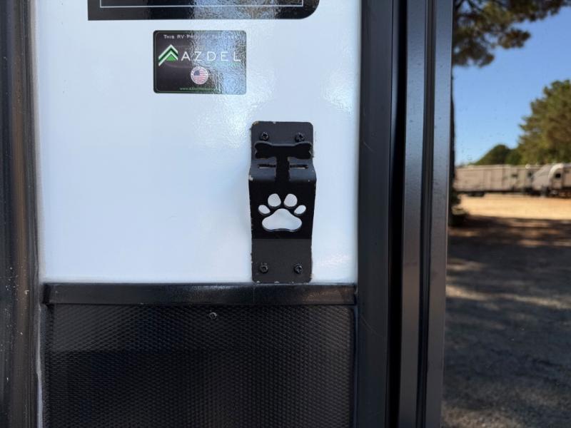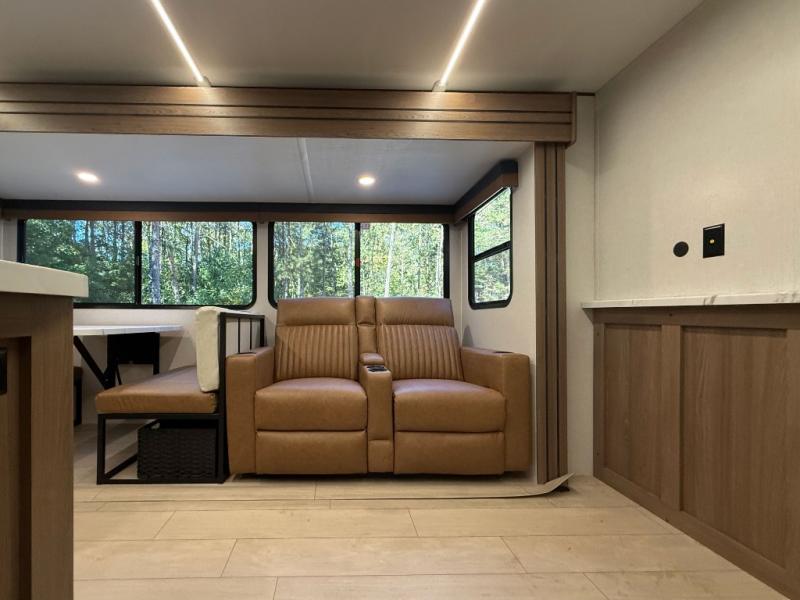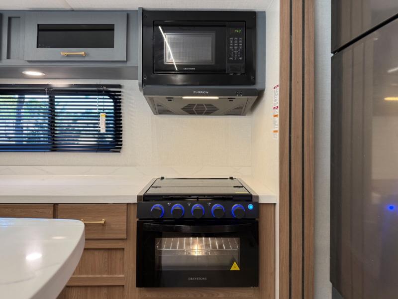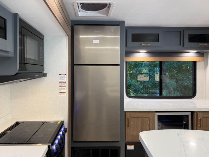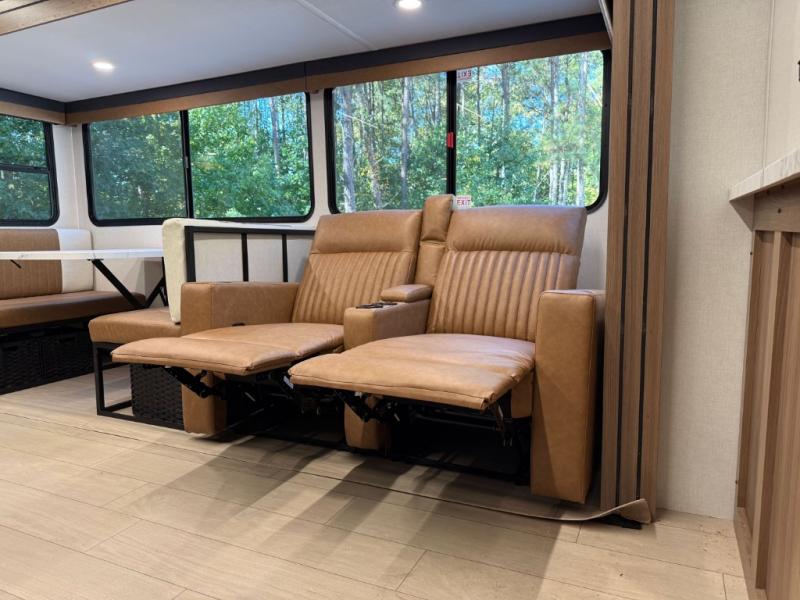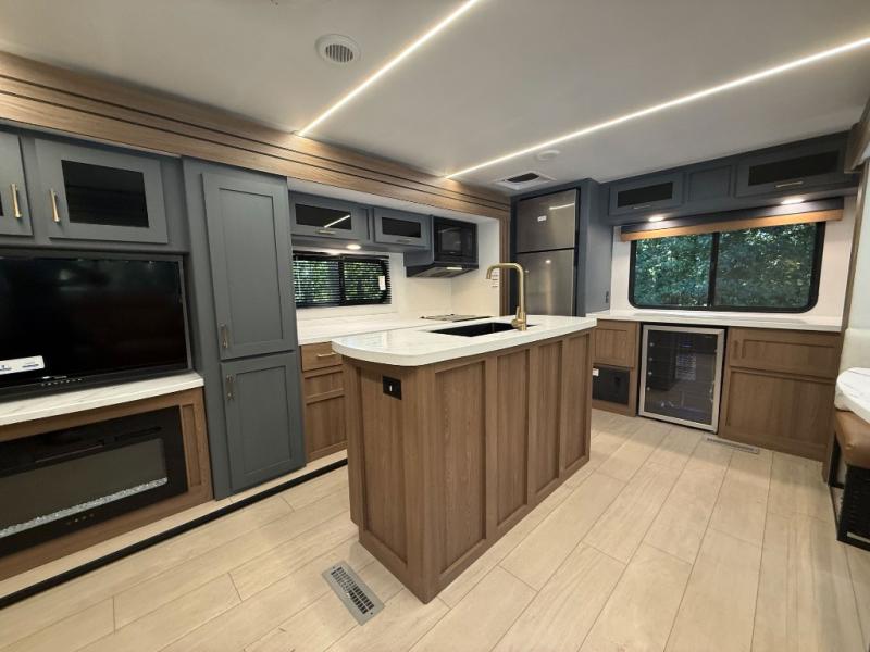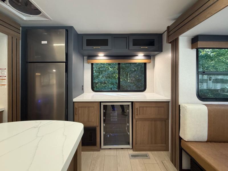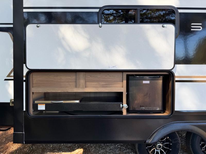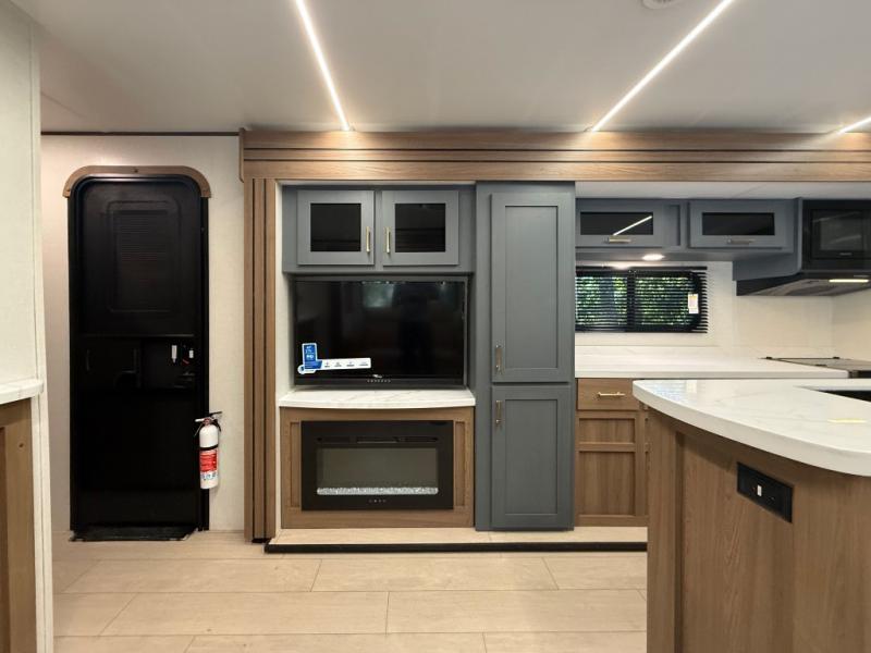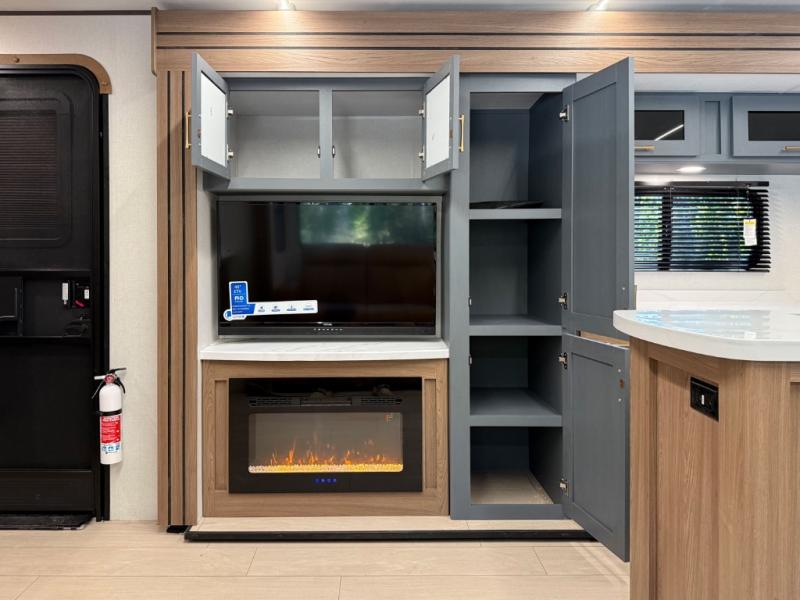 What could be more comfortable than a king bed, dual opposing slides for added space, plus an exterior camp kitchen? You will get all that and more when you choose this spacious travel trailer. The chef of the family will love the kitchen island for added space to cook and clean up, and there is plenty of rear counter space to set out fresh fruits and veggies. The tri-fold sofa sits directly across from the fireplace for a cozy evening indoors, and if you're not needing the extra sleeping space you can choose the optional theater seating in place of the tri-fold sofa. You will truly feel at home in the front private bedroom that includes a king bed, dual wardrobes, plus a third wardrobe in the closet. There is even a pet station that will make camping with your dog easier than ever!