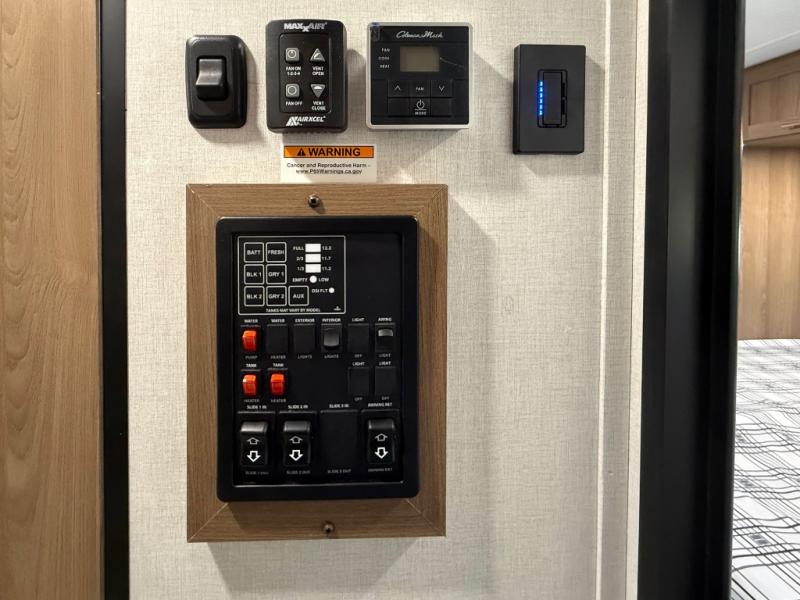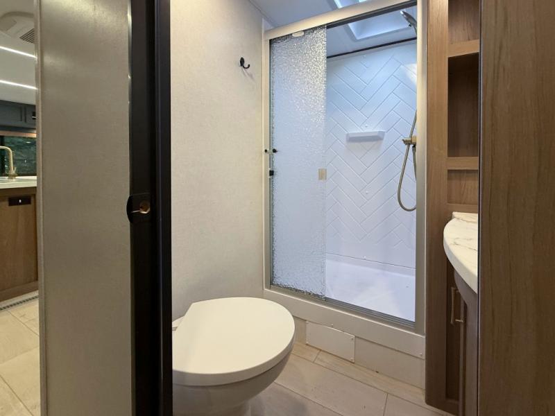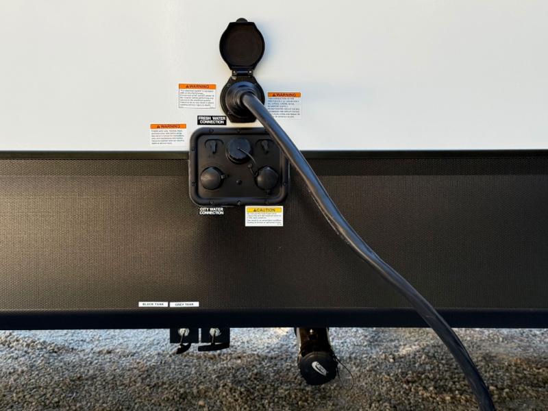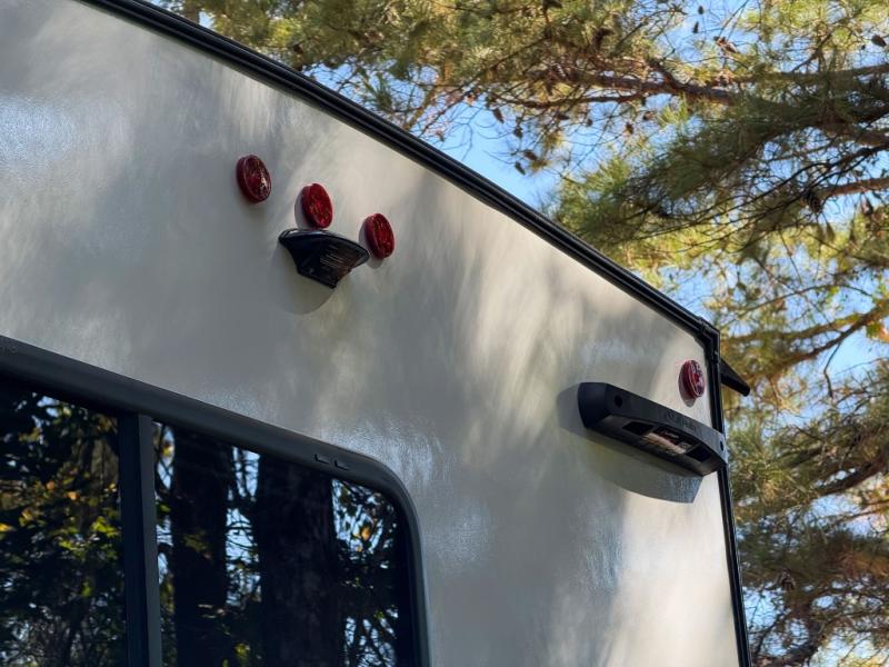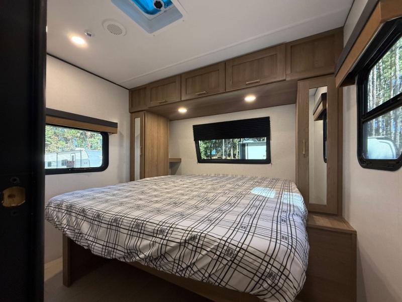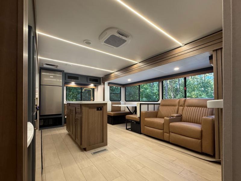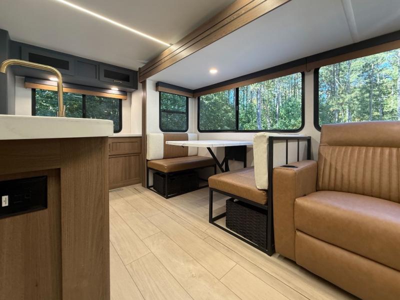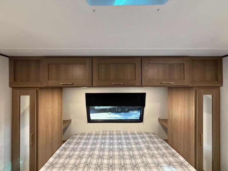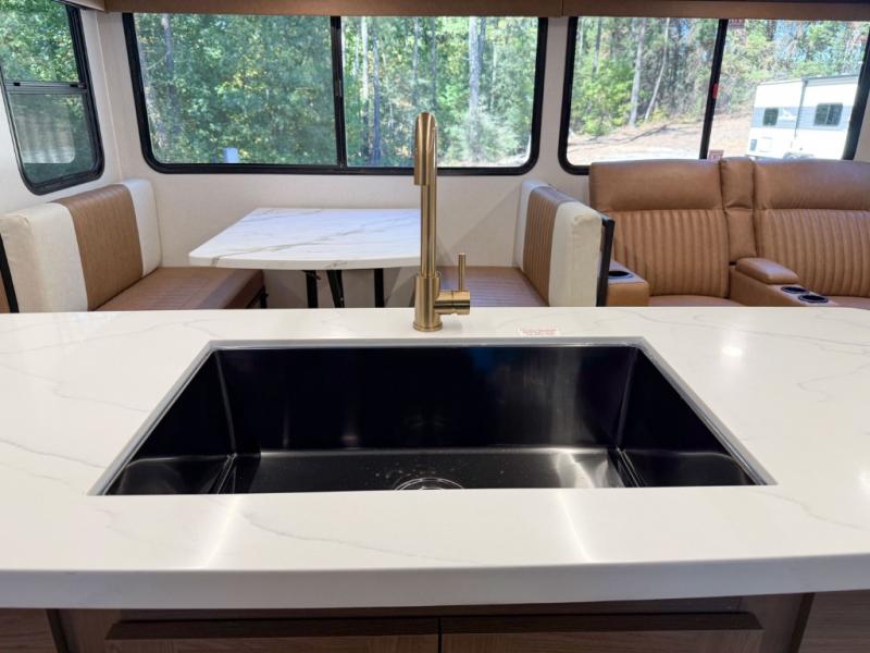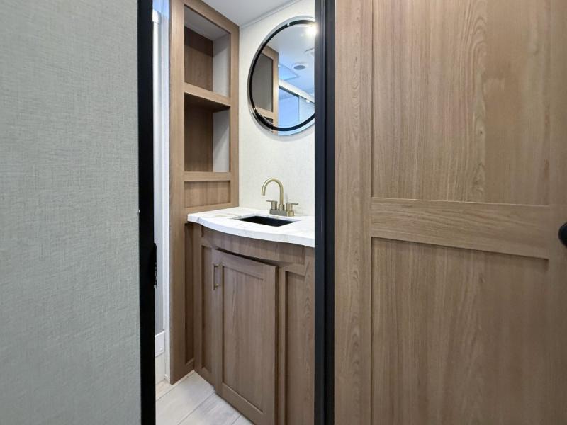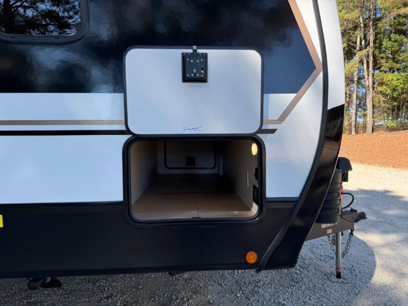 What could be more comfortable than a king bed, dual opposing slides for added space, plus an exterior camp kitchen? You will get all that and more when you choose this spacious travel trailer. The chef of the family will love the kitchen island for added space to cook and clean up, and there is plenty of rear counter space to set out fresh fruits and veggies. The tri-fold sofa sits directly across from the fireplace for a cozy evening indoors, and if you're not needing the extra sleeping space you can choose the optional theater seating in place of the tri-fold sofa. You will truly feel at home in the front private bedroom that includes a king bed, dual wardrobes, plus a third wardrobe in the closet. There is even a pet station that will make camping with your dog easier than ever!