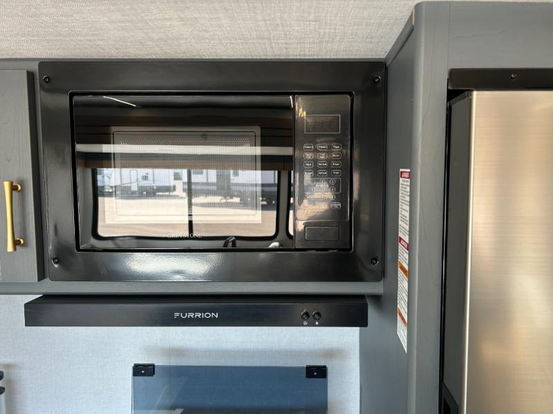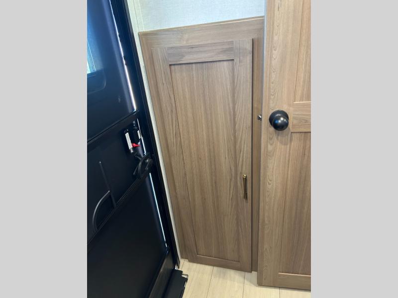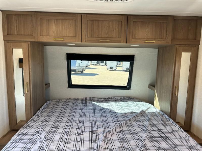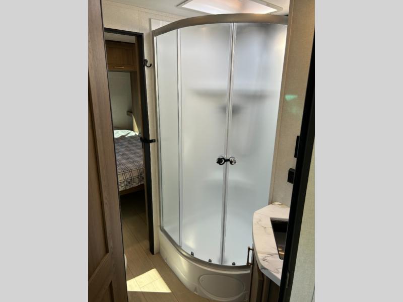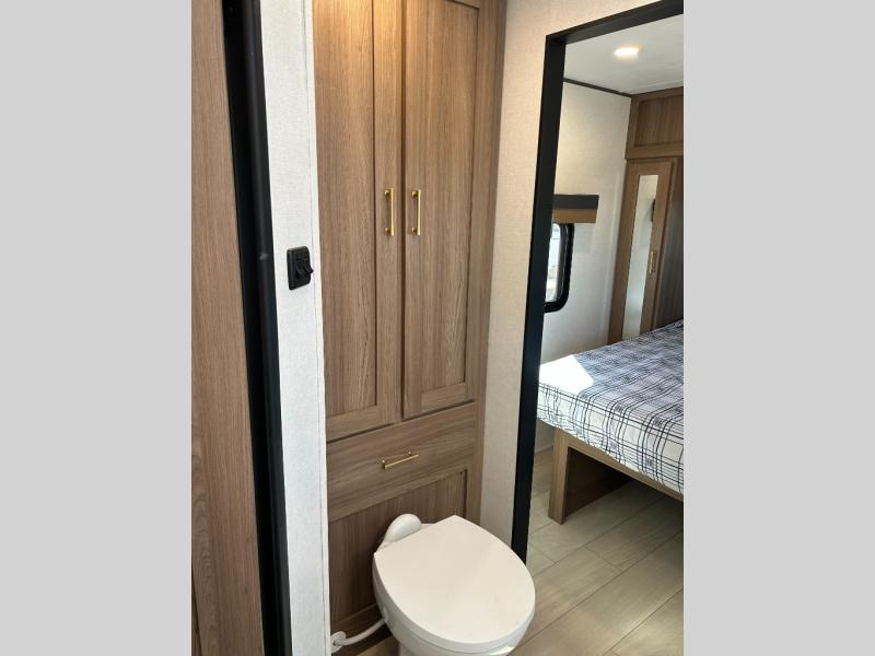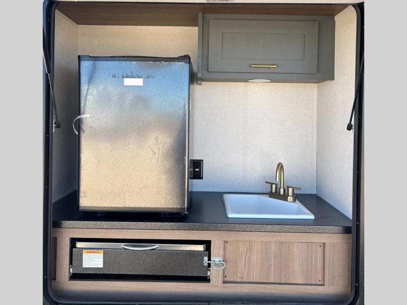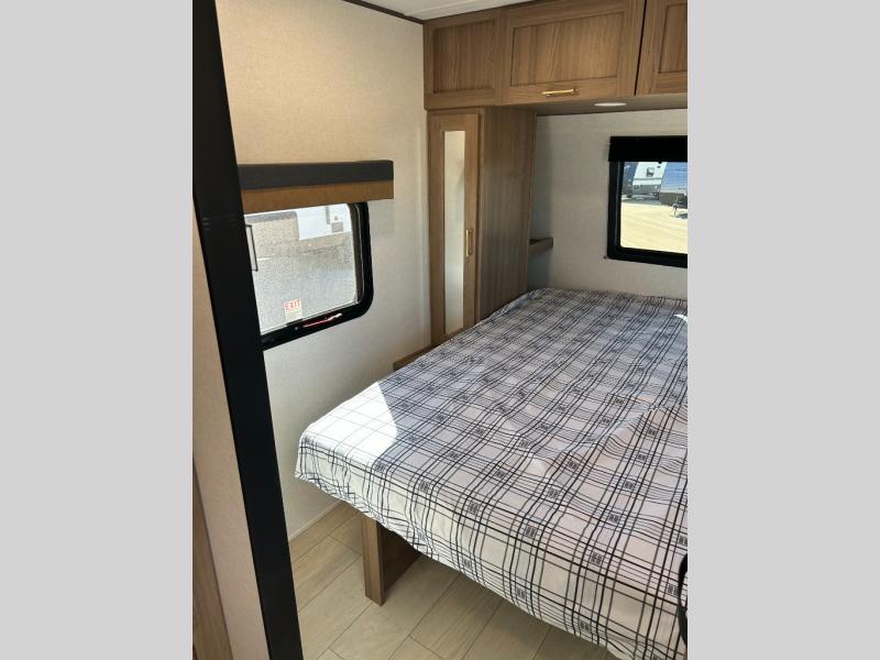 This travel trailer is packed with convenient features and luxury comforts for a camping trip you won't soon forget. Once you arrive at the campground, put out the electric awning and make a quick lunch on the exterior camp kitchen. The kitchen island inside will be the perfect place to cut up all the fixings for the burgers and you can grab the chips from the pantry. The kids will love the private bunkhouse that includes two bunks, a jackknife sofa with a kick, plus a dual entry half bath for convenience. The full walk-through bath will create a front master bedroom you are sure to love. Here, the king bed will provide a great night's rest and there are dual wardrobes for all your clothes.