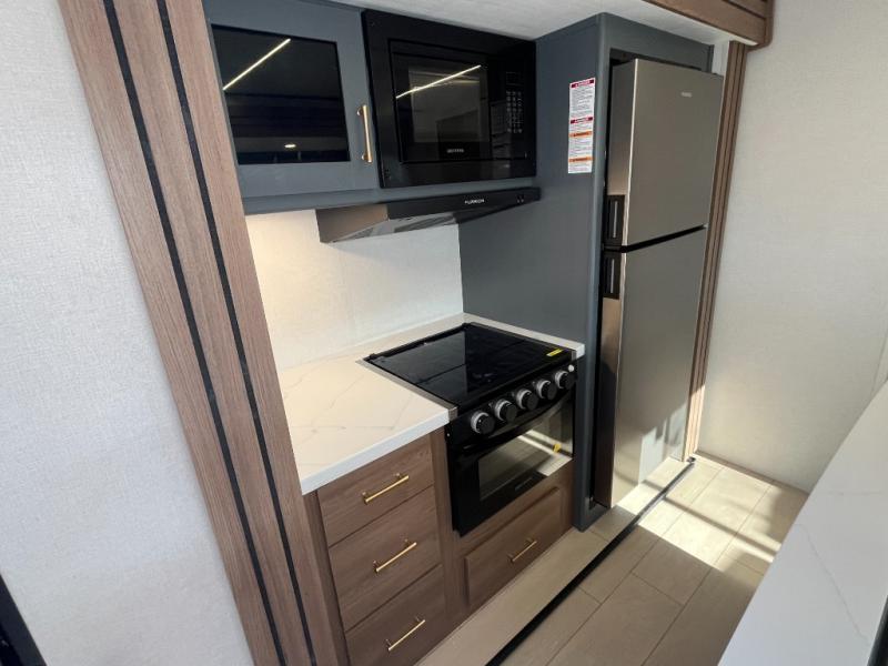 This travel trailer is packed with convenient features and luxury comforts for a camping trip you won't soon forget. Once you arrive at the campground, put out the electric awning and make a quick lunch on the exterior camp kitchen. The kitchen island inside will be the perfect place to cut up all the fixings for the burgers and you can grab the chips from the pantry. The kids will love the private bunkhouse that includes two bunks, a jackknife sofa with a kick, plus a dual entry half bath for convenience. The full walk-through bath will create a front master bedroom you are sure to love. Here, the king bed will provide a great night's rest and there are dual wardrobes for all your clothes.