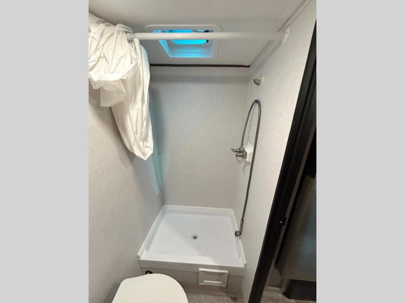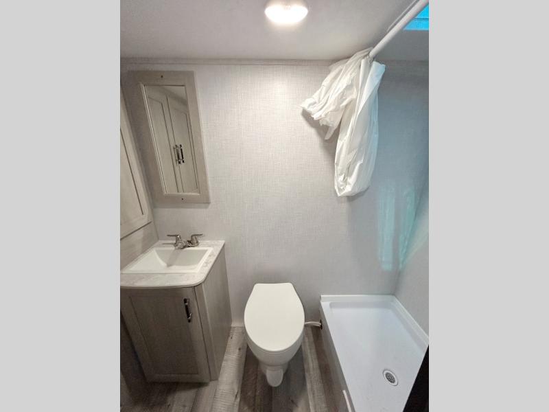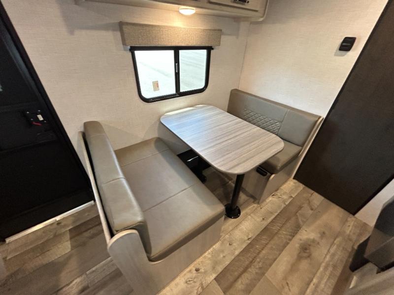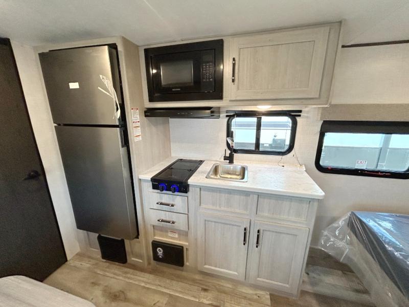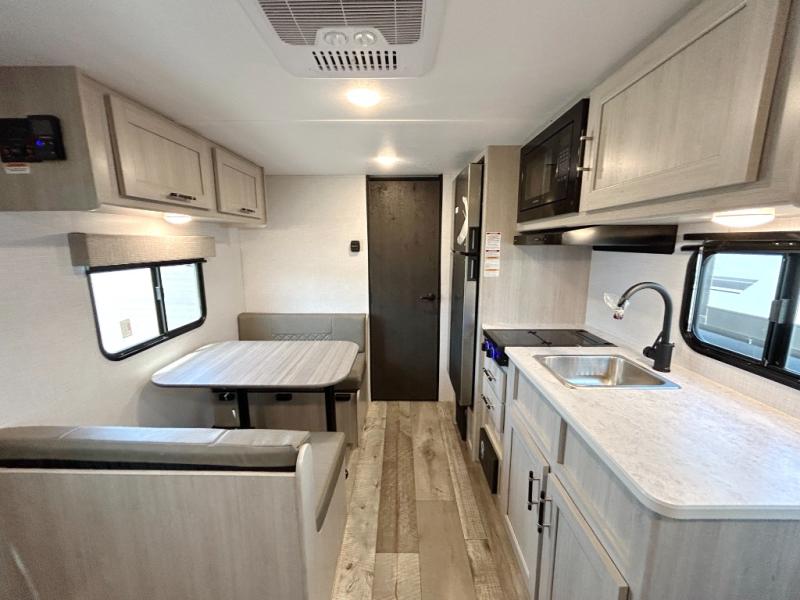 You'll love camping in this lightweight travel trailer for three! The walk-around queen bed up front includes dual beside closet plus overhead storage to keep your things tidy. A booth dinette provides a place to dine together, and you can convert this to additional sleeping space at night. You can prepare your meals on the two-burner cooktop or in the microwave oven, and there is a refrigerator plus overhead storage for food. The rear bath includes a shower, toilet and bath linen closet to keep clean towels close by!