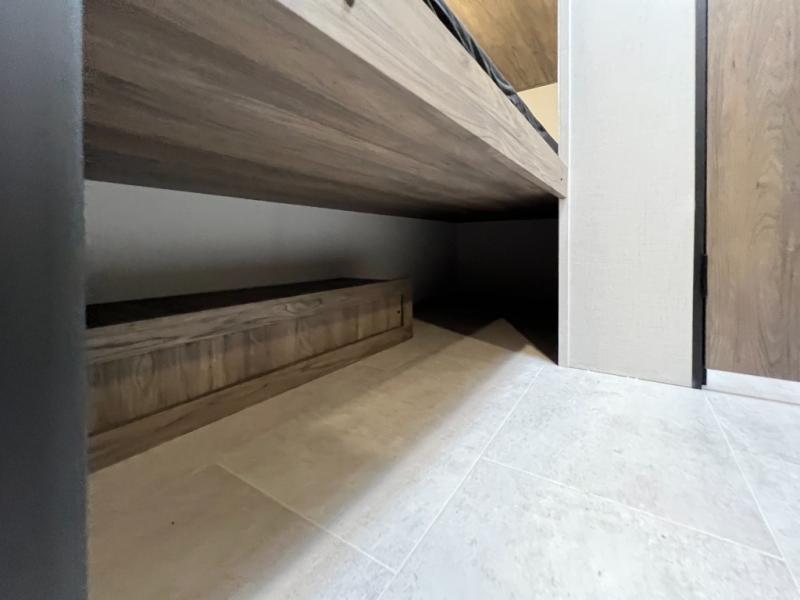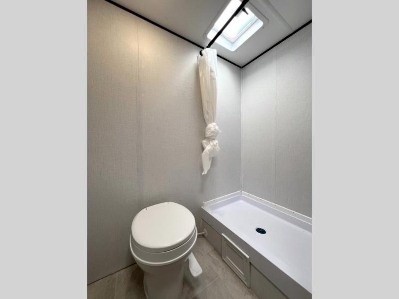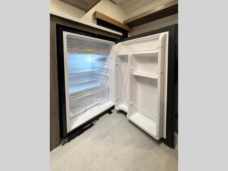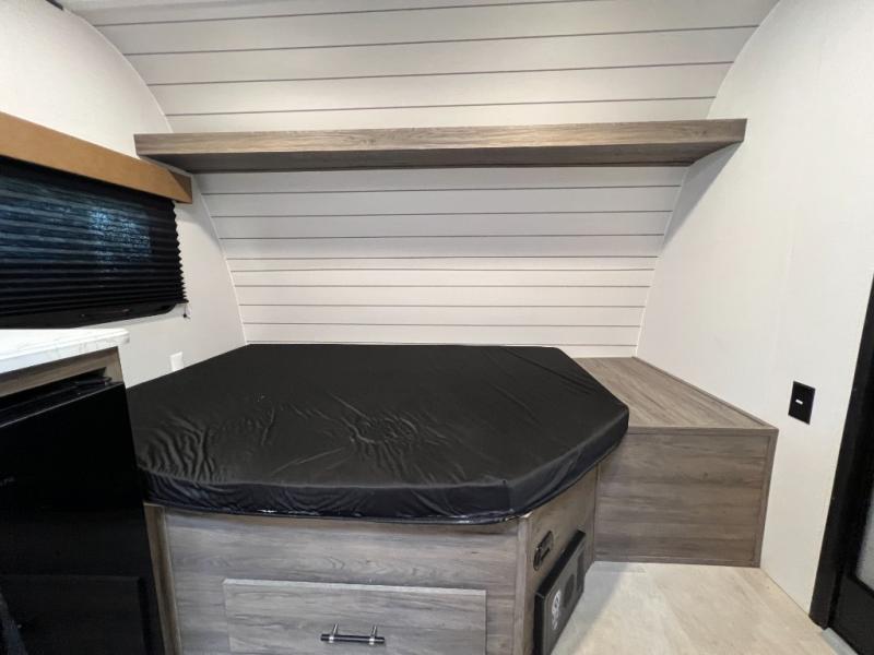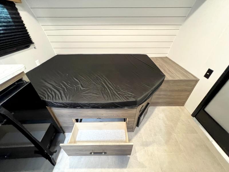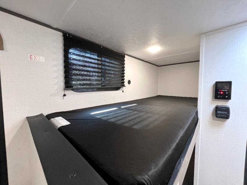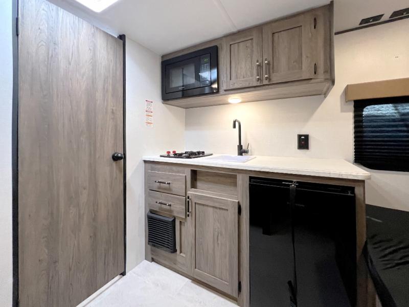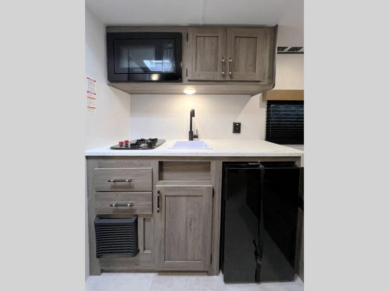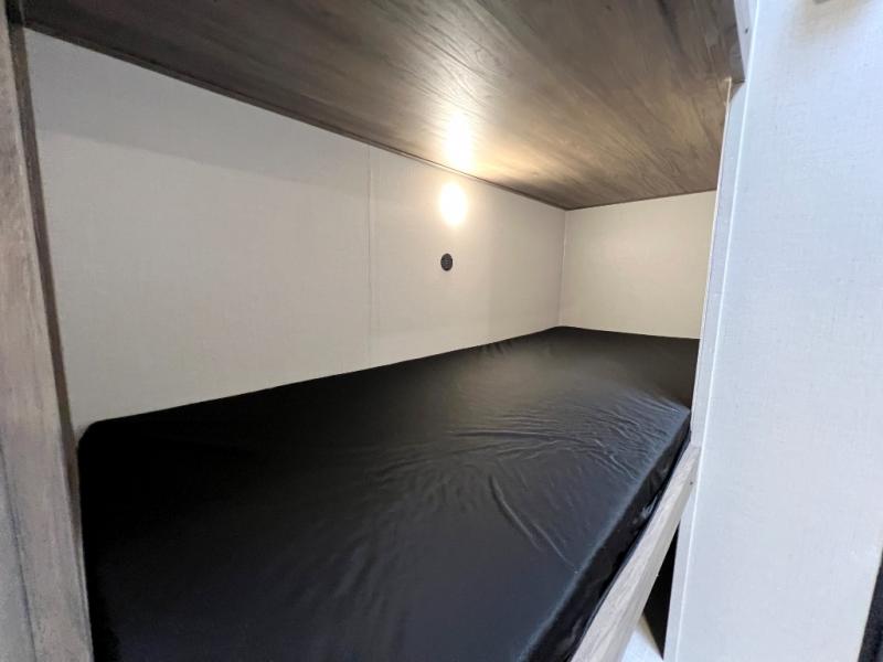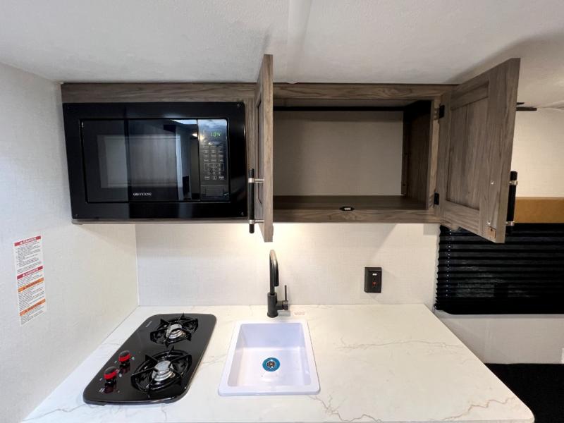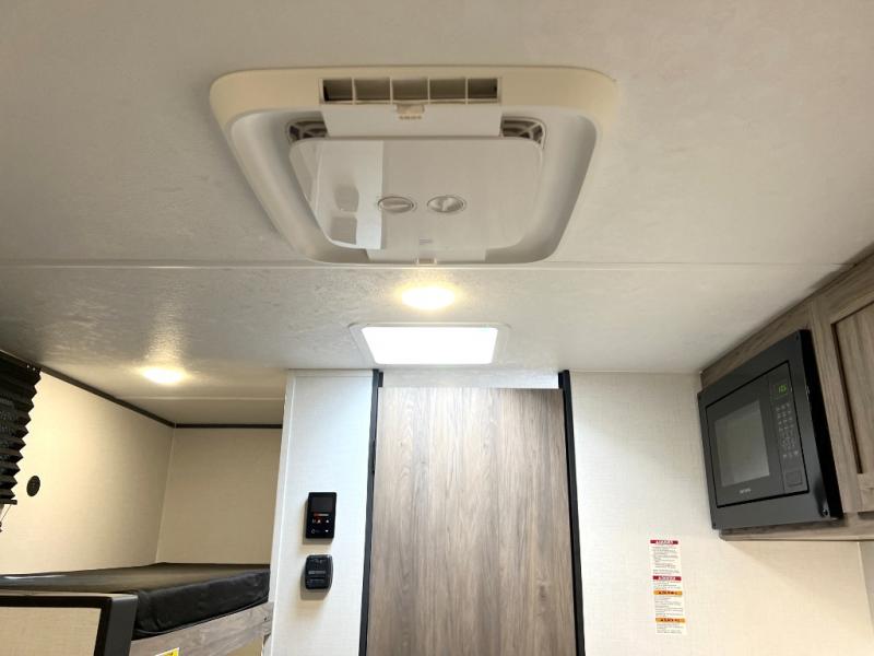 Inside, you’ll find a space-maximizing layout featuring bunk beds, a convertible dinette for extra sleeping space, and ample storage for gear. The modern kitchen is equipped with a 2-burner cooktop, microwave, and fridge, making meal prep on the go a breeze. Stay cool with the efficient A/C and enjoy year-round camping thanks to the Zinger’s insulated design and durable exterior.