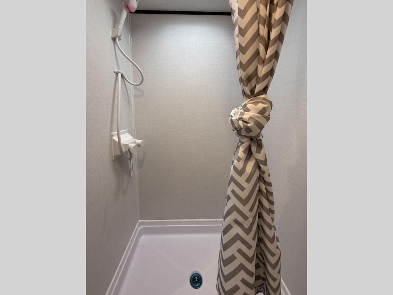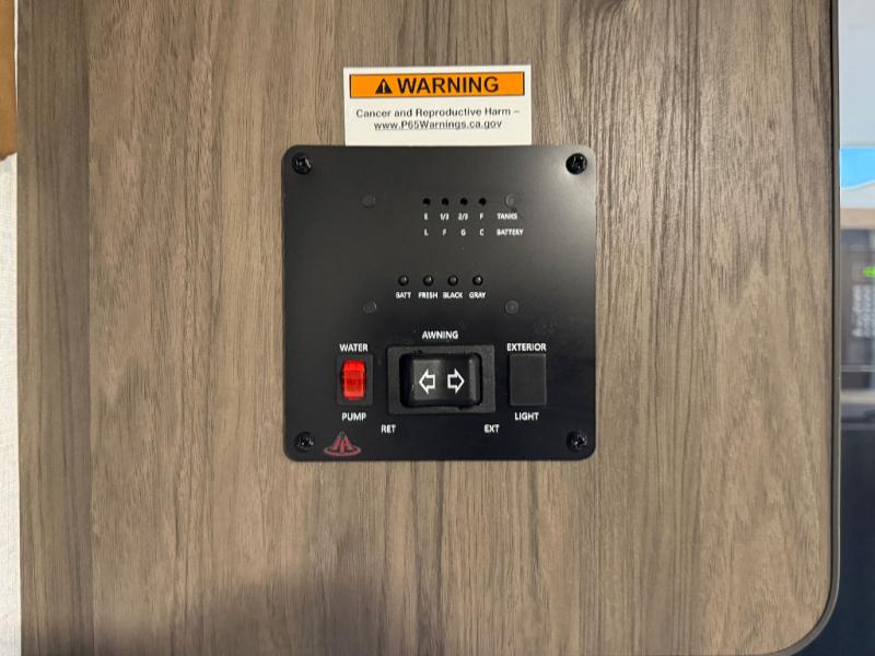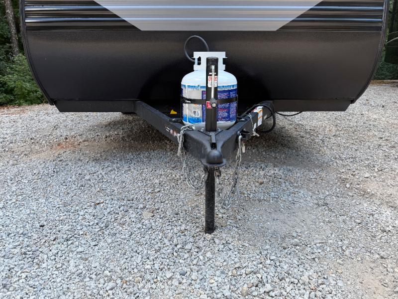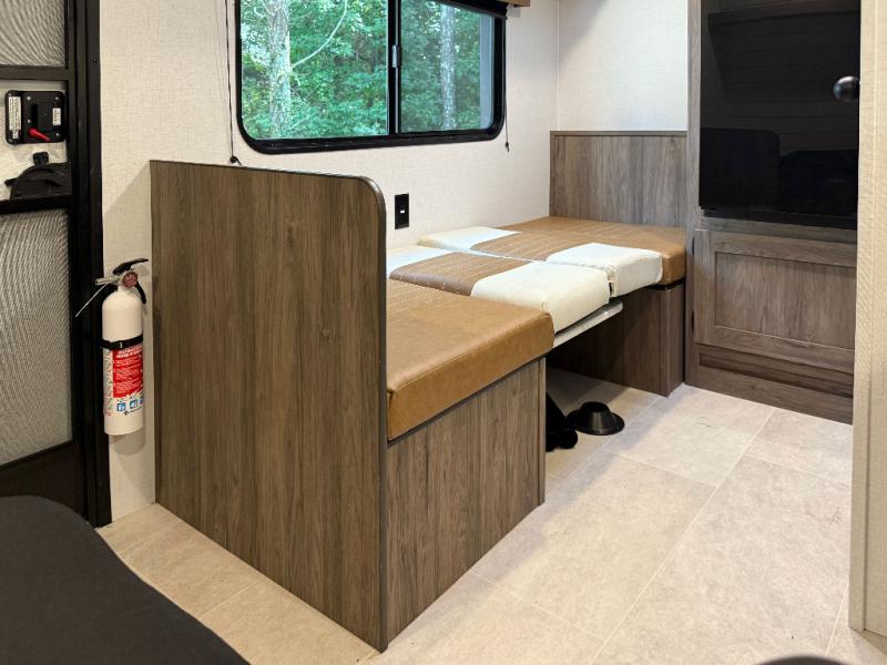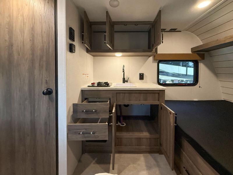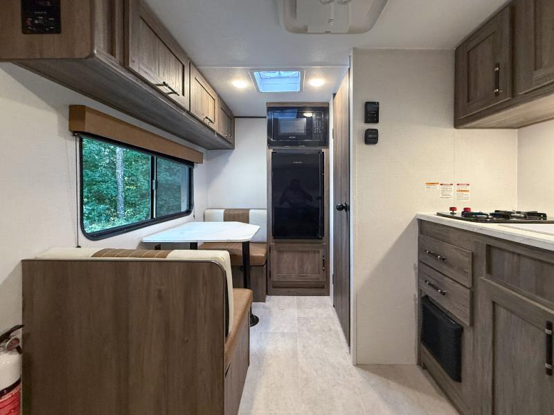 This compact, yet cozy travel trailer is perfect for weekend trips to the lake. There is a full-size bed up front with an overhead cabinet for your belongings. A functional kitchenette will let you make meals for your crew, and there is a booth dinette where you can dine together. There are also overhead cabinets above the dinette for snacks, board games and more!