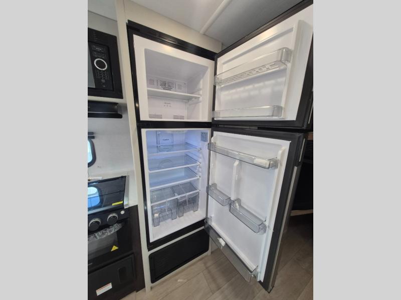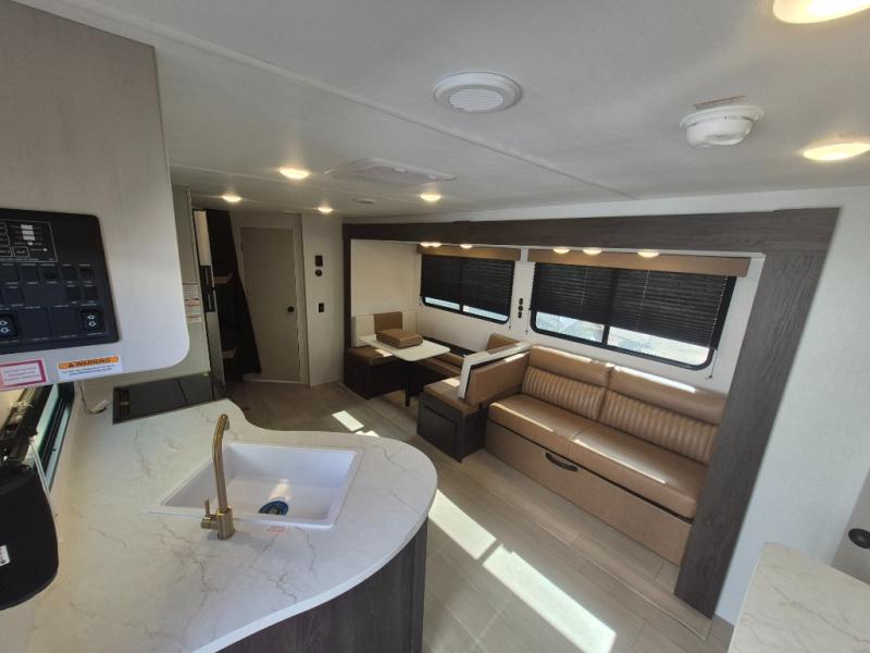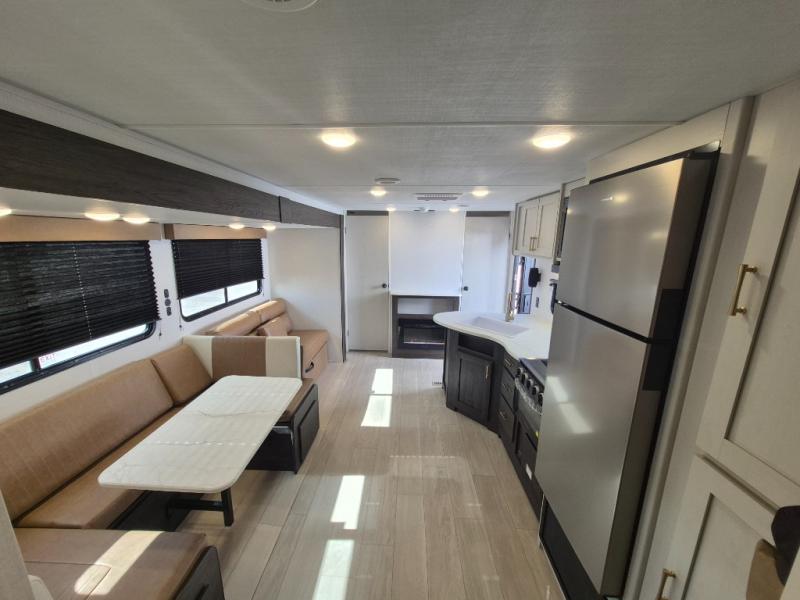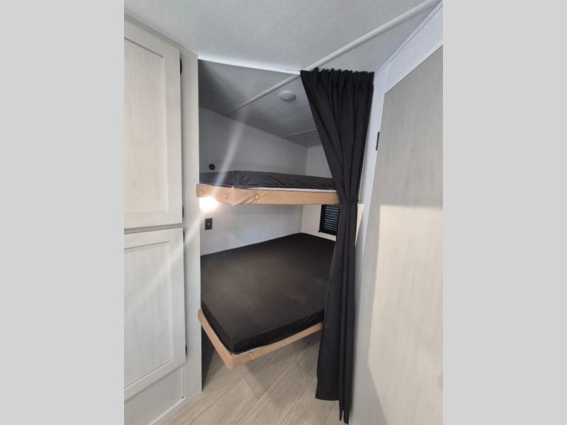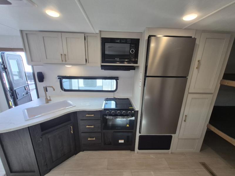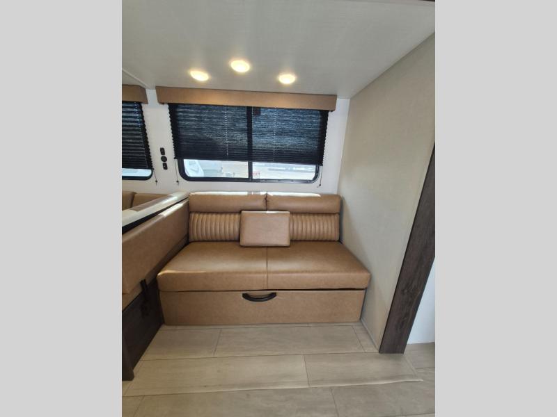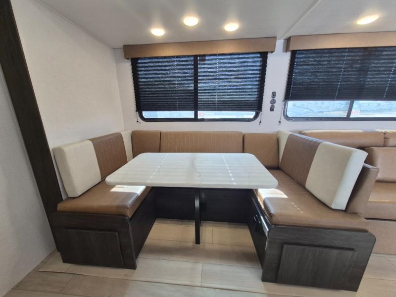If you've been searching for a travel trailer that can sleep more campers and give you more interior space, this is the one! There are double-size bunks with a ladder for the little ones, an RV queen bed in the front bedroom, plus a jackknife sofa and booth dinette that will double as seating and sleeping space. You will be able to make home cooked meals for your crew since there is a three burner range with a glass top and LED lit knobs, and the 10 cu. ft. 12V refrigerator can keep your food fresh. This model also includes a full bath with a 30" x 36" shower, a foot flush toilet, and a medicine cabinet to keep items organized.