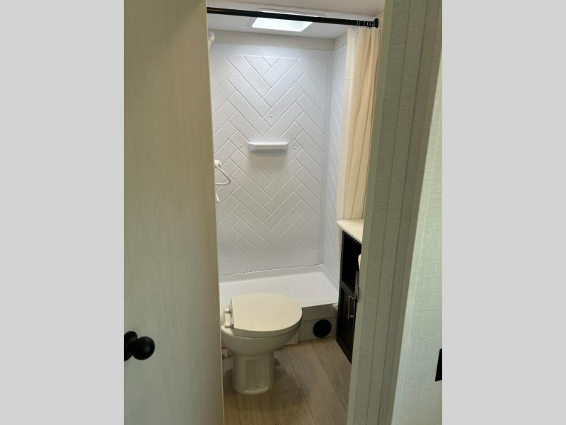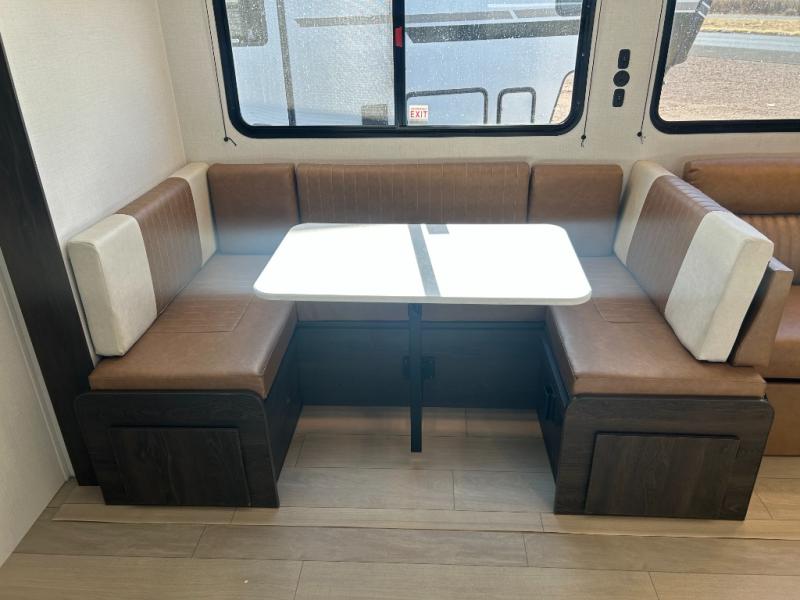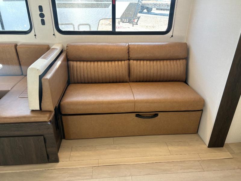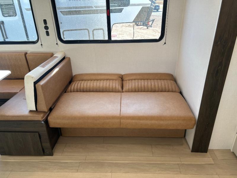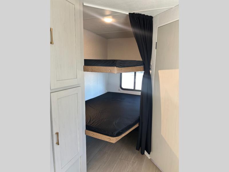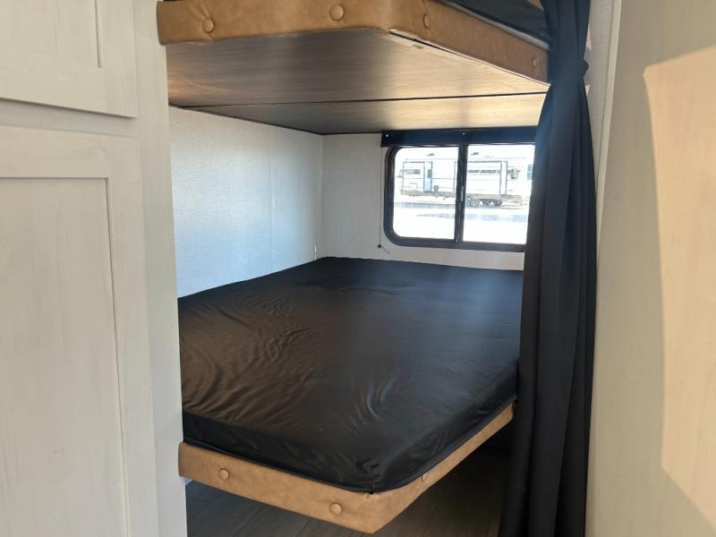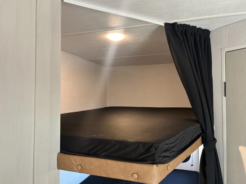 If you've been searching for a travel trailer that can sleep more campers and give you more interior space, this is the one! There are double-size bunks with a ladder for the little ones, an RV queen bed in the front bedroom, plus a jackknife sofa and booth dinette that will double as seating and sleeping space. You will be able to make home cooked meals for your crew since there is a three burner range with a glass top and LED lit knobs, and the 10 cu. ft. 12V refrigerator can keep your food fresh. This model also includes a full bath with a 30" x 36" shower, a foot flush toilet, and a medicine cabinet to keep items organized.