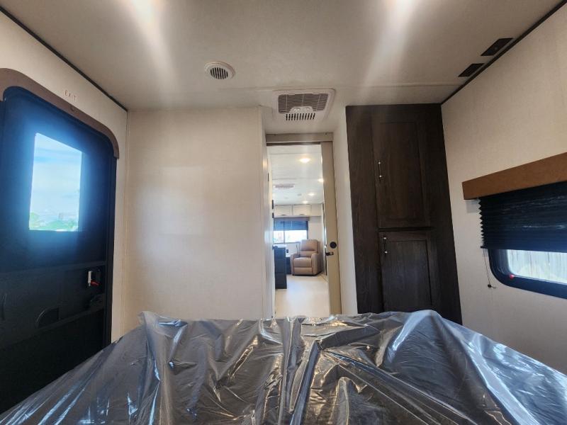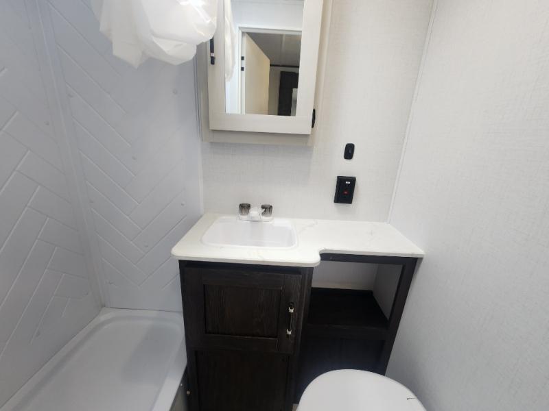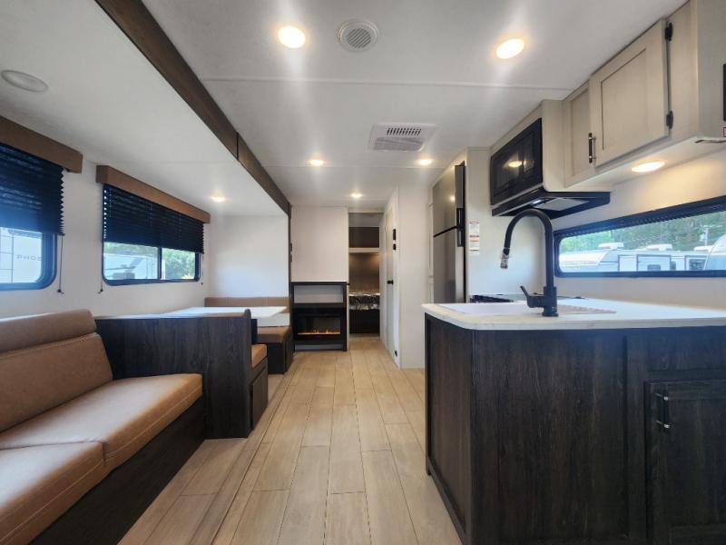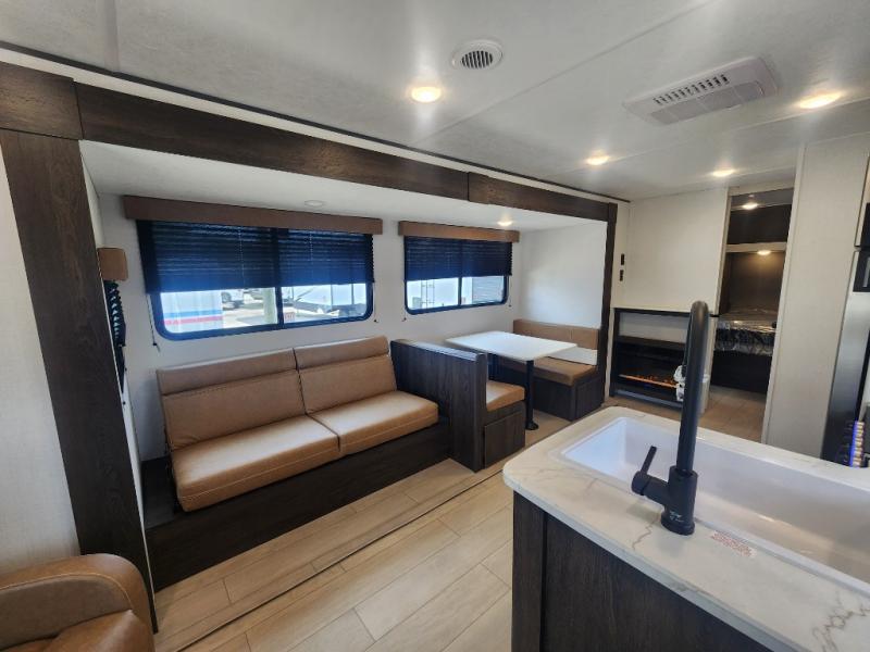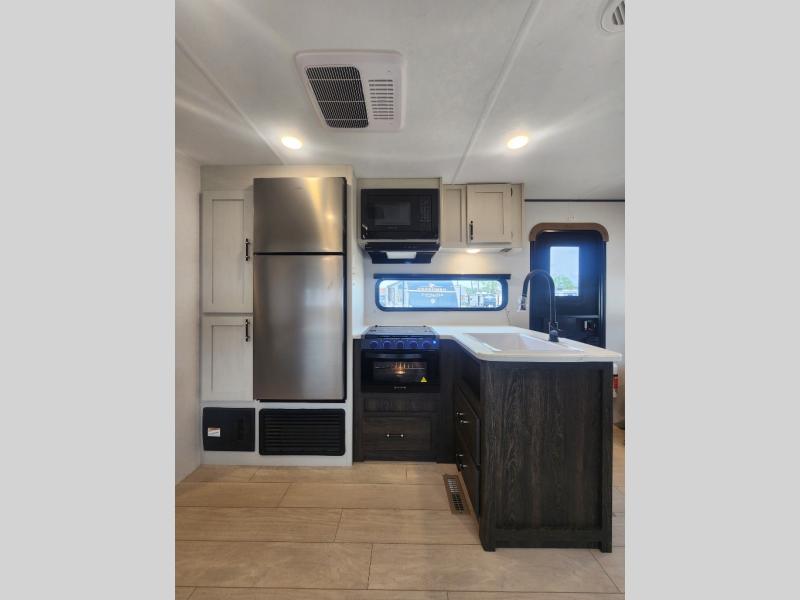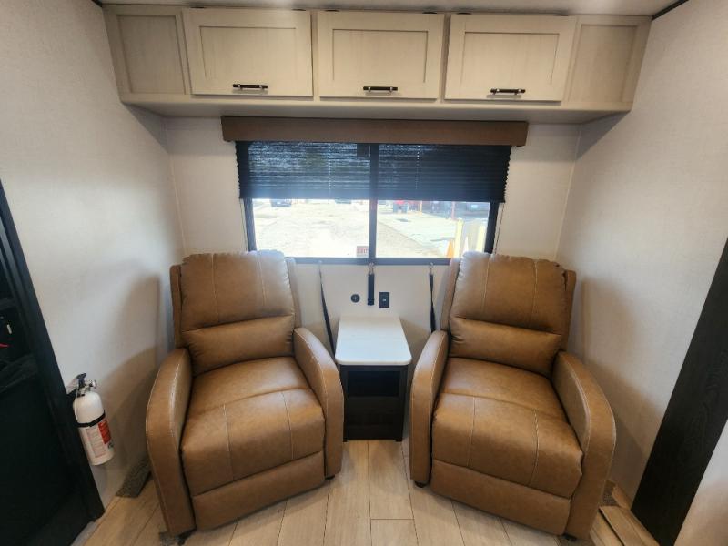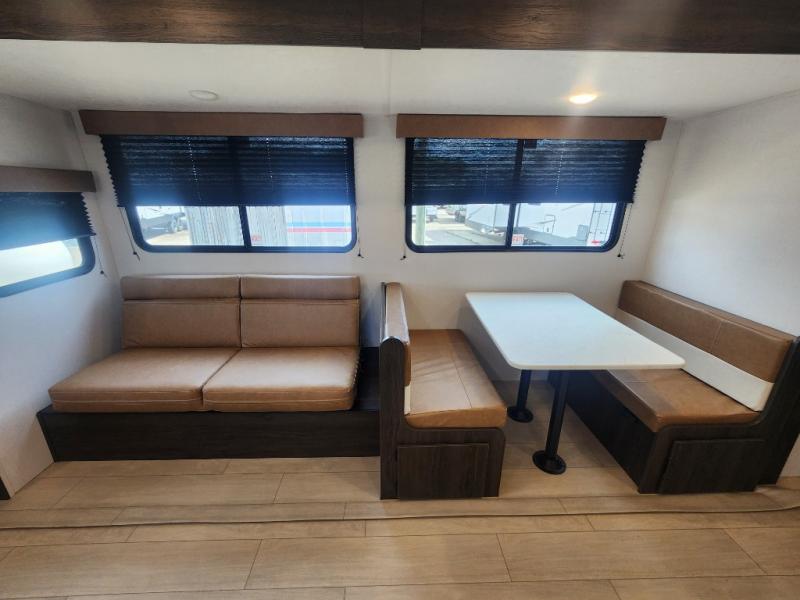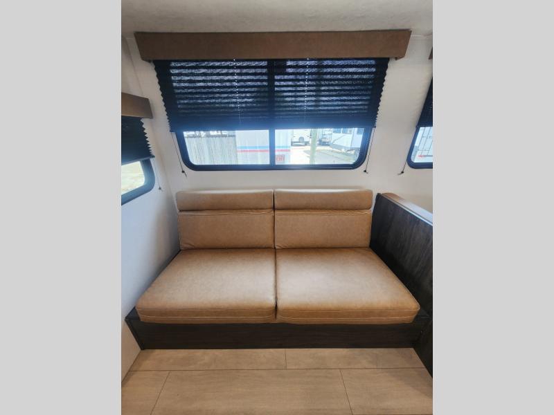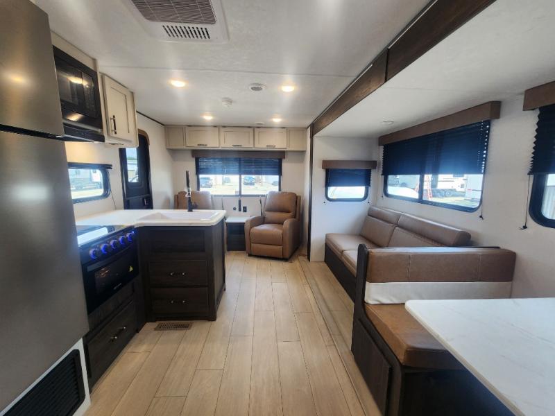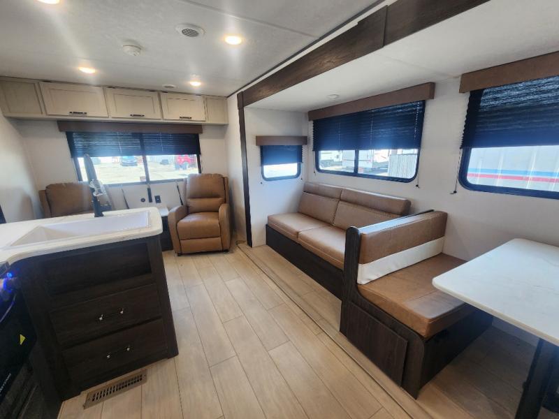 Comfort comes easy in this spacious travel trailer! There is a large slide out in the main living area that houses the booth dinette and jackknife sofa, and there are dual lounge chairs in the back for even more comfort! The chef of your group can whip up their best meals in the full kitchen, and the pantry will let them store snacks, dry goods and more! You'll appreciate having a full bath onboard so you don't have to leave the camper in the middle of the night, and having a front bedroom with a queen bed will make it feel more like home! One of the dual entry doors is even found here so you can slip out in the morning for an early jog!