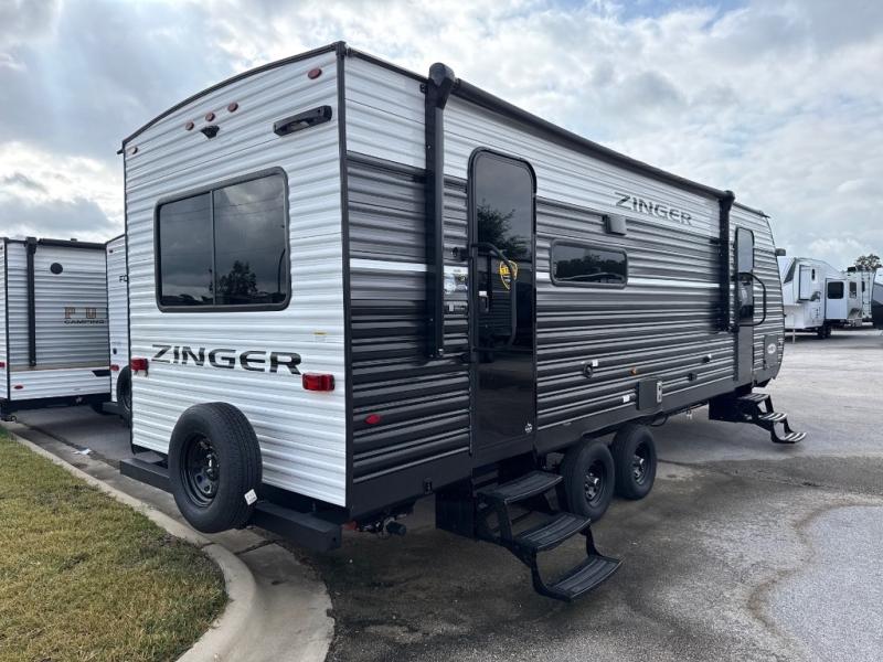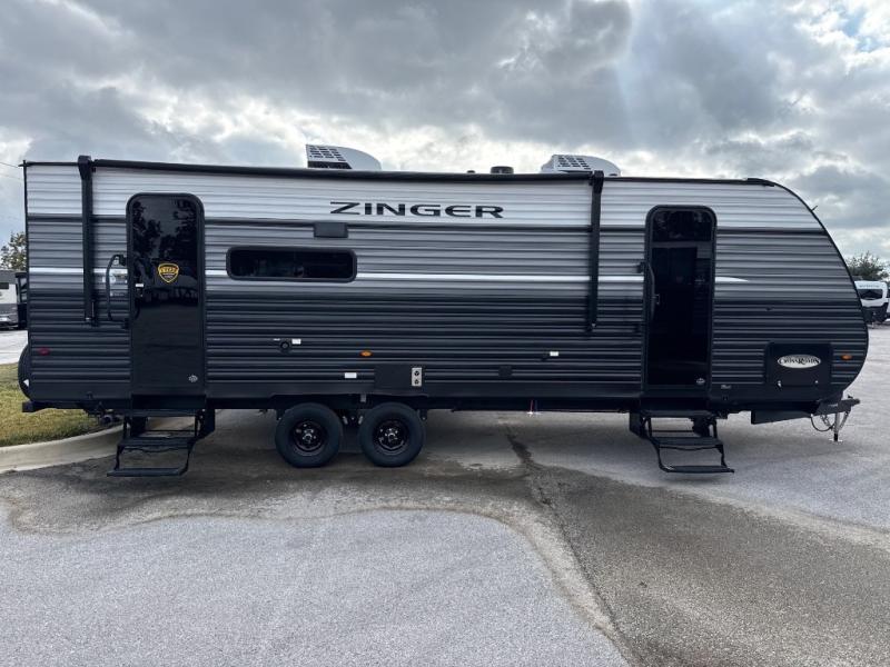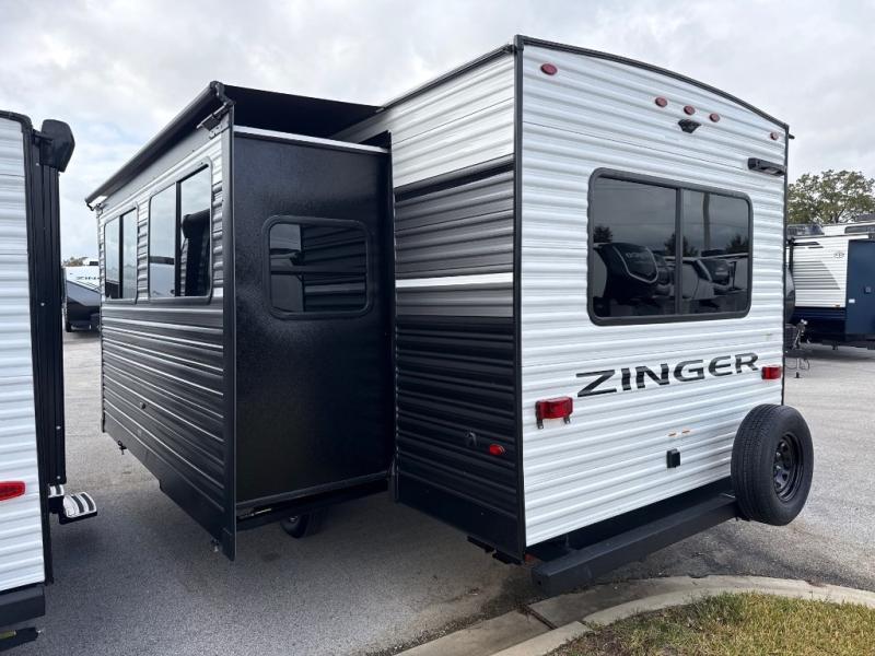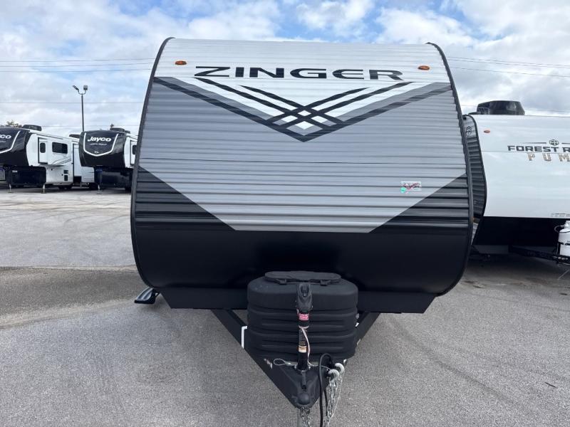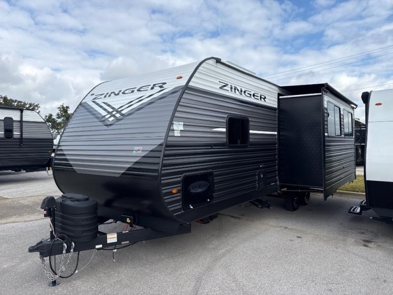 Lead your family to a great vacation getaway in any one of these CrossRoads RV Zinger travel trailers! They feature an aerodynamic front end, Keyed-Alike door locks, Secure Stance entry steps, and exterior speakers with LED accents. The interior of each model includes kitchen backsplash and pressed countertops, along with generous storage, designer valances, and LED lighting to keep your space well lit. You will also appreciate USB ports to keep your electronics charged up, and there is an AM/FM stereo with a Bluetooth soundbar to keep the party going!