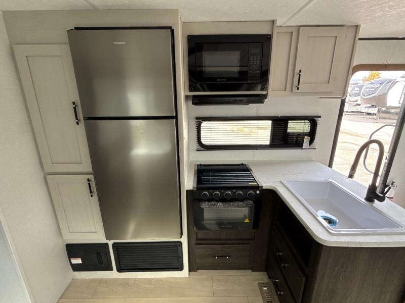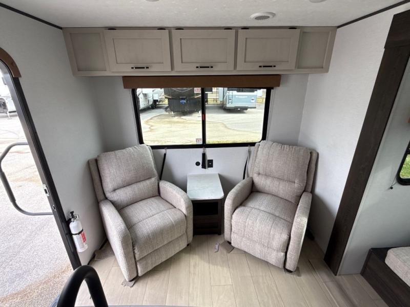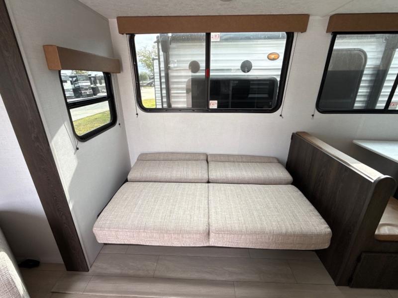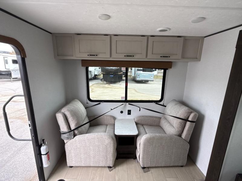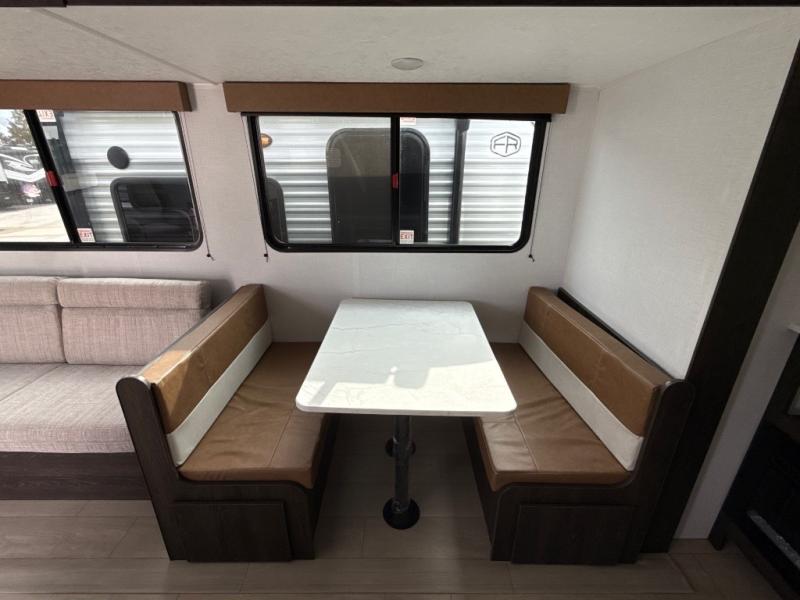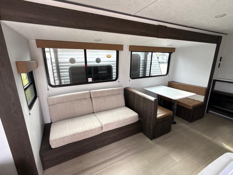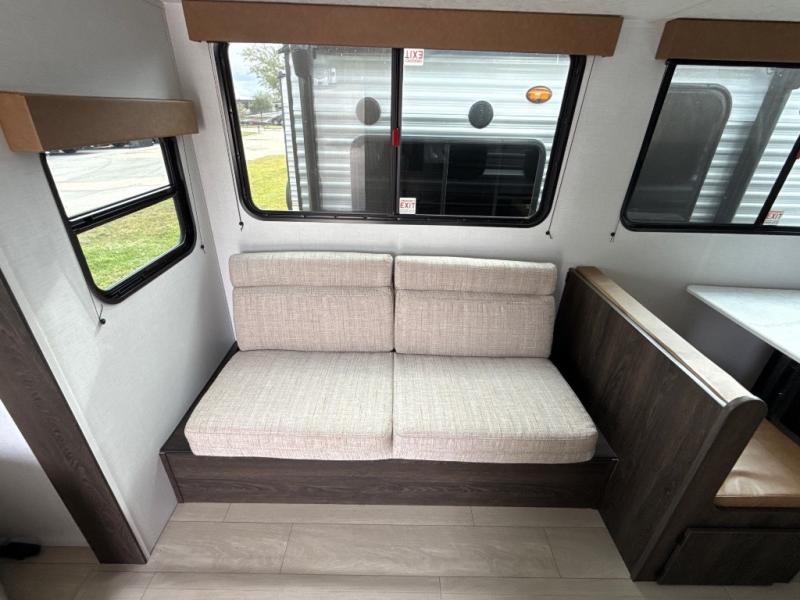 Comfort comes easy in this spacious travel trailer! There is a large slide out in the main living area that houses the booth dinette and jackknife sofa, and there are dual lounge chairs in the back for even more comfort! The chef of your group can whip up their best meals in the full kitchen, and the pantry will let them store snacks, dry goods and more! You'll appreciate having a full bath onboard so you don't have to leave the camper in the middle of the night, and having a front bedroom with a queen bed will make it feel more like home! One of the dual entry doors is even found here so you can slip out in the morning for an early jog!